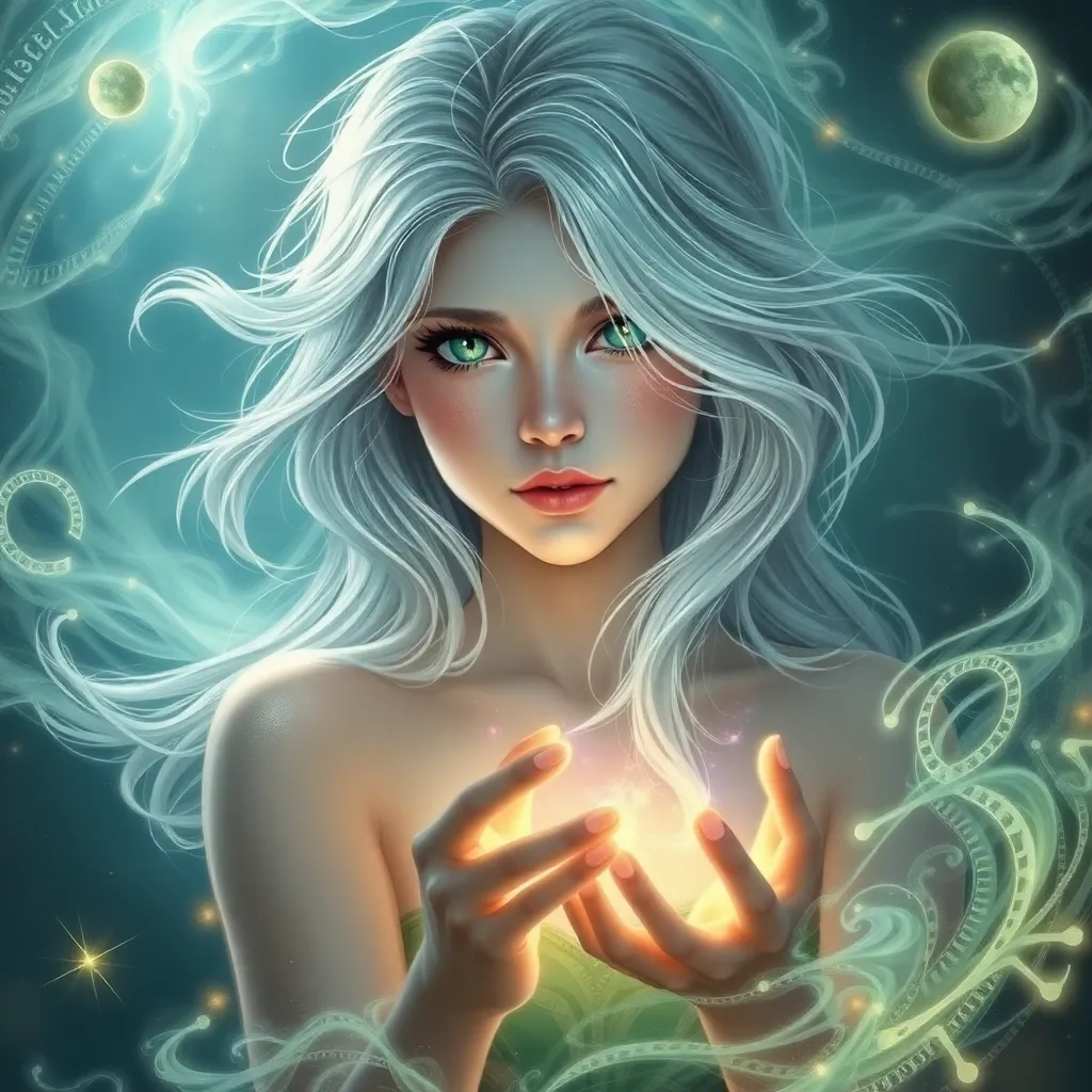 Create an ethereal, mystical scene for a fantasy-inspired OnlyFans page. Depict a young woman with flowing silver hair and piercing emerald eyes, surrounded by a swirling vortex of iridescent mist and ancient, glowing runes. Incorporate subtle hints of celestial bodies and a hint of mystical energy emanating from her hands.