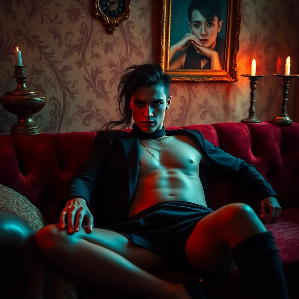 Create a sultry, high-fashion photo shoot for a mysterious, androgynous model. Capture them lounging on a velvet couch, surrounded by lavish fabrics and antique trinkets. Incorporate bold, neon lighting and subtle, shimmering effects to convey an air of sophistication and mystique. Generate an image that exudes luxury and allure.