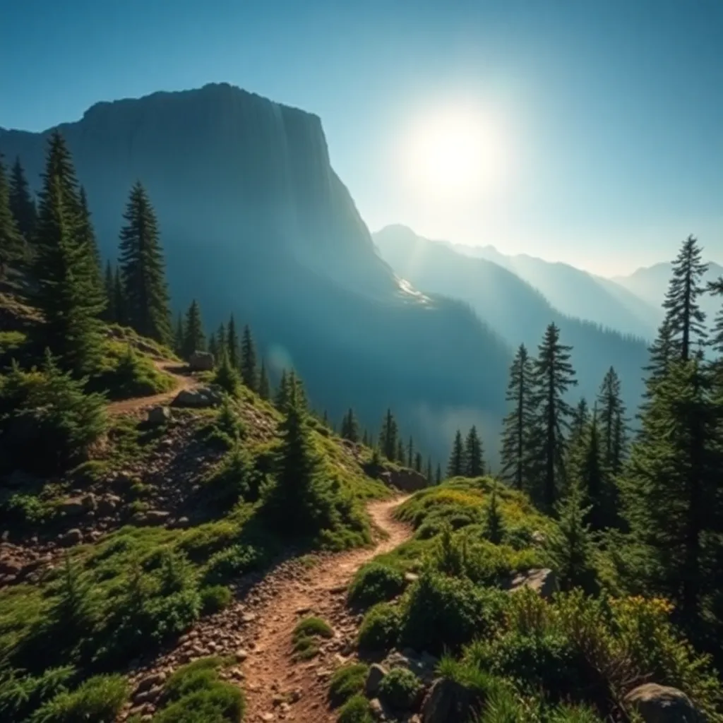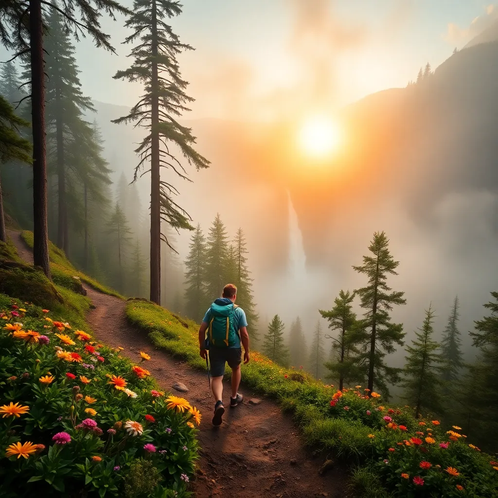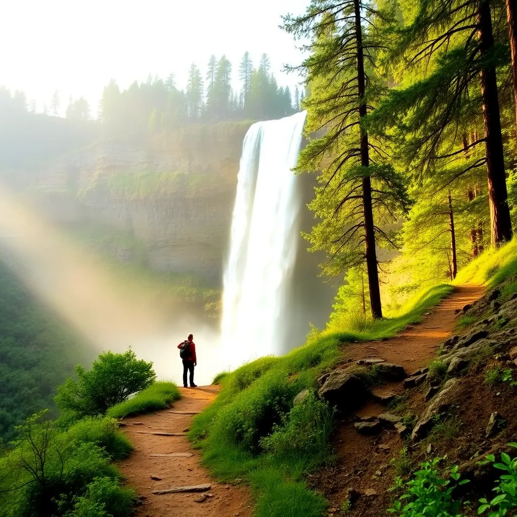Imagine a breathtaking mountain hike at sunrise, with a winding trail leading to a secluded waterfall. The misty veil of the waterfall rises into the crisp morning air, surrounded by lush greenery and towering trees. Capture the serenity and tranquility of this idyllic outdoor adventure in a stunning AI-generated image.