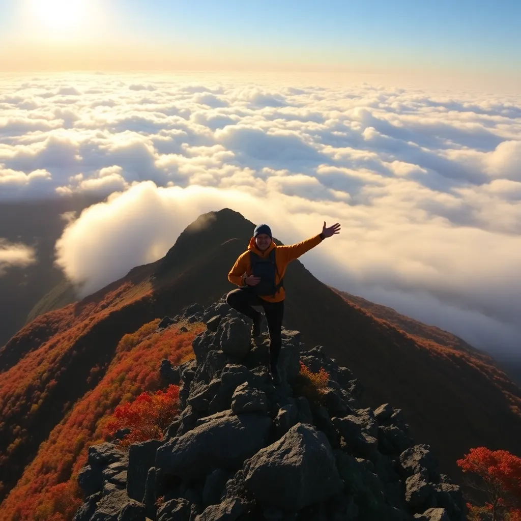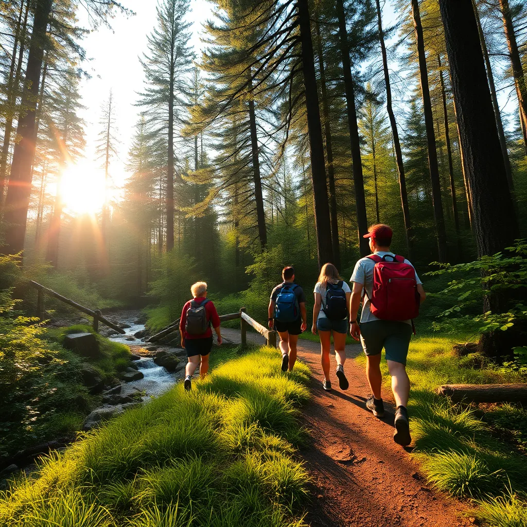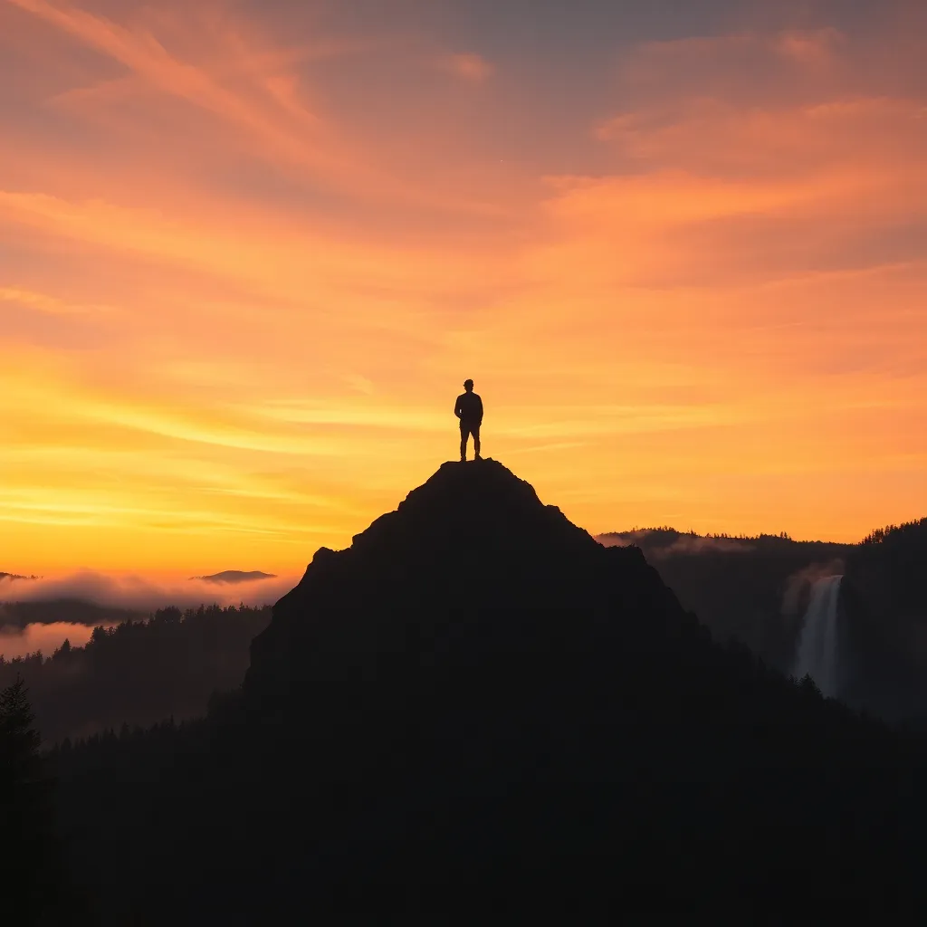 Imagine a breathtaking mountain hike at sunrise, with a winding trail leading to a secluded waterfall. The misty veil of the waterfall rises into the crisp morning air, surrounded by lush greenery and towering trees. Capture the serenity and tranquility of this idyllic outdoor adventure in a stunning AI-generated image.
