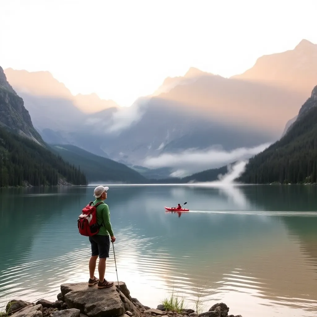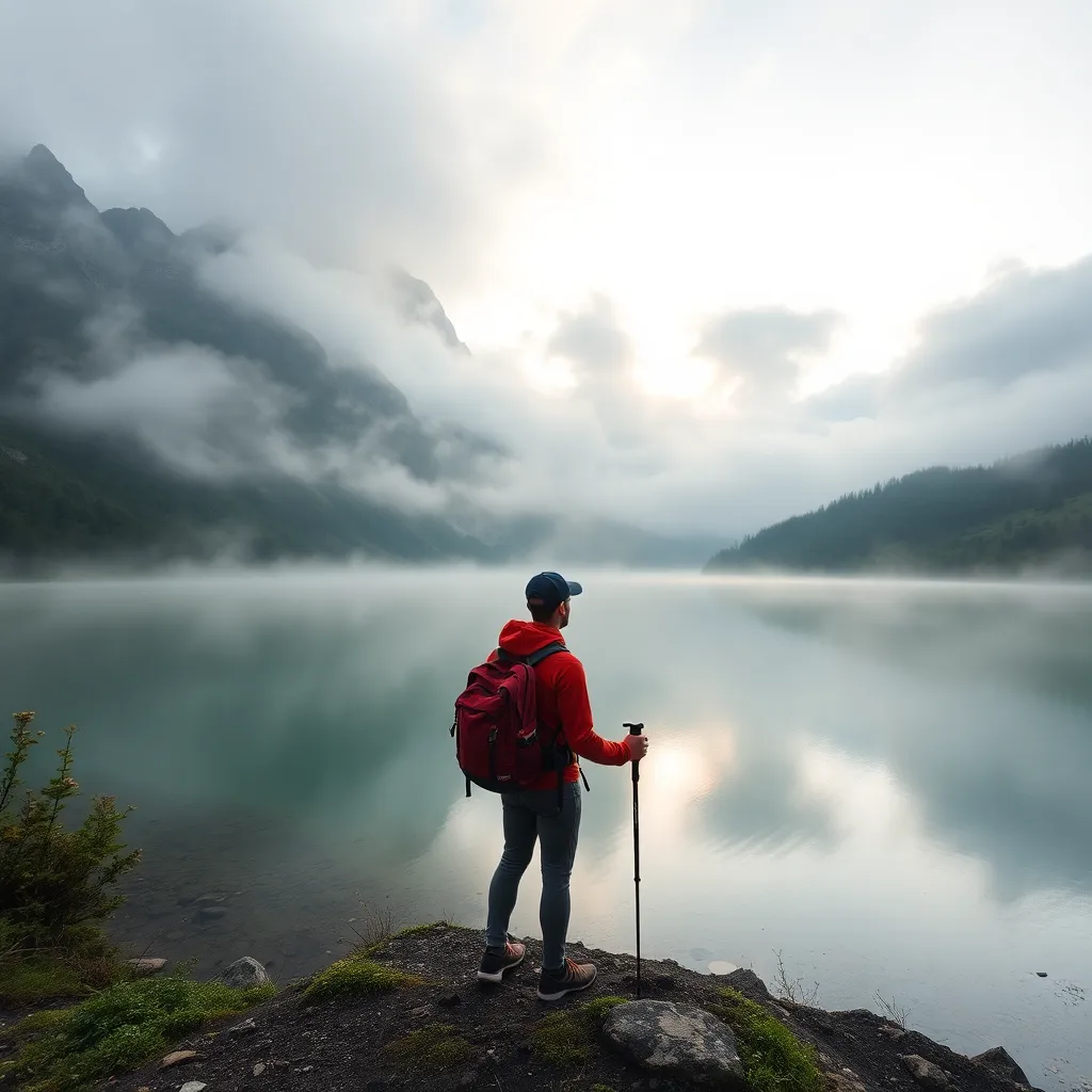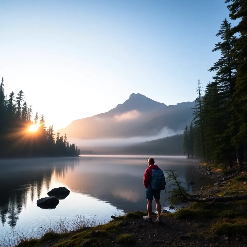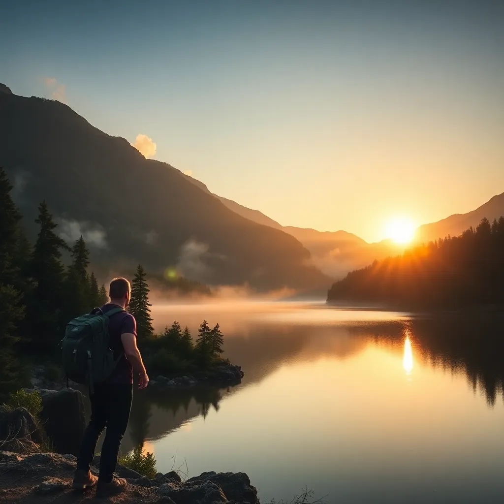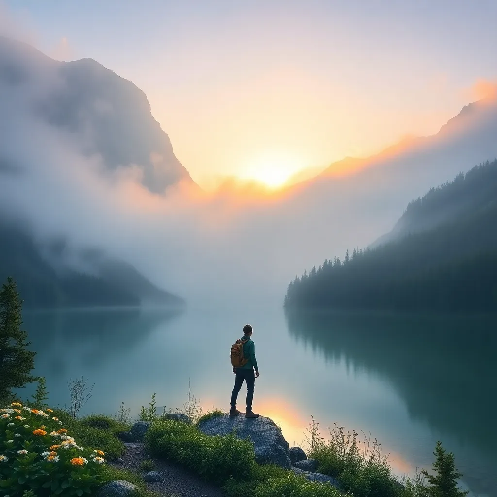 Capture the thrill of a misty morning in the mountains. A lone hiker stands at the edge of a serene lake, surrounded by towering peaks and lush green forests. The sun is slowly rising, casting a warm golden light on the tranquil scene. The air is crisp and clean, filled with the sweet scent of blooming wildflowers.