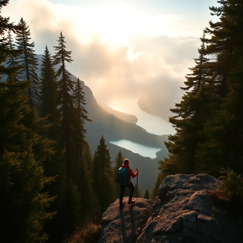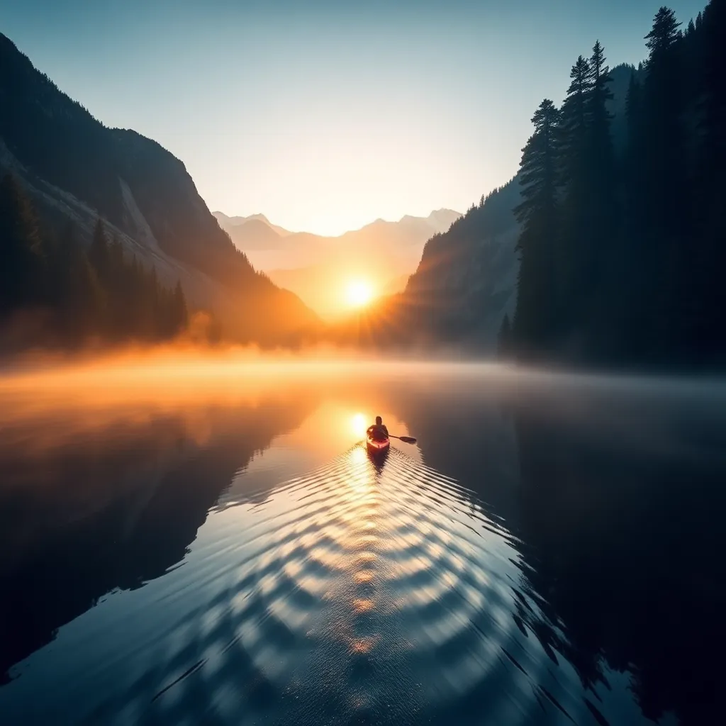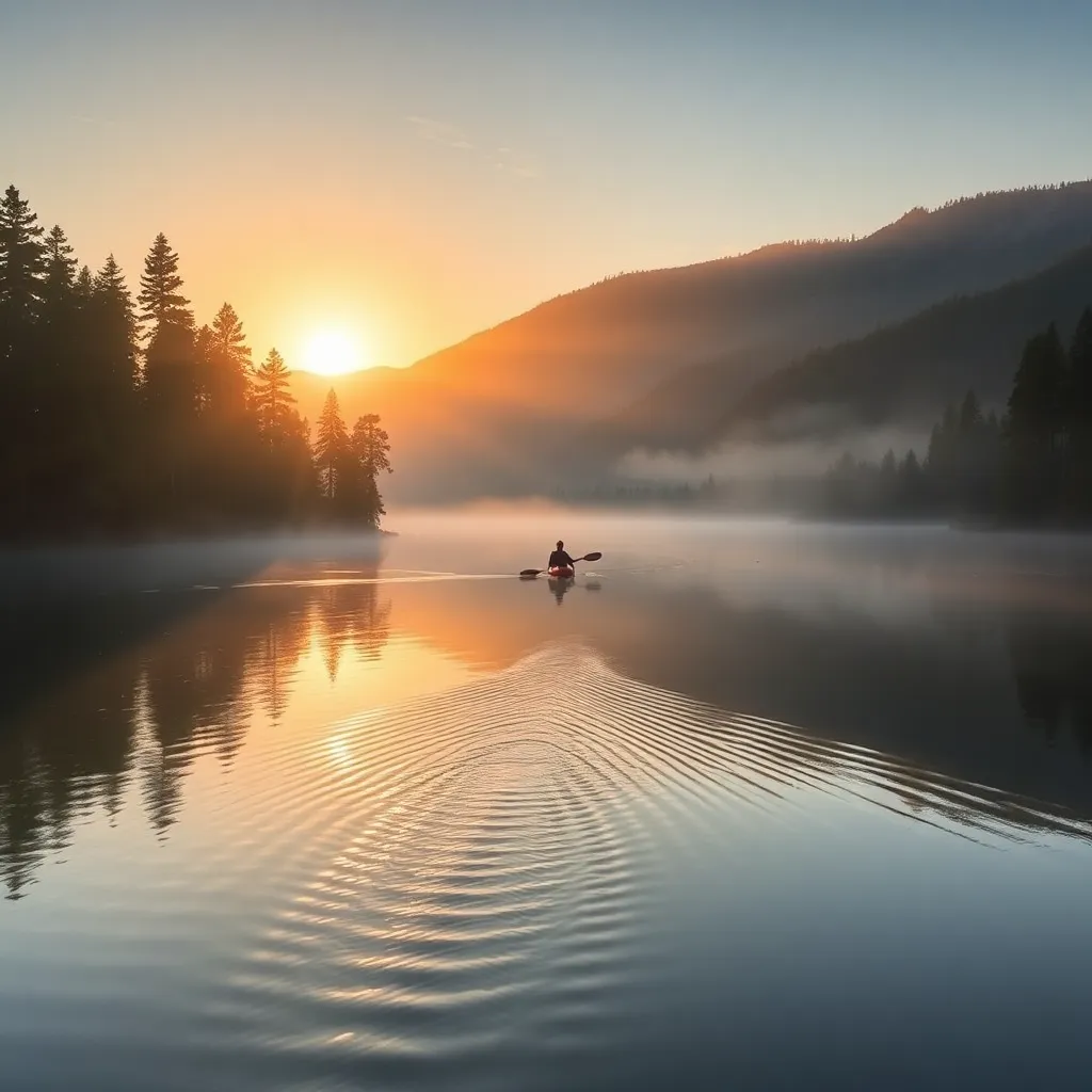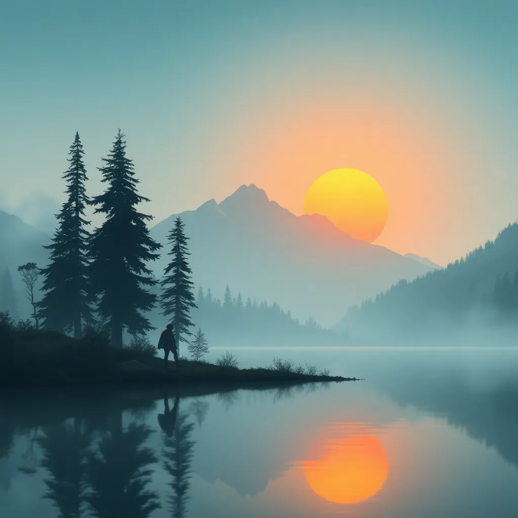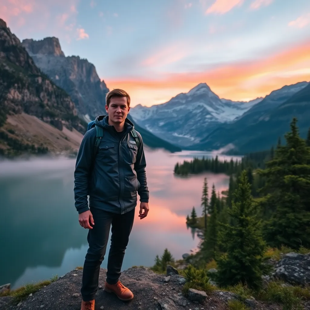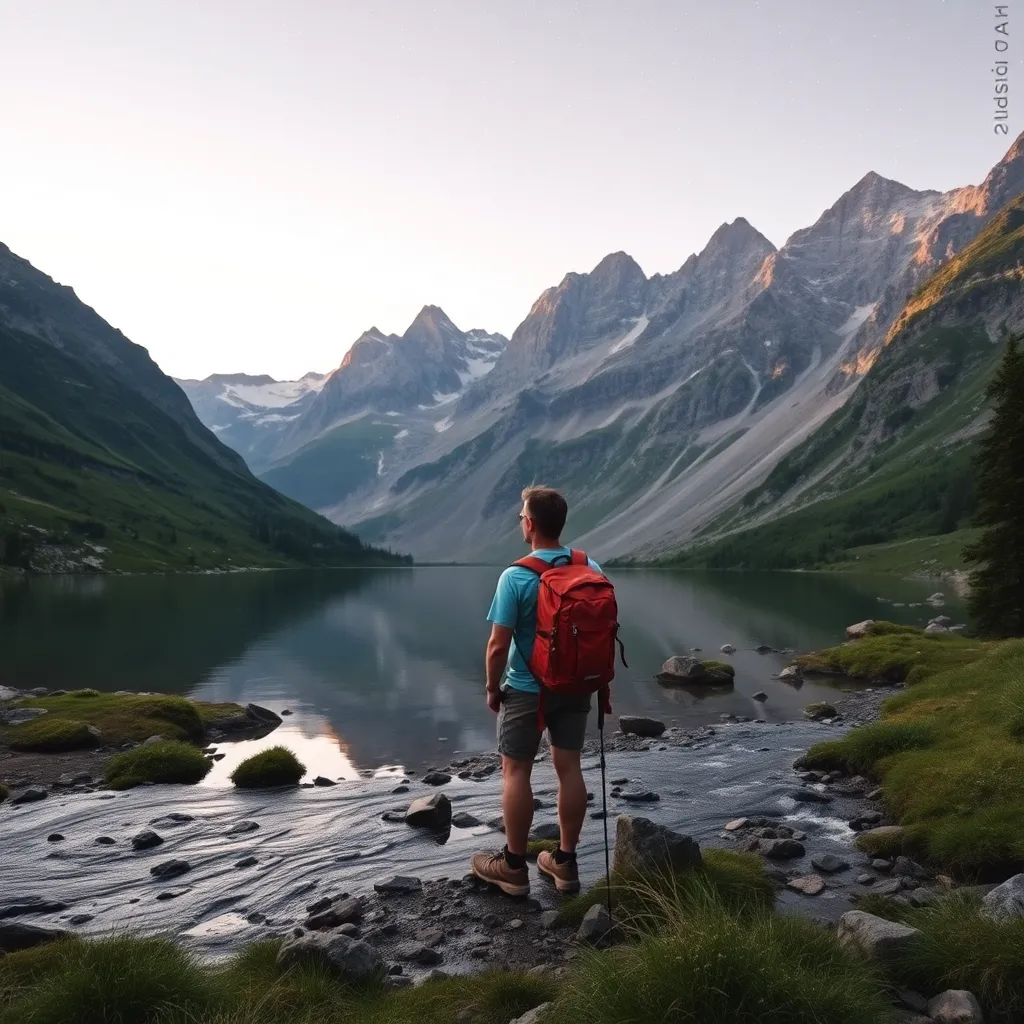 Capture the thrill of a misty morning in the mountains. A lone hiker stands at the edge of a serene lake, surrounded by towering peaks and lush green forests. The sun is slowly rising, casting a warm golden light on the tranquil scene. The air is crisp and clean, filled with the sweet scent of blooming wildflowers.