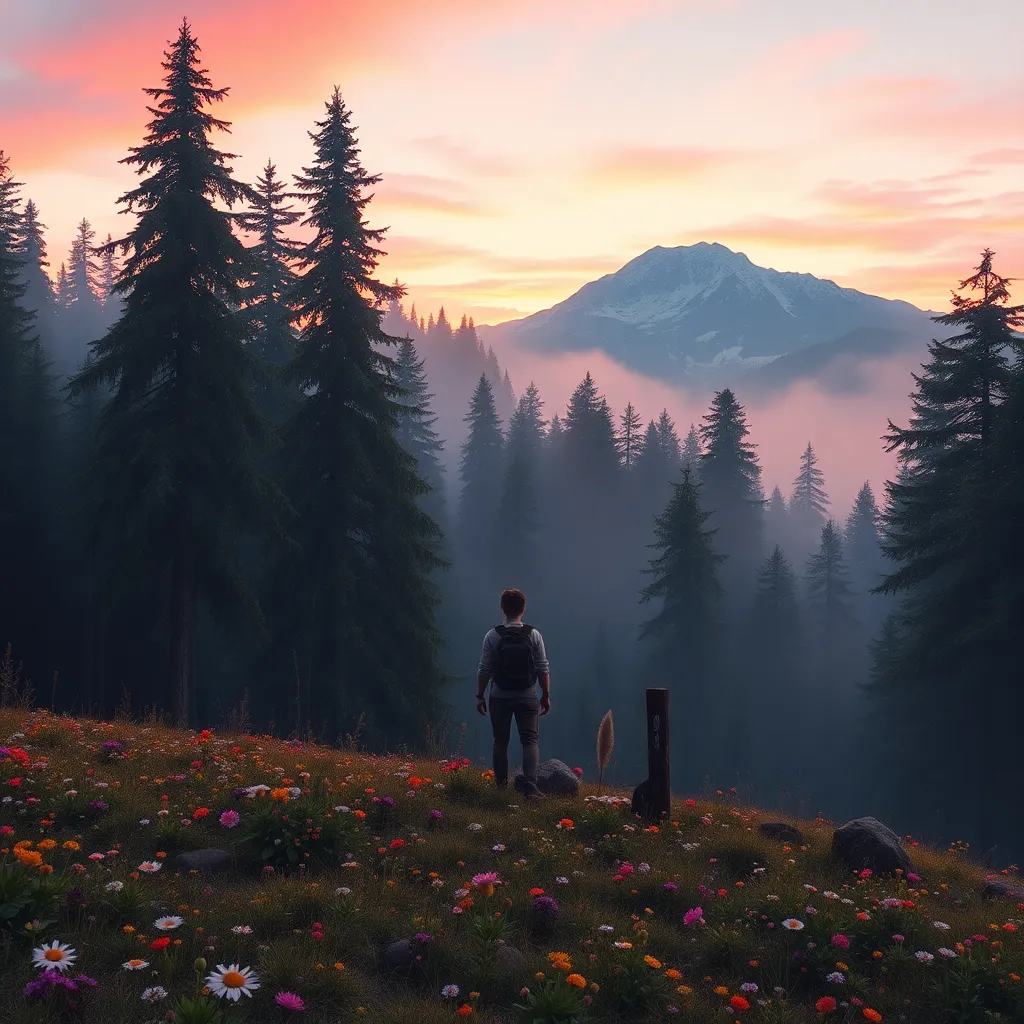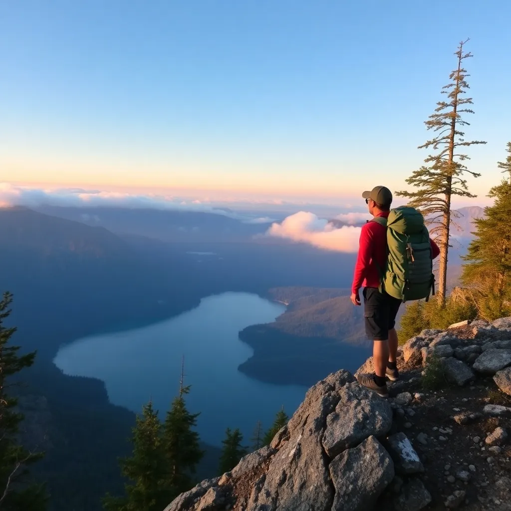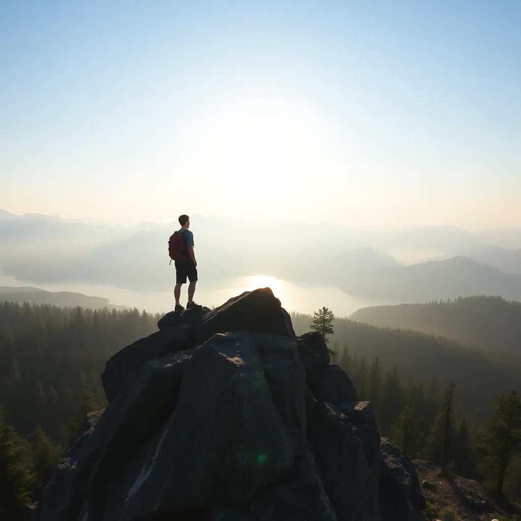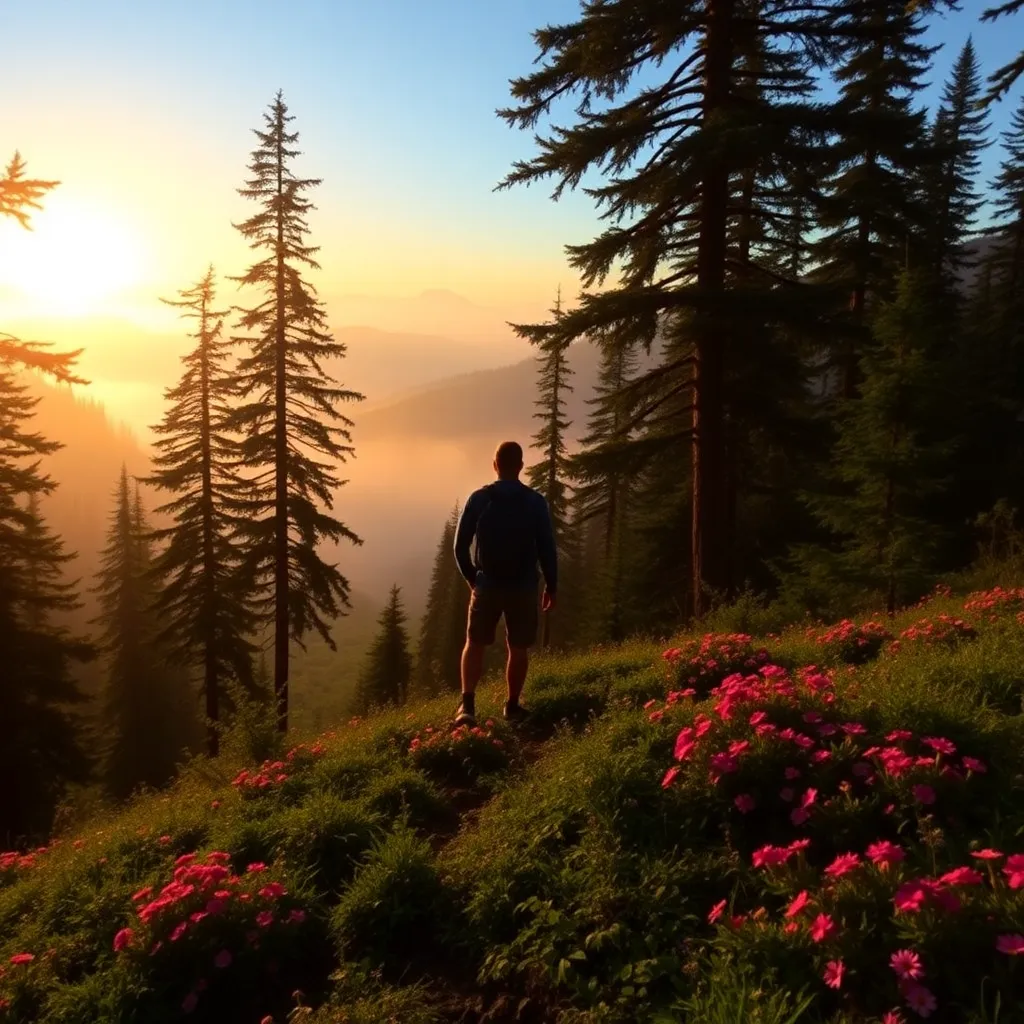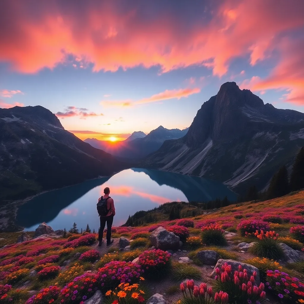 Capture the thrill of a misty morning in the mountains. A lone hiker stands at the edge of a serene lake, surrounded by towering peaks and lush green forests. The sun is slowly rising, casting a warm golden light on the tranquil scene. The air is crisp and clean, filled with the sweet scent of blooming wildflowers.
