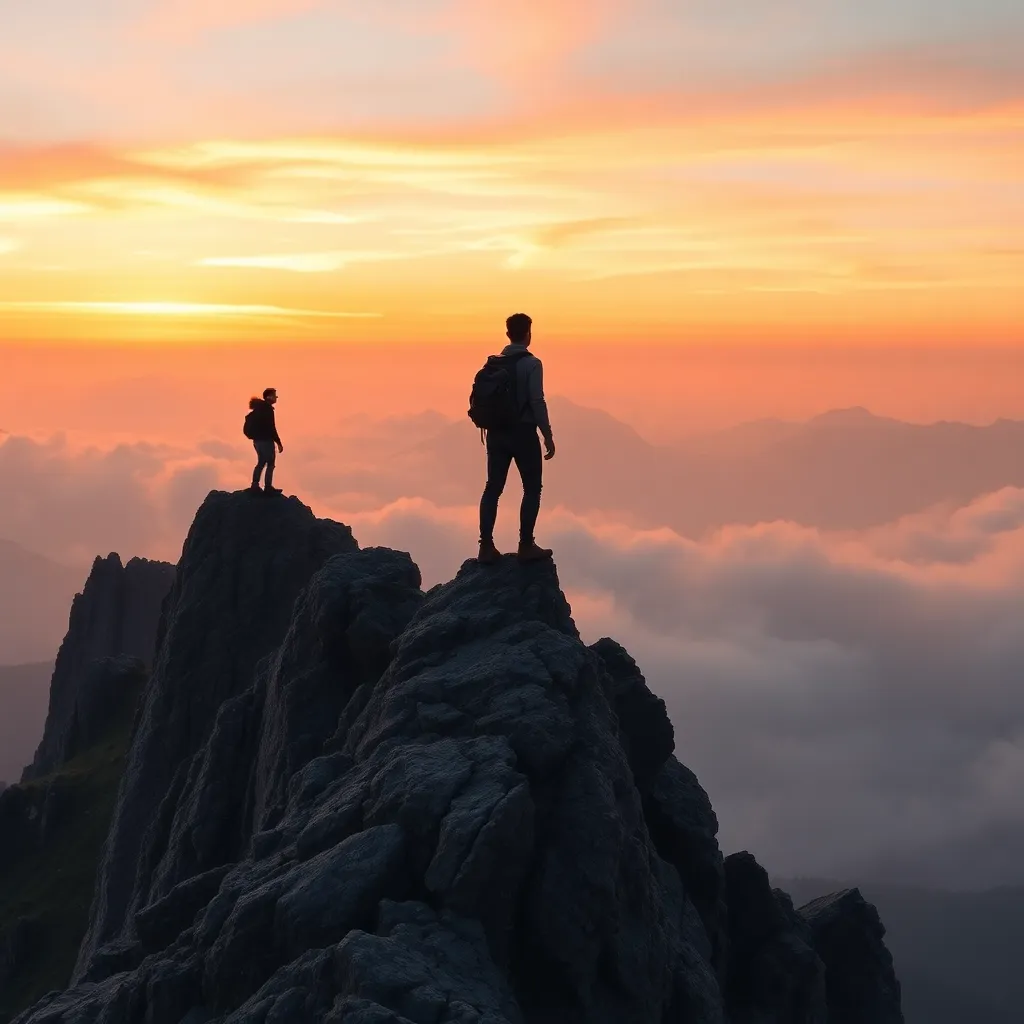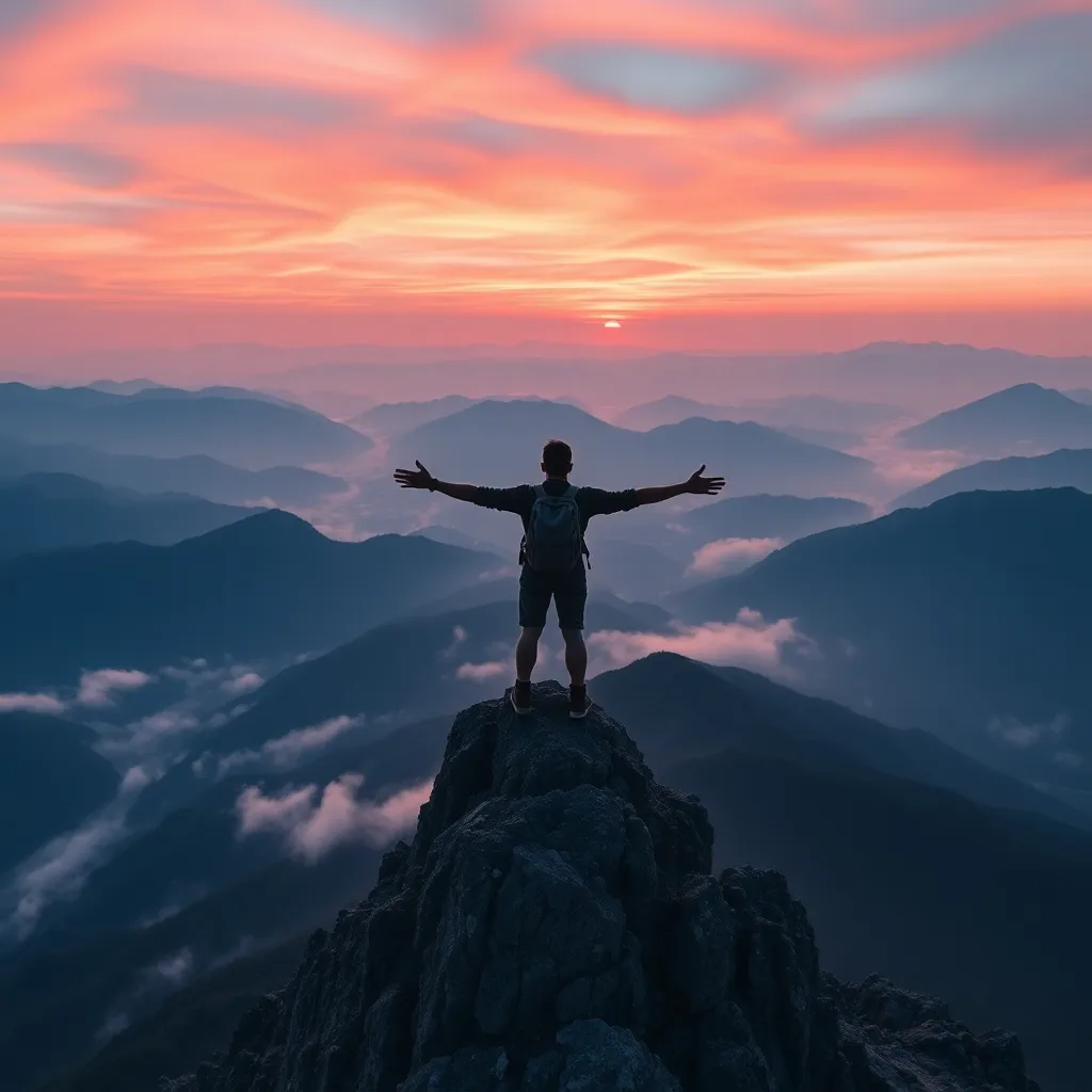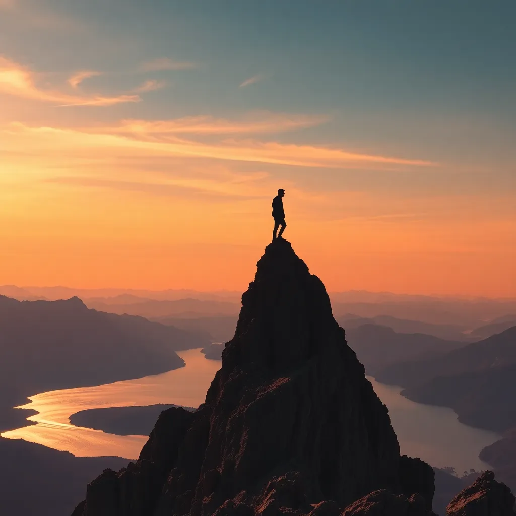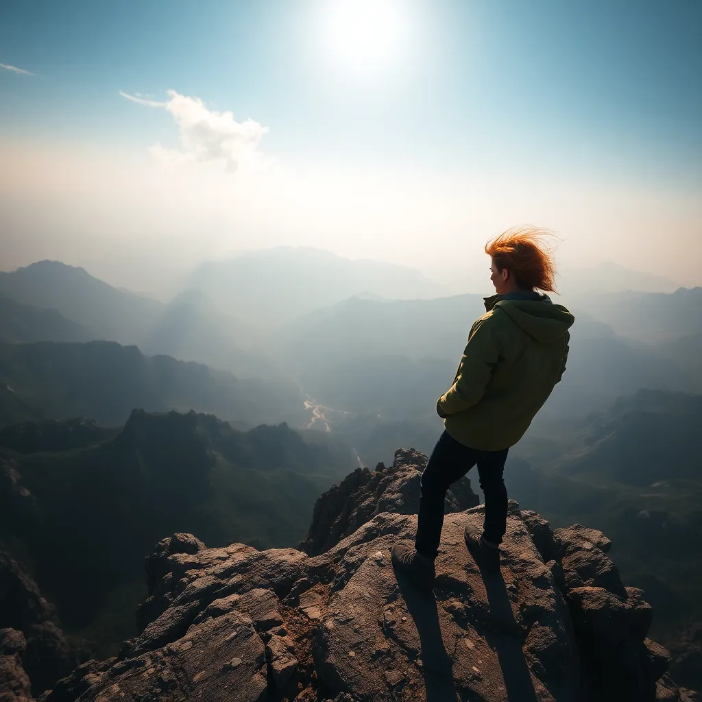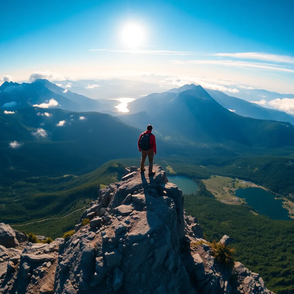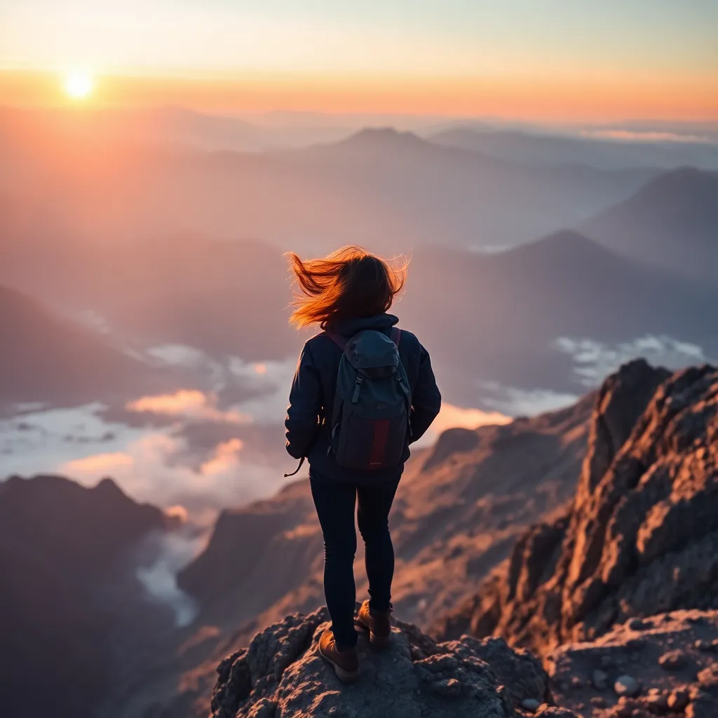 Capture the thrill of a misty morning in the mountains. A lone hiker stands at the edge of a serene lake, surrounded by towering peaks and lush green forests. The sun is slowly rising, casting a warm golden light on the tranquil scene. The air is crisp and clean, filled with the sweet scent of blooming wildflowers.