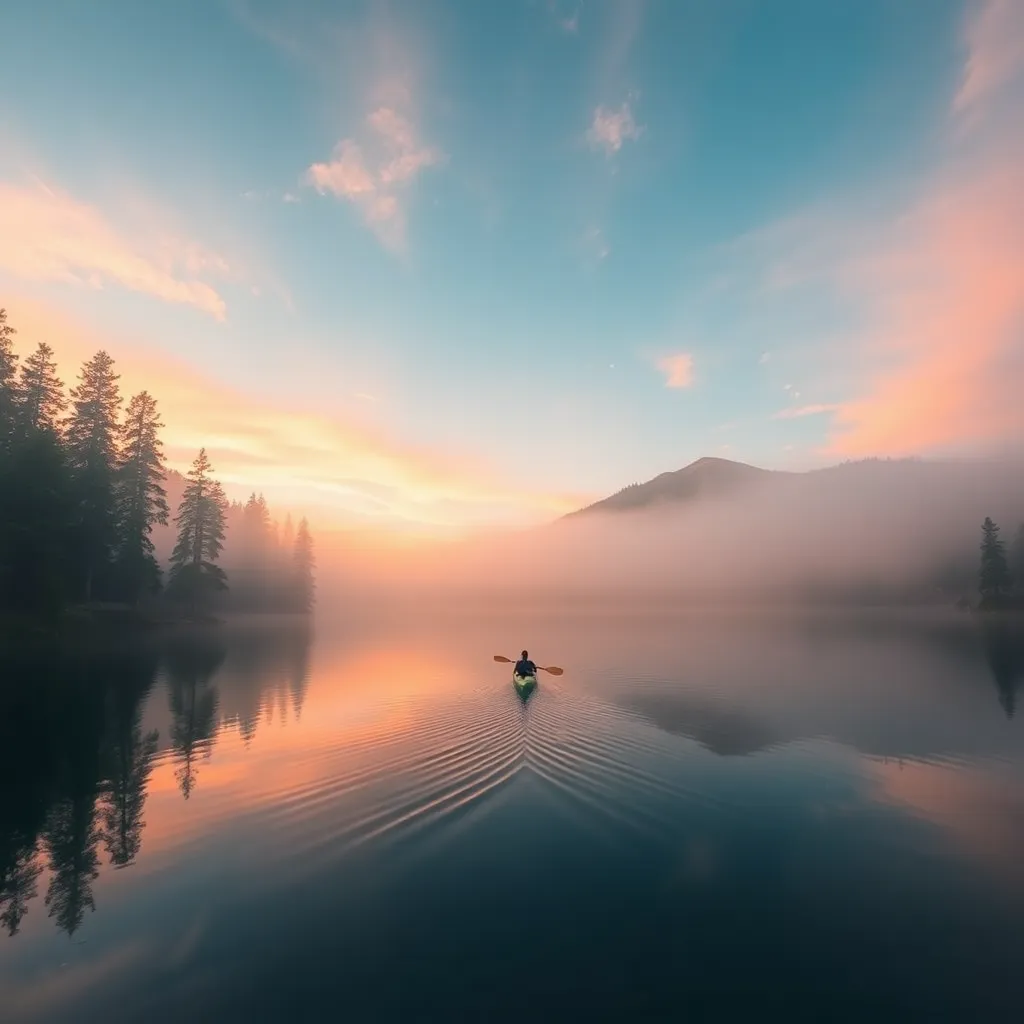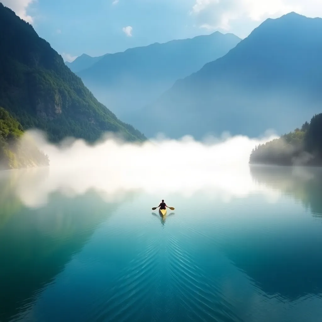 Imagine a serene mountain lake surrounded by lush greenery and towering peaks. A lone canoe glides across the calm waters, leaving a trail of ripples in its wake. A misty veil rises from the lake's surface, casting a mystical aura over the tranquil scene. What does this peaceful landscape look like?
