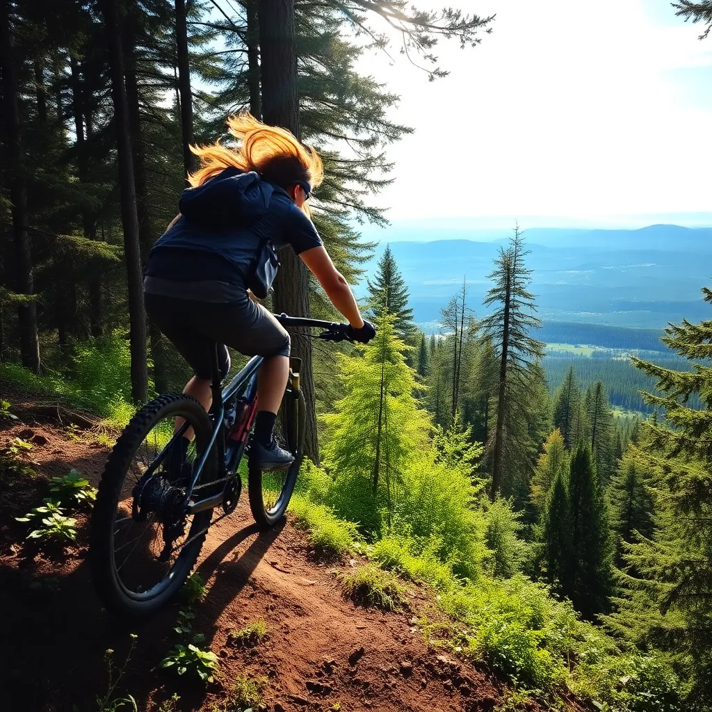 Capture the thrill of a mountain bike ride through a dense forest, with sunlight filtering through the trees, casting dappled shadows on the trail. The rider, clad in rugged gear, pedals up a steep incline, the wind whipping through their hair as they crest the summit, revealing a breathtaking vista.