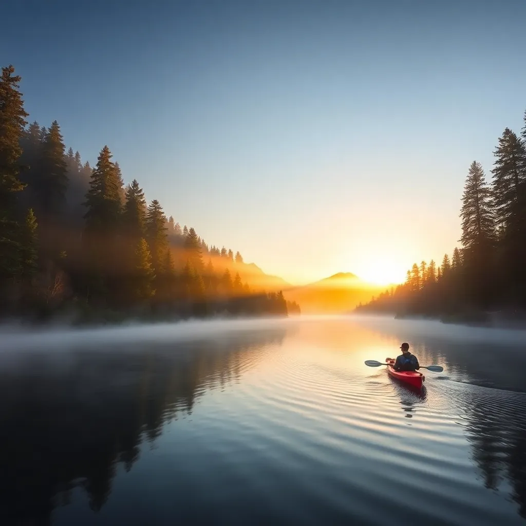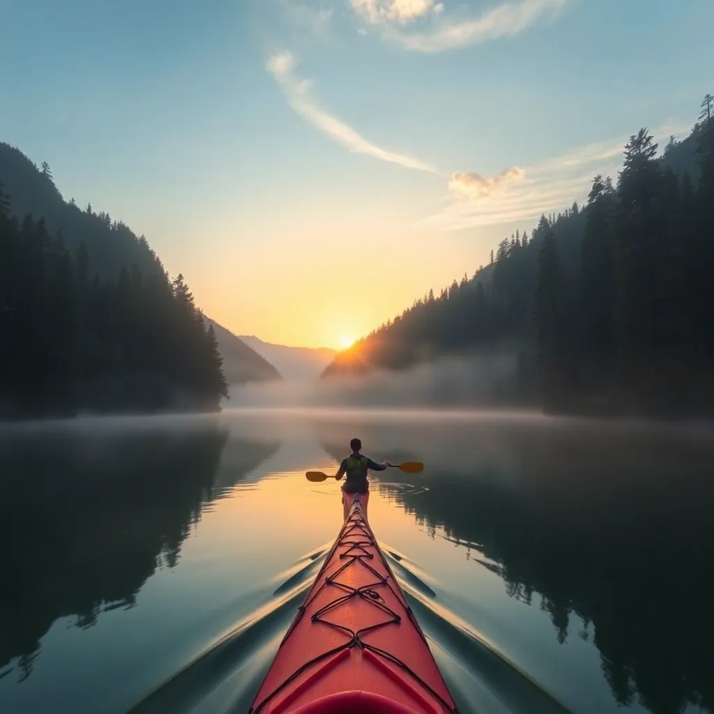 Imagine a serene mountain lake surrounded by towering peaks, with a solo hiker standing at the water's edge, backpack on and paddle in hand, ready to embark on a tranquil kayaking journey as the warm sunlight casts a golden glow on the surrounding wilderness, inviting the viewer to join the adventure.
