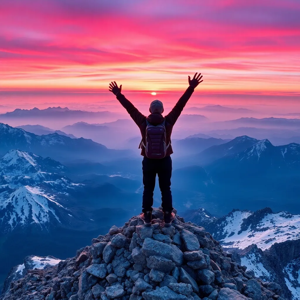 Capture the thrill of a sunrise hike in the Rocky Mountains. A solo adventurer stands at the edge of a misty lake, surrounded by towering peaks and lush greenery. The air is crisp and the sky is ablaze with hues of orange and pink. The camera's gaze is set on the adventurer's determined expression as they prepare to take the first step into the unknown.
