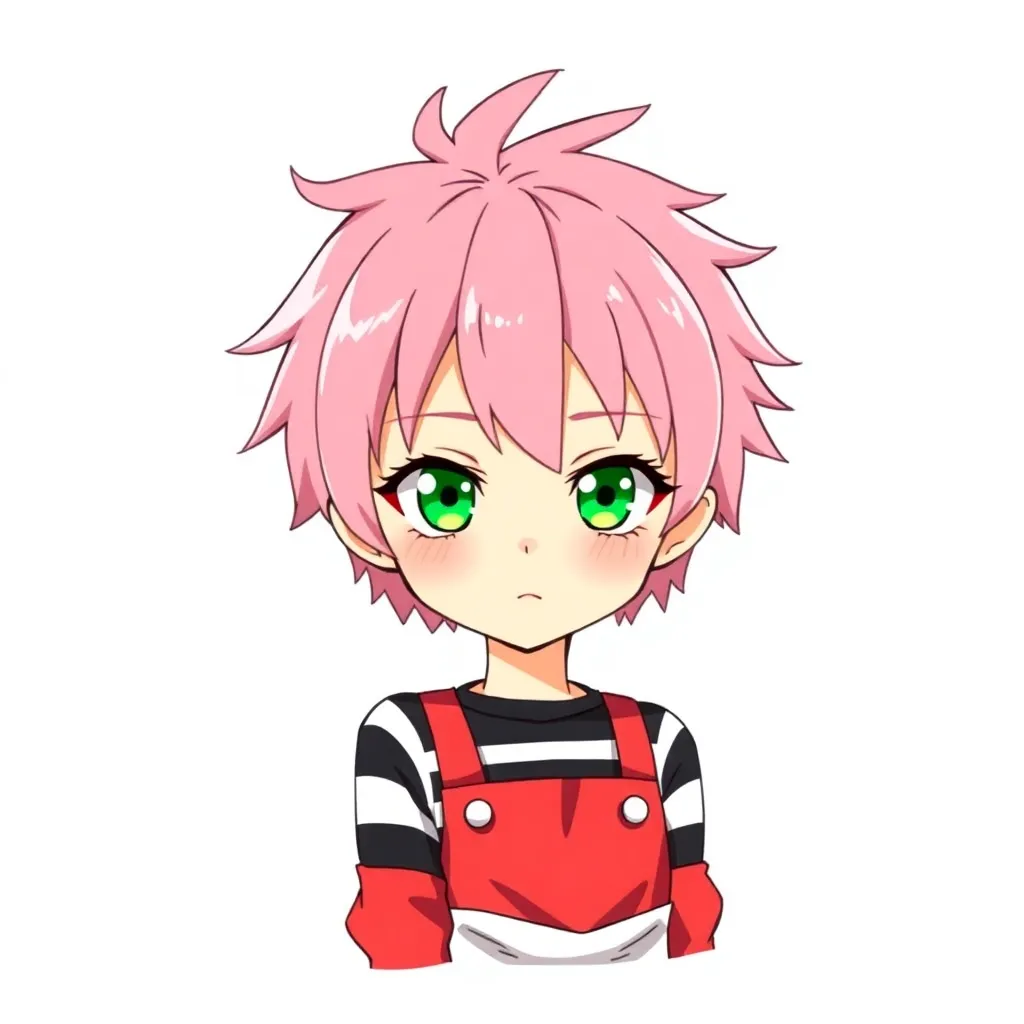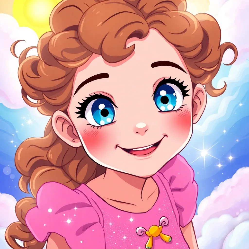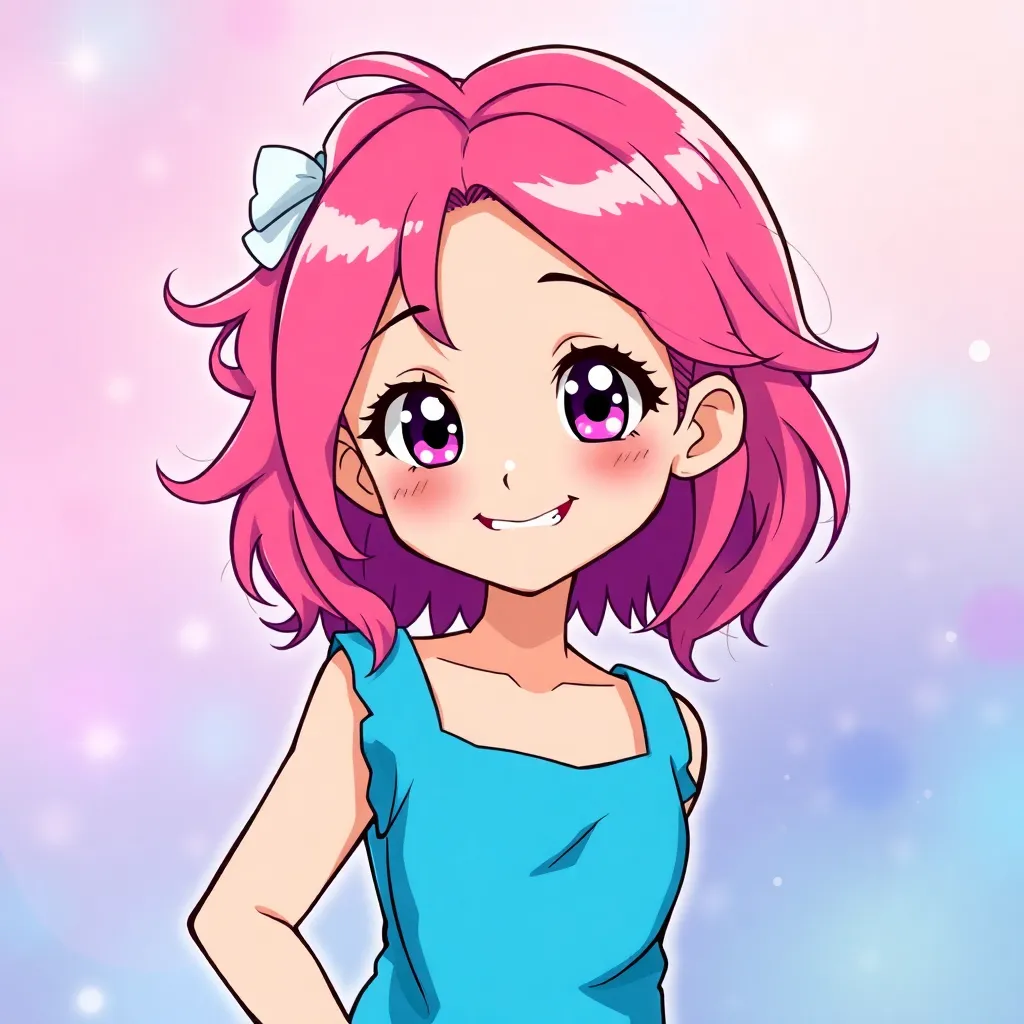 Convert a cute, smiling girl with bright pink hair and a blue dress into a vibrant anime character with exaggerated features and vibrant colors. Add a whimsical background with sparkles and stars. Style her hair in loose, flowing waves and give her big, shining eyes. Make her pose confidently with one hand on her hip.
