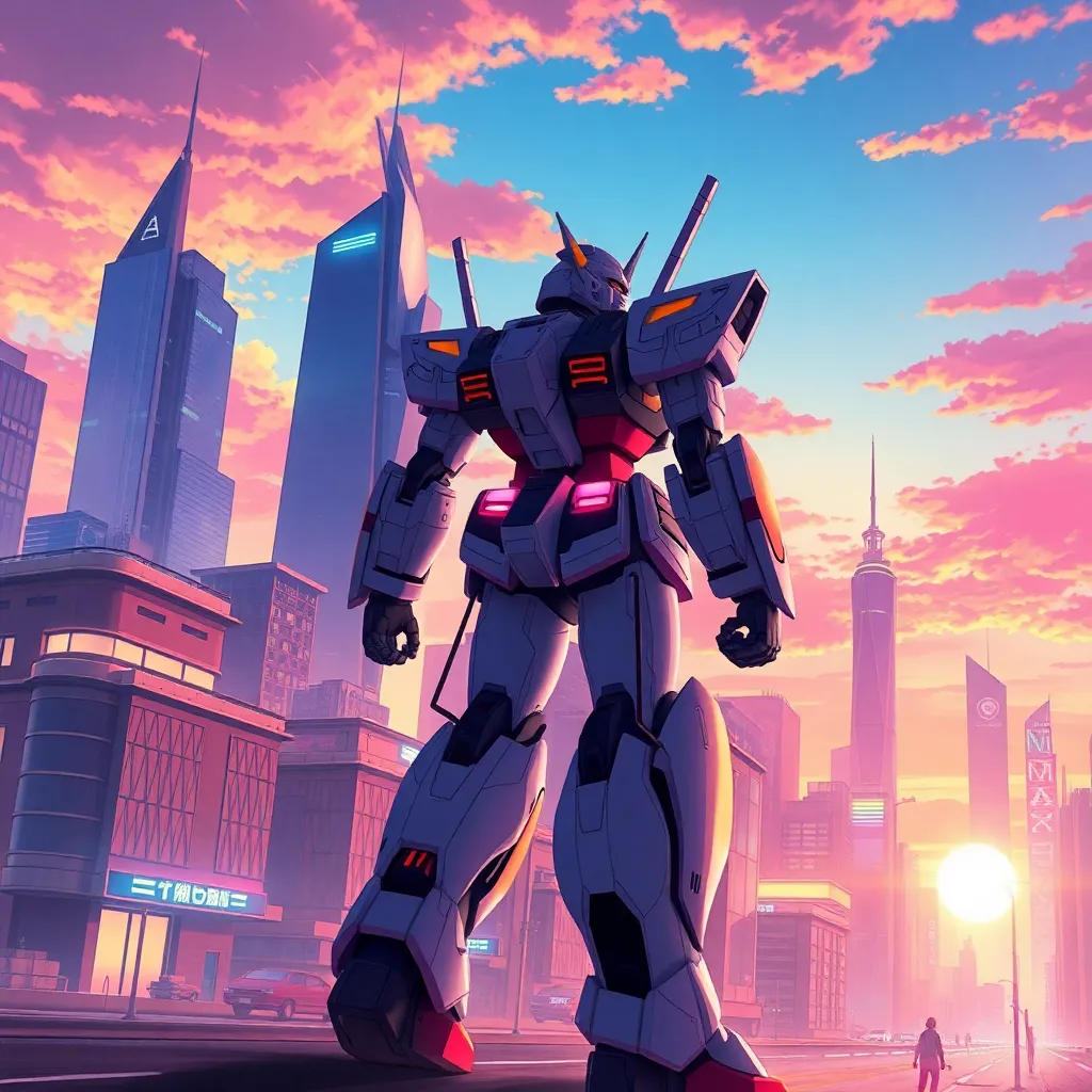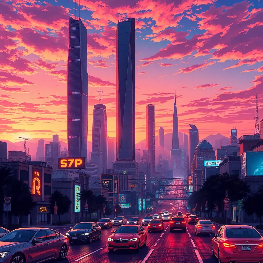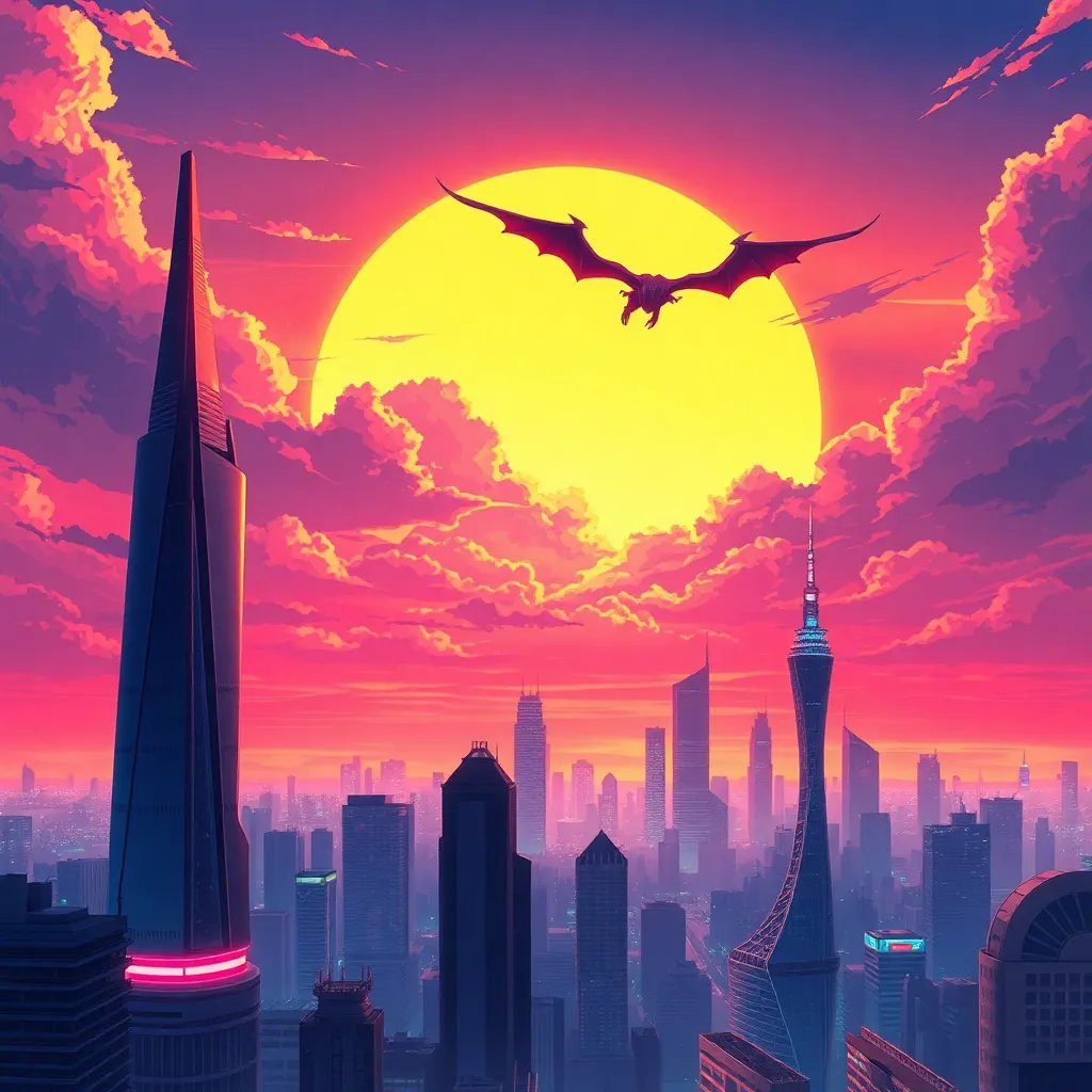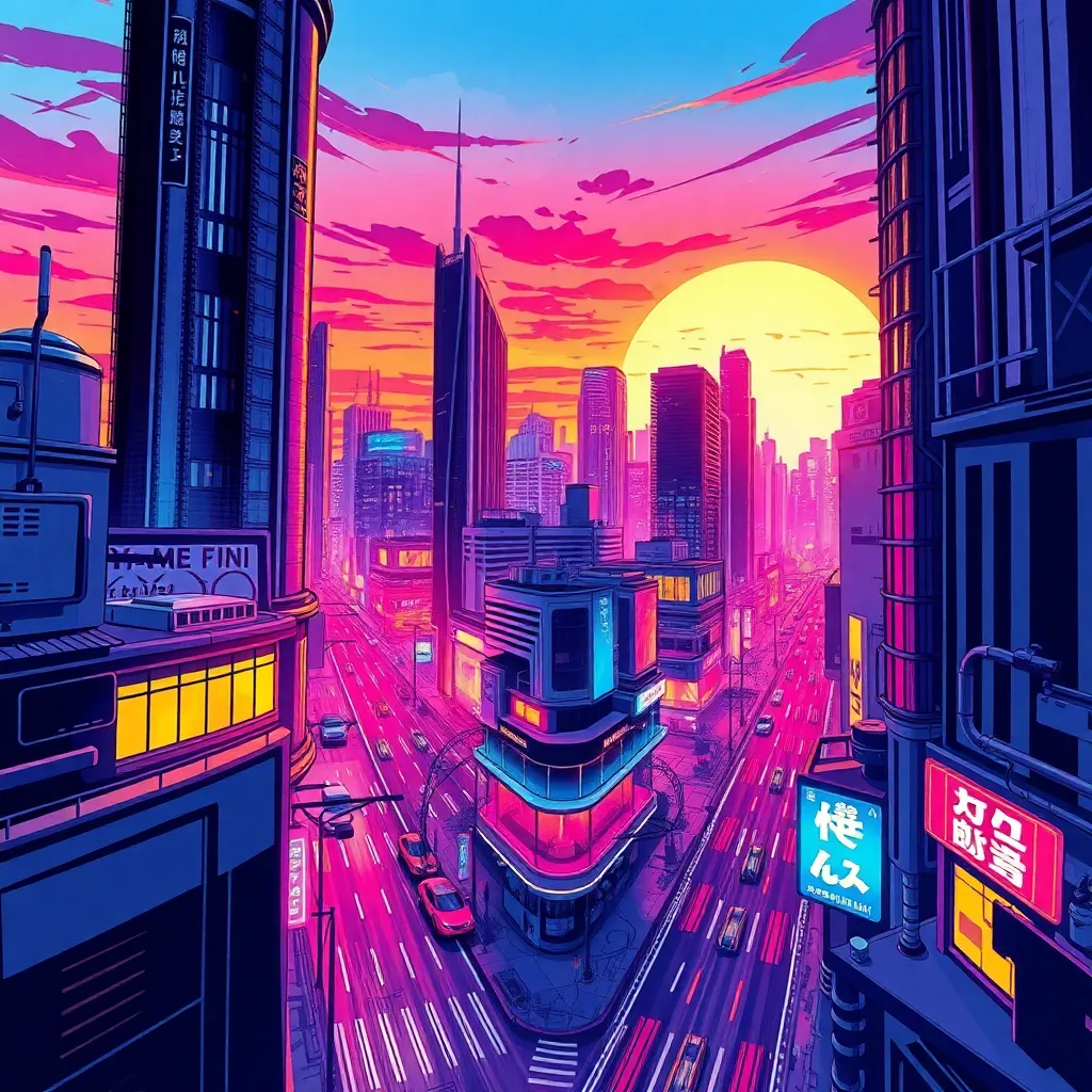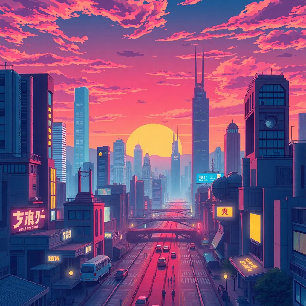 Create a stunning anime-style illustration of a futuristic cityscape at sunset. Incorporate vibrant neon lights, towering skyscrapers, and a sense of nostalgia. Use a mix of pastel colors and bold contrasts to capture the essence of a bygone era. The city should be bustling with activity, yet peaceful.