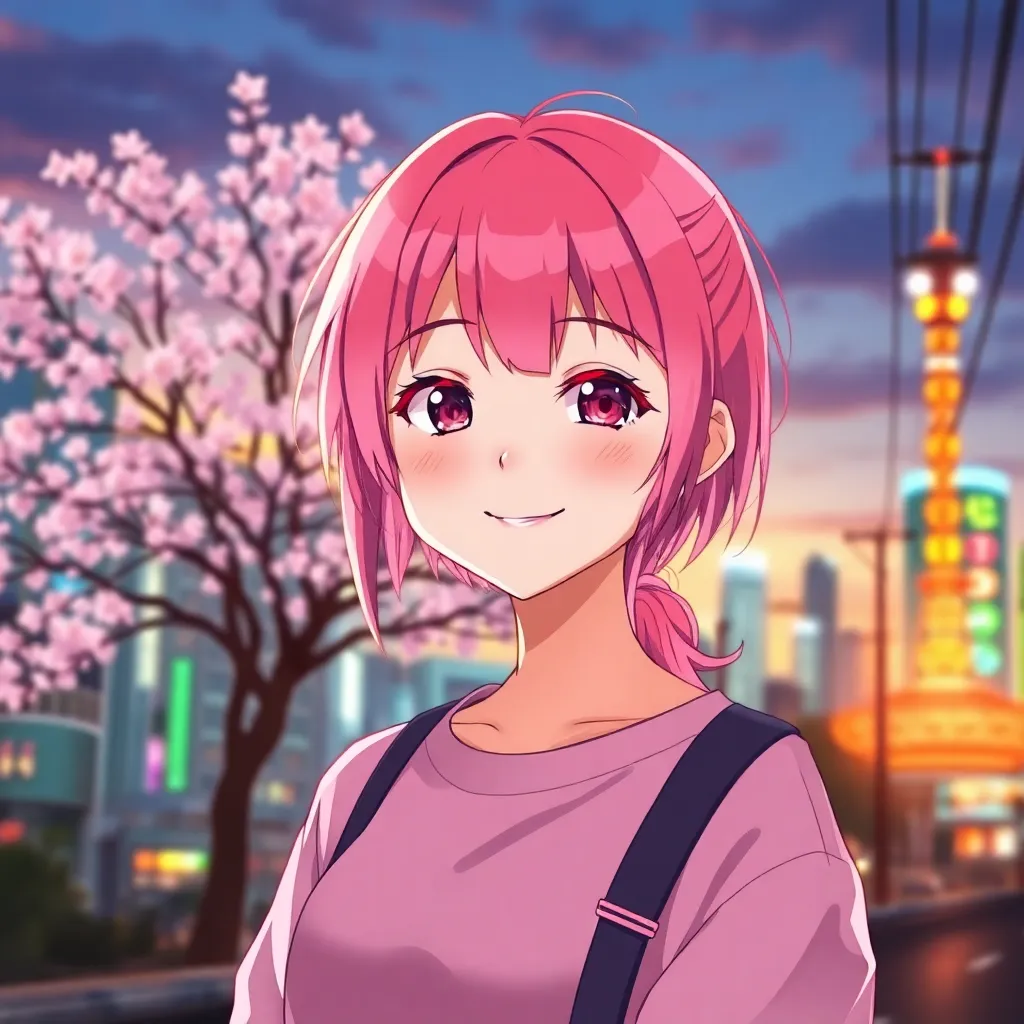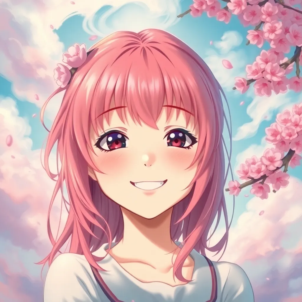 Create a mesmerizing anime-inspired portrait of a young girl with vibrant pink hair and a bright smile, set against a backdrop of swirling clouds and cherry blossoms. Incorporate subtle glow effects and intricate details to bring the image to life. Use a mix of soft pastel colors and bold brushstrokes.
