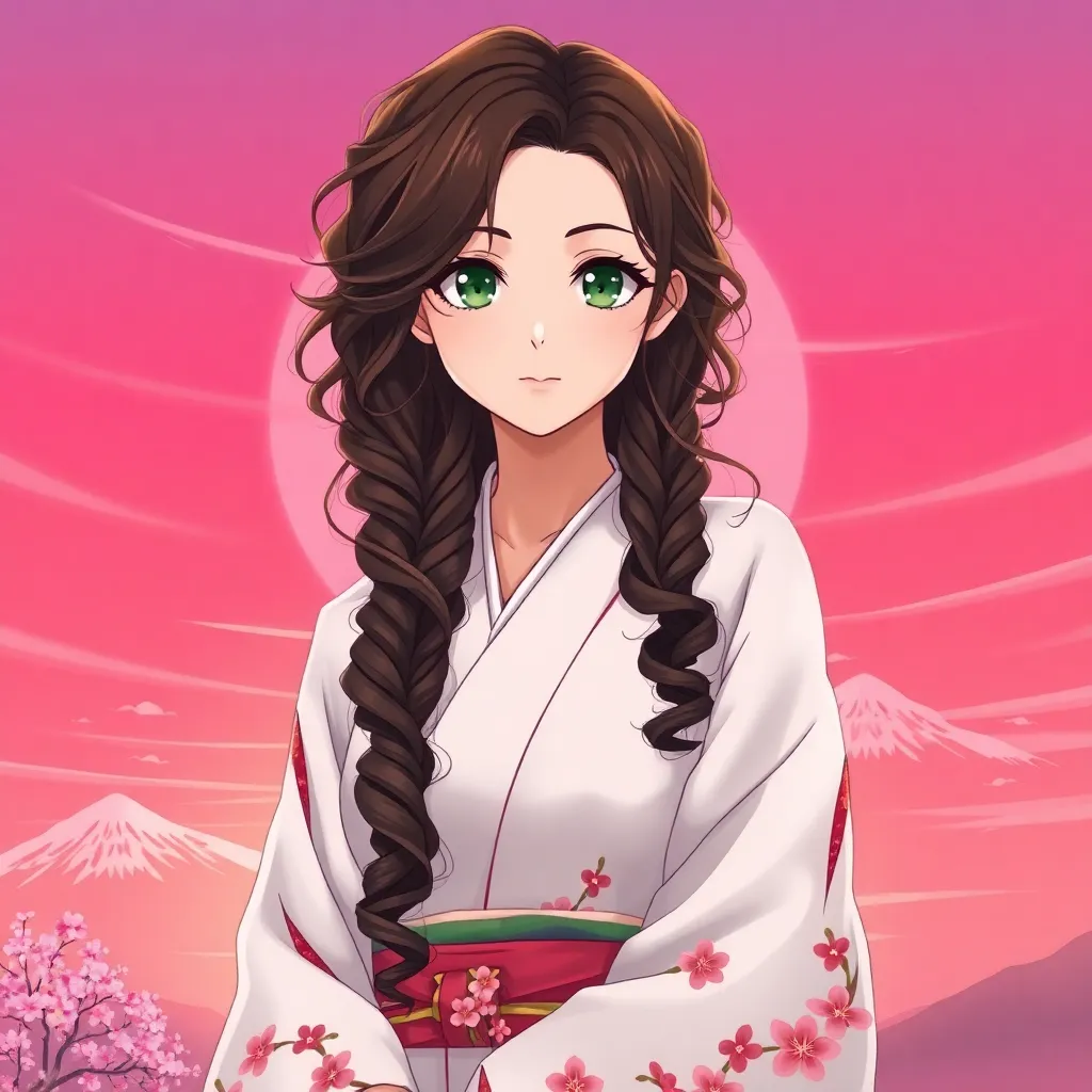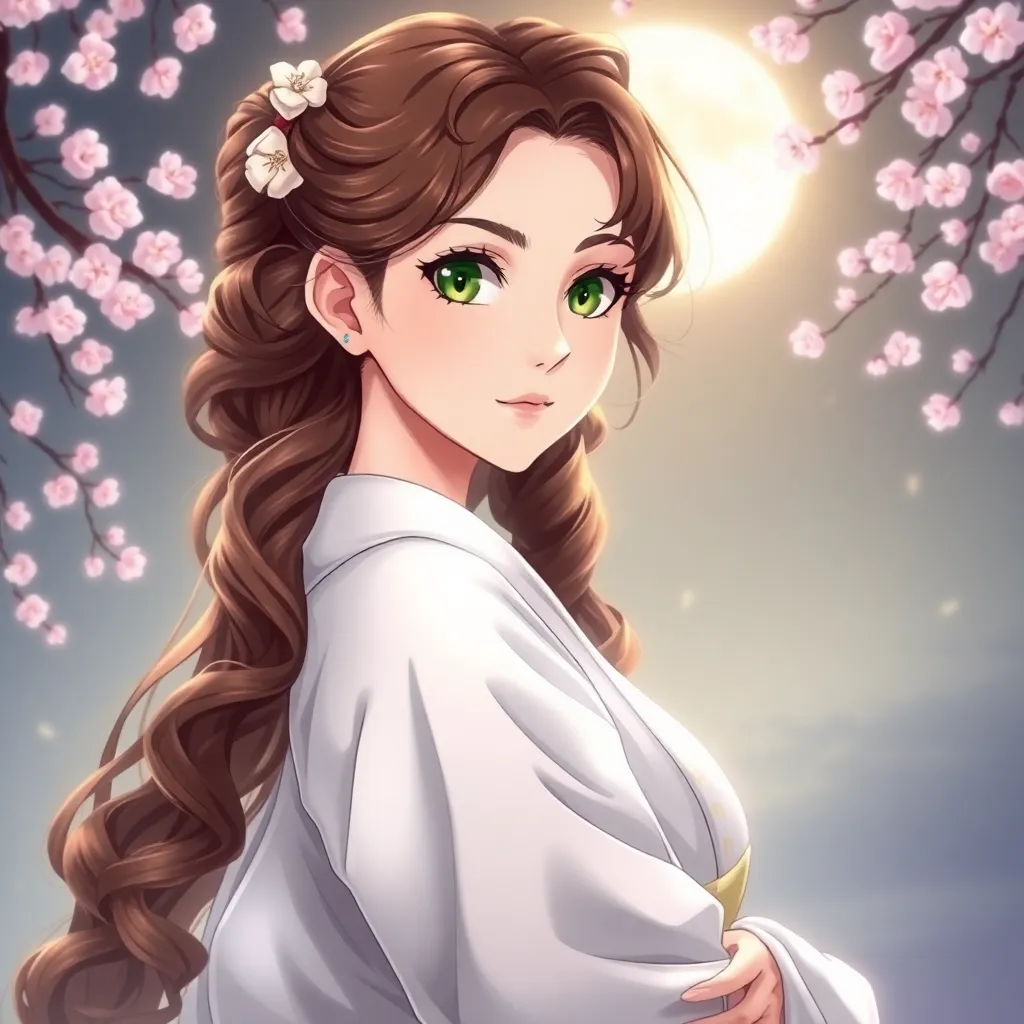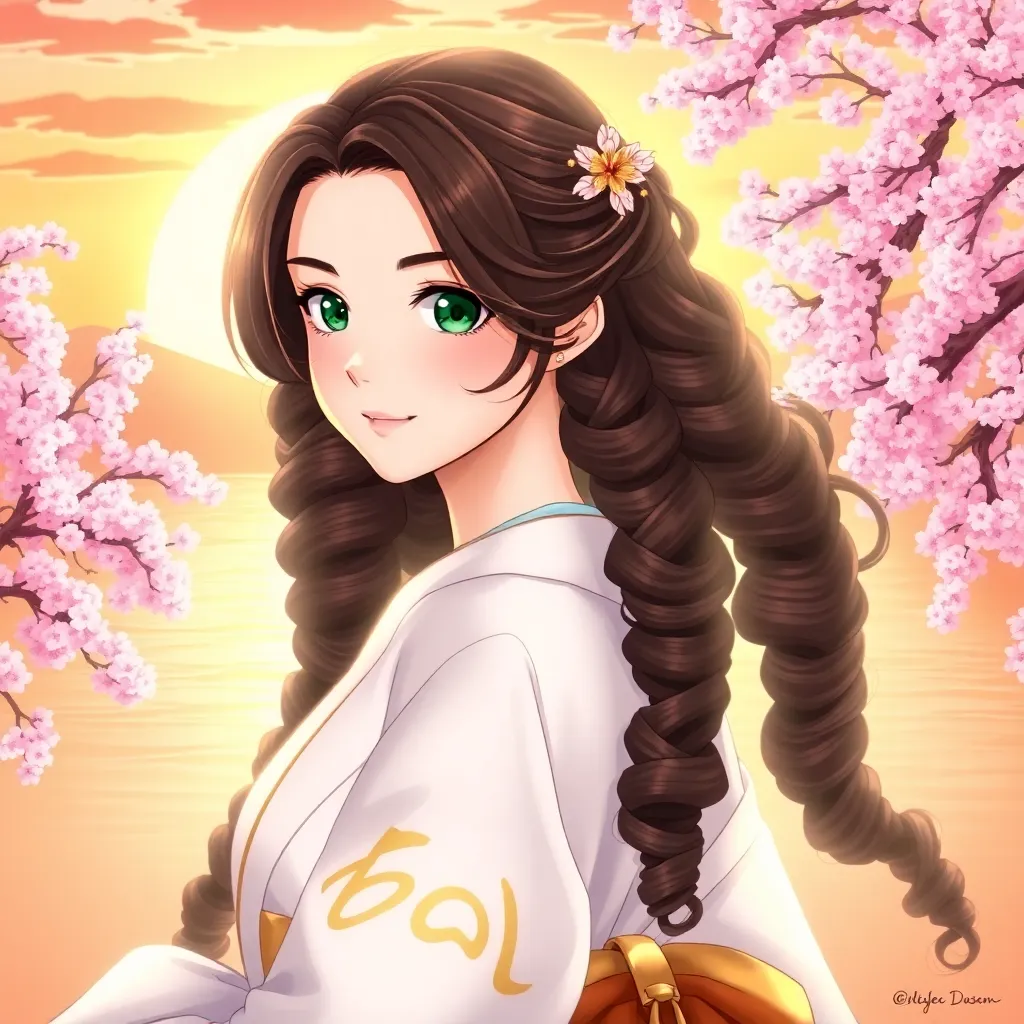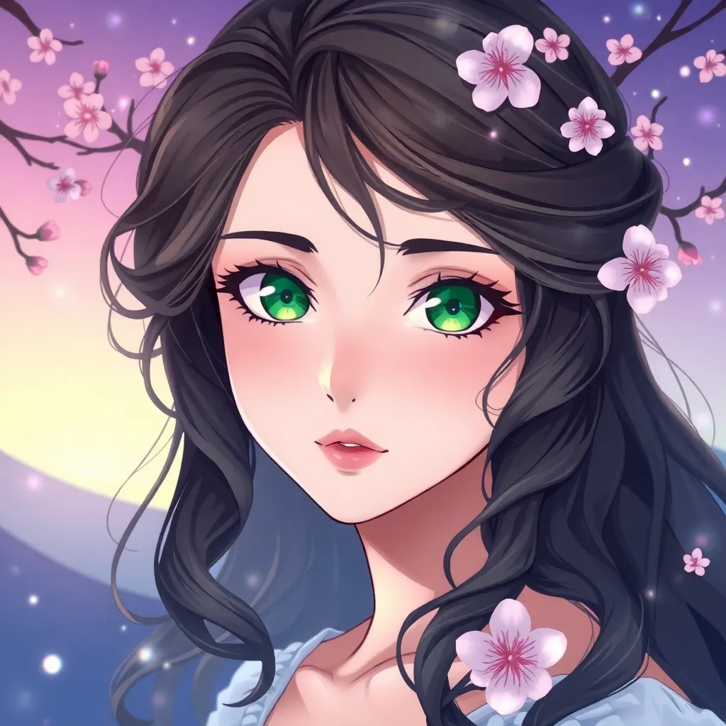 Create a stunning anime-inspired portrait of a young woman with long, curly hair and piercing green eyes. Incorporate a subtle gradient of purple and blue hues in the background, with delicate cherry blossoms and subtle sparkles to give the image a whimsical touch. Use a vibrant and dreamy color palette.