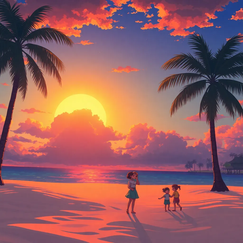 Transform a stunning sunset landscape photo into a vibrant anime-inspired artwork. Capture the warmth of the setting sun, the texture of the sand, and the movement of the palm trees. Add anime-style characters in the foreground, perhaps a couple embracing or a group of friends playing. Make it a breathtaking scene!