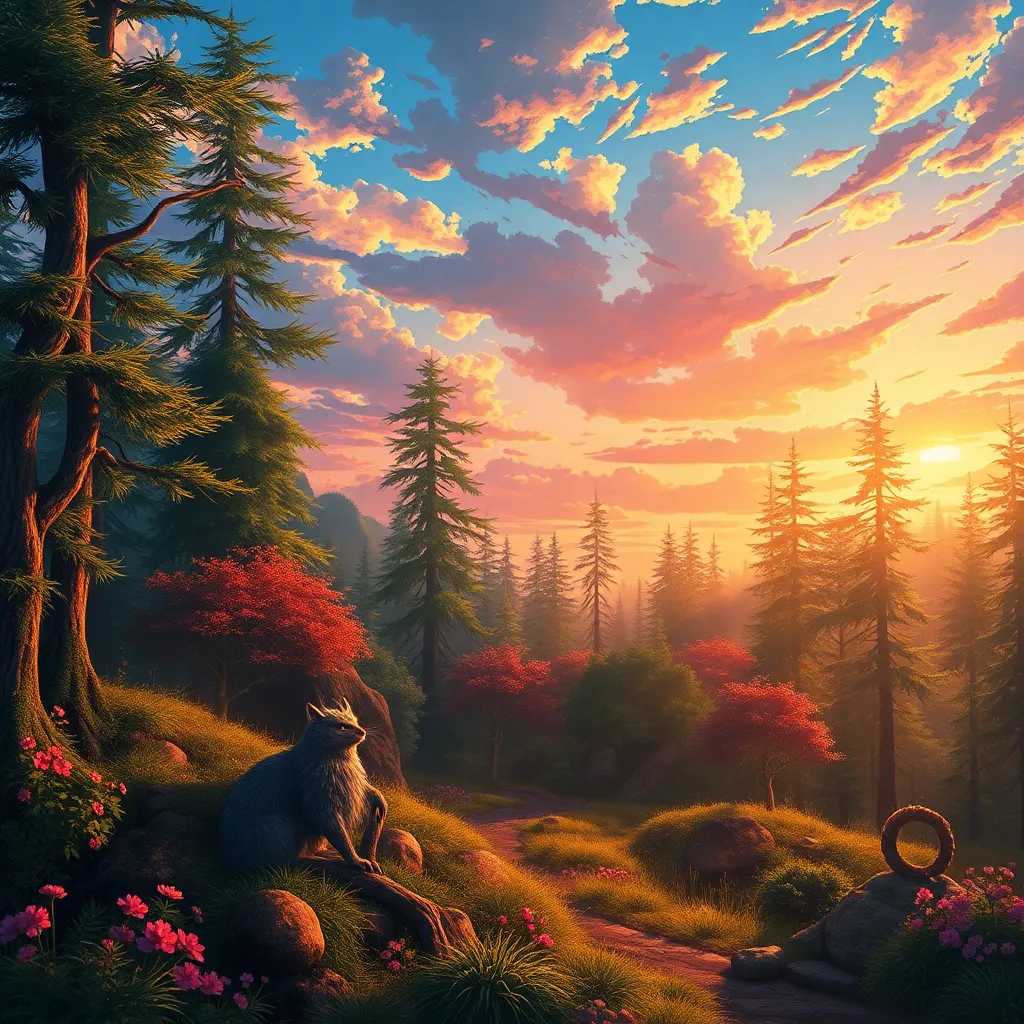 Transform a stunning sunset landscape into a vibrant anime-style artwork. Imagine a mystical forest with glowing trees and a fiery orange sky. Add a majestic dragon soaring above, its scales shimmering with iridescent colors. Use AI to bring this whimsical world to life, blending realistic textures with fantastical elements.