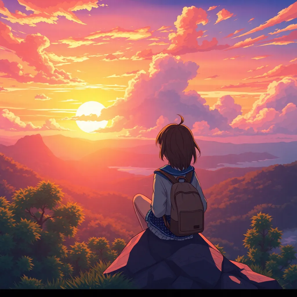Transform a stunning sunset landscape photo into a vibrant anime-style illustration, complete with whimsical clouds, a warm glow, and a sense of serenity. Incorporate anime-inspired characters, such as a young girl with a backpack, sitting on a rock, gazing out at the breathtaking view, surrounded by lush greenery.