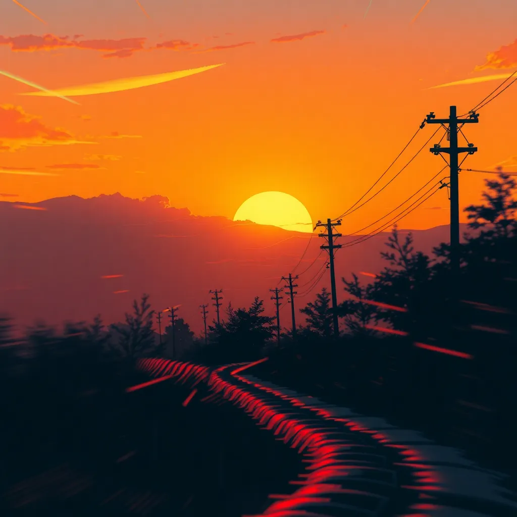 Transform a stunning sunset landscape photo into a vibrant anime-inspired illustration. Capture the warm hues of the setting sun, the wispy clouds, and the rugged terrain. Bring the scene to life with dynamic brushstrokes, bold colors, and a dash of magical realism. Create a captivating anime art piece.