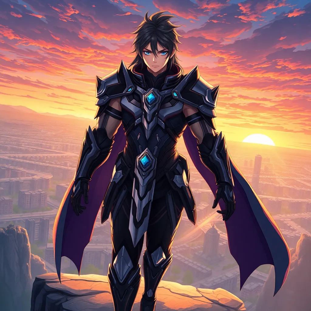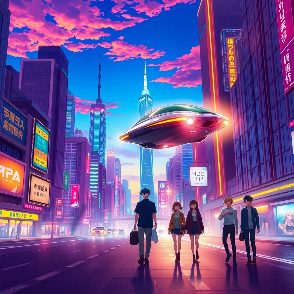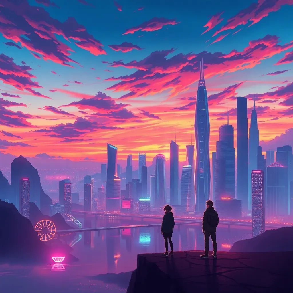 Create a stunning anime-inspired image of a futuristic cityscape at sunset, with sleek skyscrapers, neon lights, and a hint of magic in the air. Incorporate vibrant colors and dynamic poses to bring this captivating scene to life. Use a mix of realistic and stylized elements to make it truly unique.
