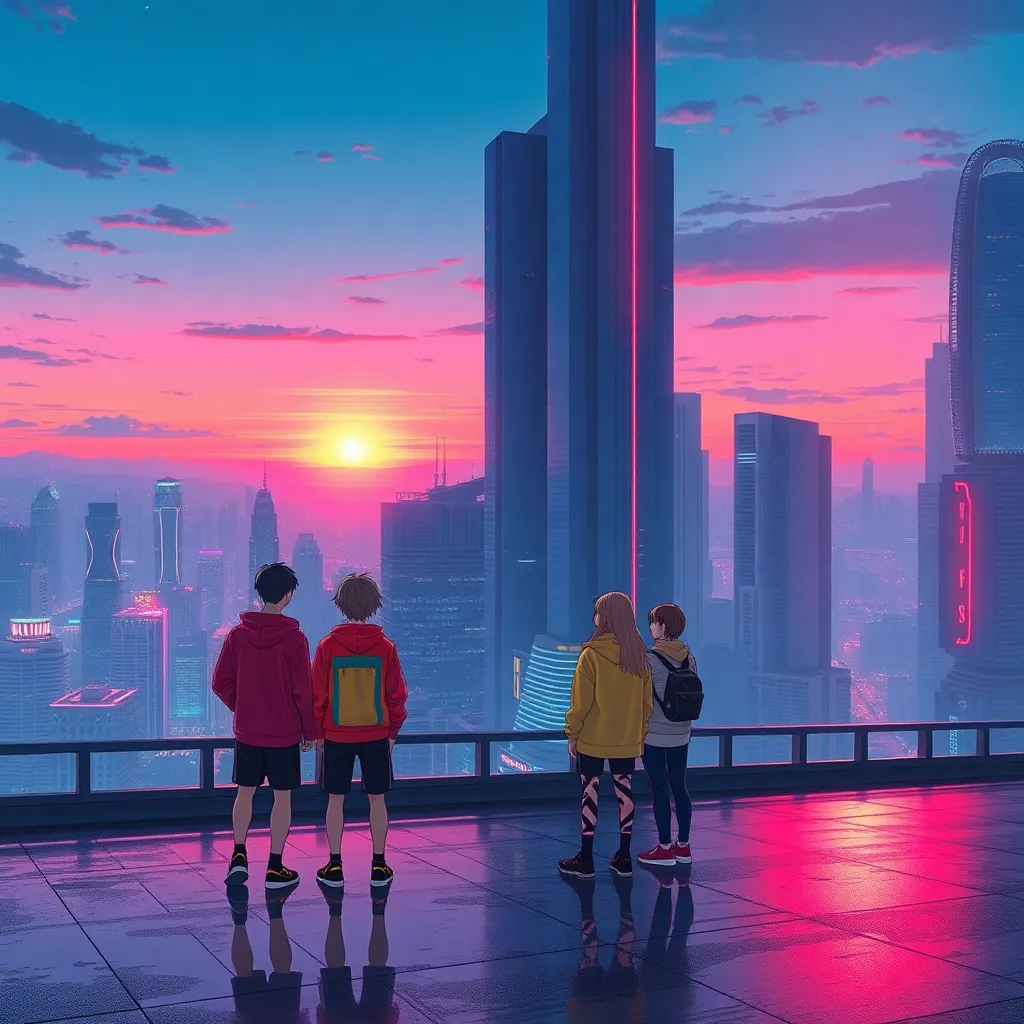 Create a stunning anime-inspired image of a futuristic cityscape at dusk, with towering skyscrapers and neon lights reflecting off the wet pavement. Incorporate a group of friends, all dressed in vibrant streetwear, standing at the edge of the city, looking out towards a breathtaking sunset in the distance.