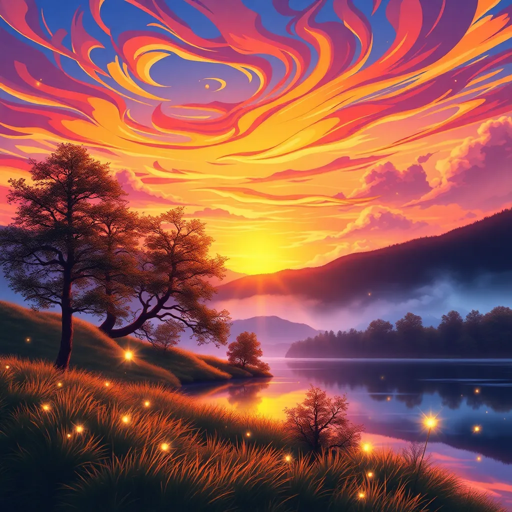 Transform a stunning sunset landscape photo into a vibrant anime-style artwork. Capture the warmth of the golden hour with swirling clouds, rustic trees, and a serene lake in the foreground. Add a touch of magic with sparkling fireflies and a wispy aura surrounding the scene. Generate an anime-inspired masterpiece!