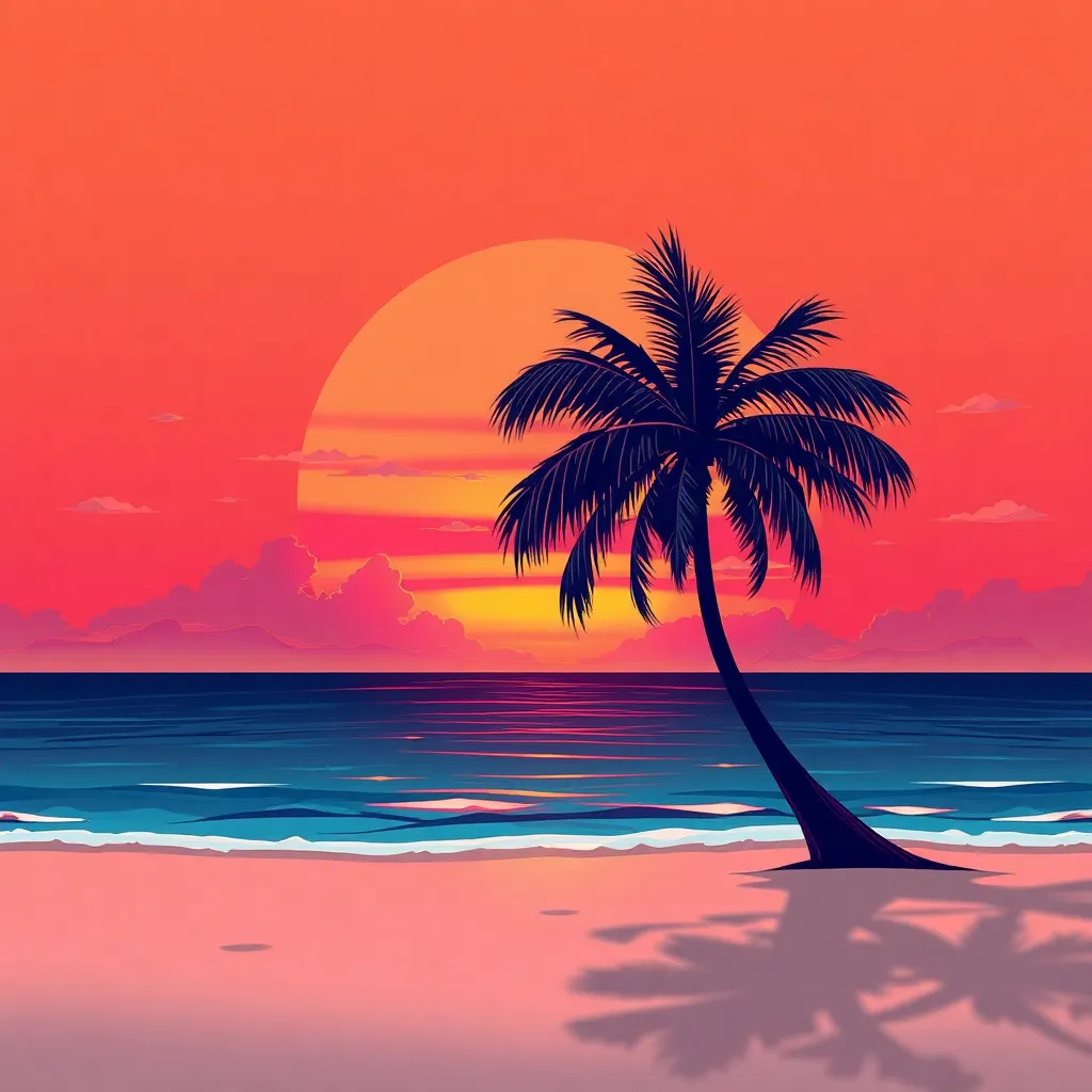Transform a stunning sunset landscape into an anime-inspired artwork. Imagine a serene beach scene with a majestic palm tree, vibrant orange and pink hues, and a few wispy clouds. Use bold lines, bright colors, and dynamic composition to create a captivating anime-style image that captures the essence of a tropical paradise.