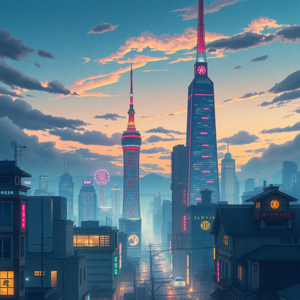 Create a stunning anime-inspired image of a futuristic cityscape at dusk, with neon-lit skyscrapers, wispy clouds, and a hint of magic in the air. Incorporate vibrant colors, intricate details, and a sense of wonder. Use a mix of traditional Japanese architecture and modern technology to make it truly unique.