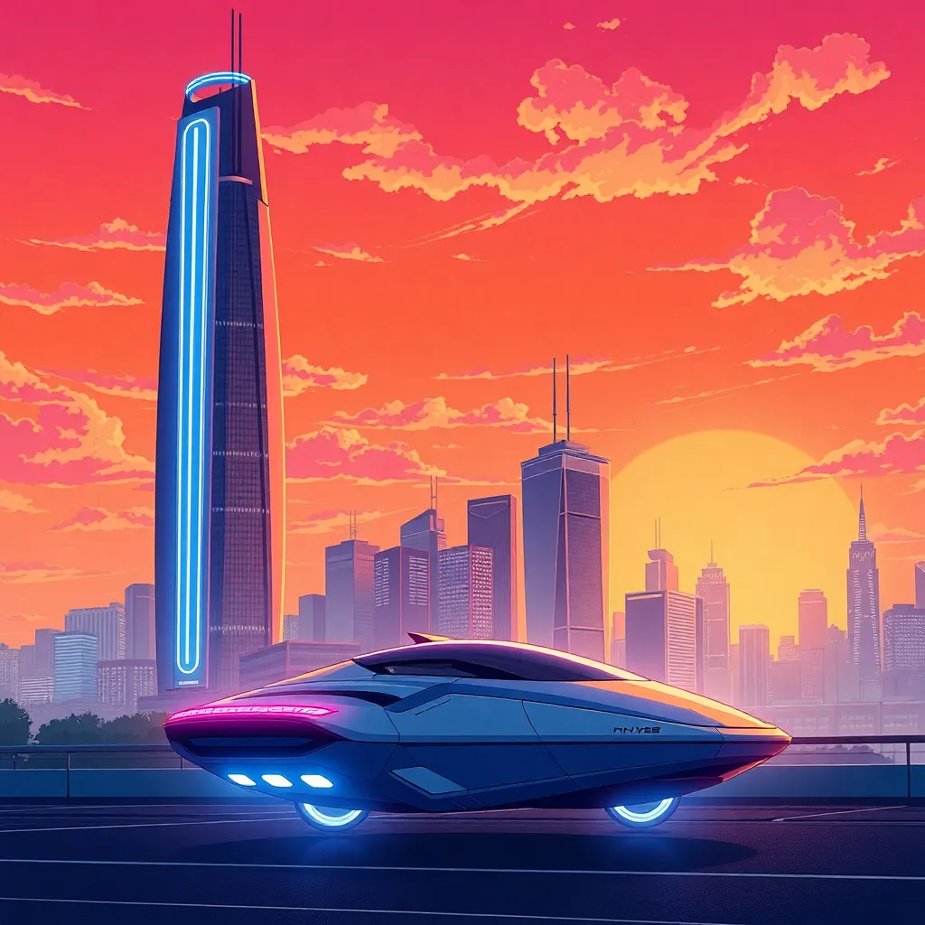 Create a stunning anime-inspired portrait of a futuristic cityscape at sunset. The scene should feature a sleek skyscraper with neon lights, a futuristic hovercar in the foreground, and a vibrant orange-pink sky with clouds. The anime style should be reminiscent of classic Japanese manga, with bold lines and vibrant colors.