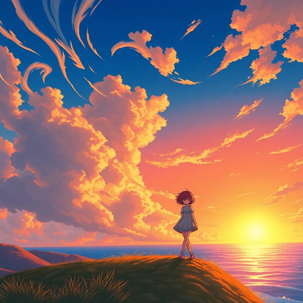 Convert a stunning sunset photo of a young woman standing on a cliff overlooking a vast ocean, with her hair flowing in the wind, into a vibrant anime illustration. Enhance the colors, add dramatic lighting, and incorporate anime-style textures and details to bring out the character's emotions and environment.