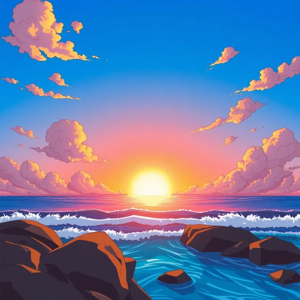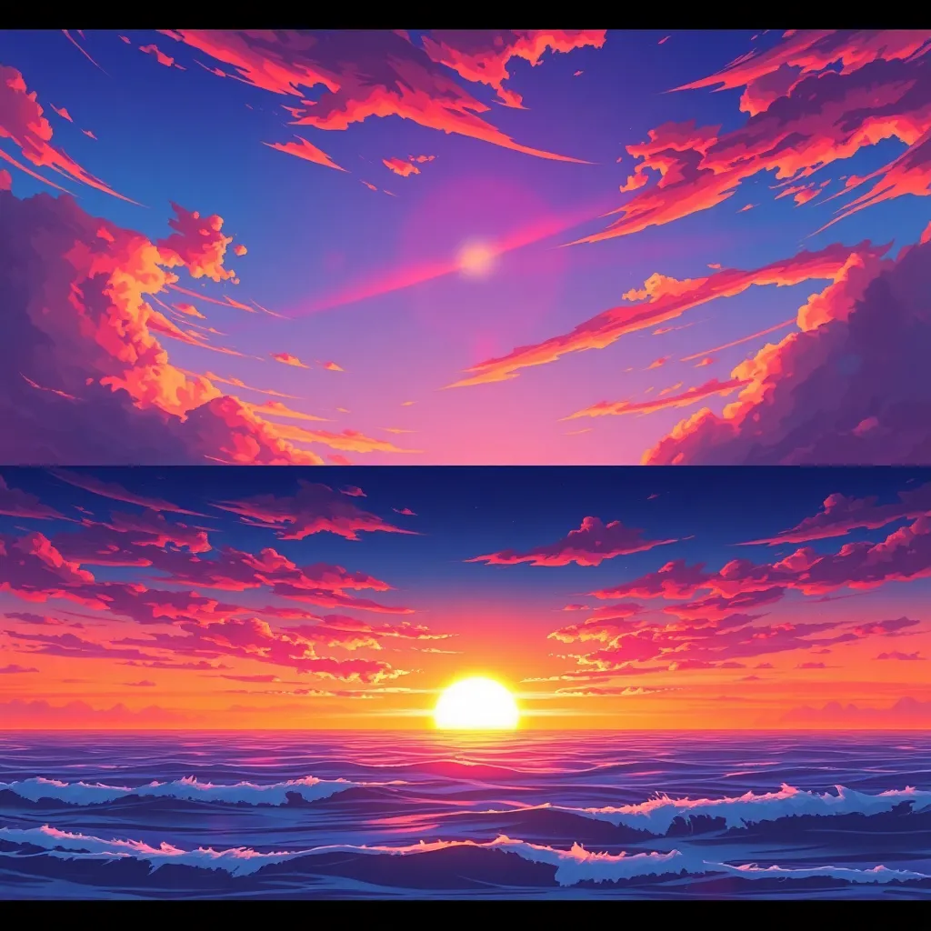 Transform a stunning sunset landscape photo into a vibrant anime-inspired artwork, with vibrant colors and dramatic lighting. Capture the warmth of the setting sun on the horizon, with wispy clouds and a serene ocean in the foreground. Create an enchanting anime-style image that transports viewers to a peaceful world.