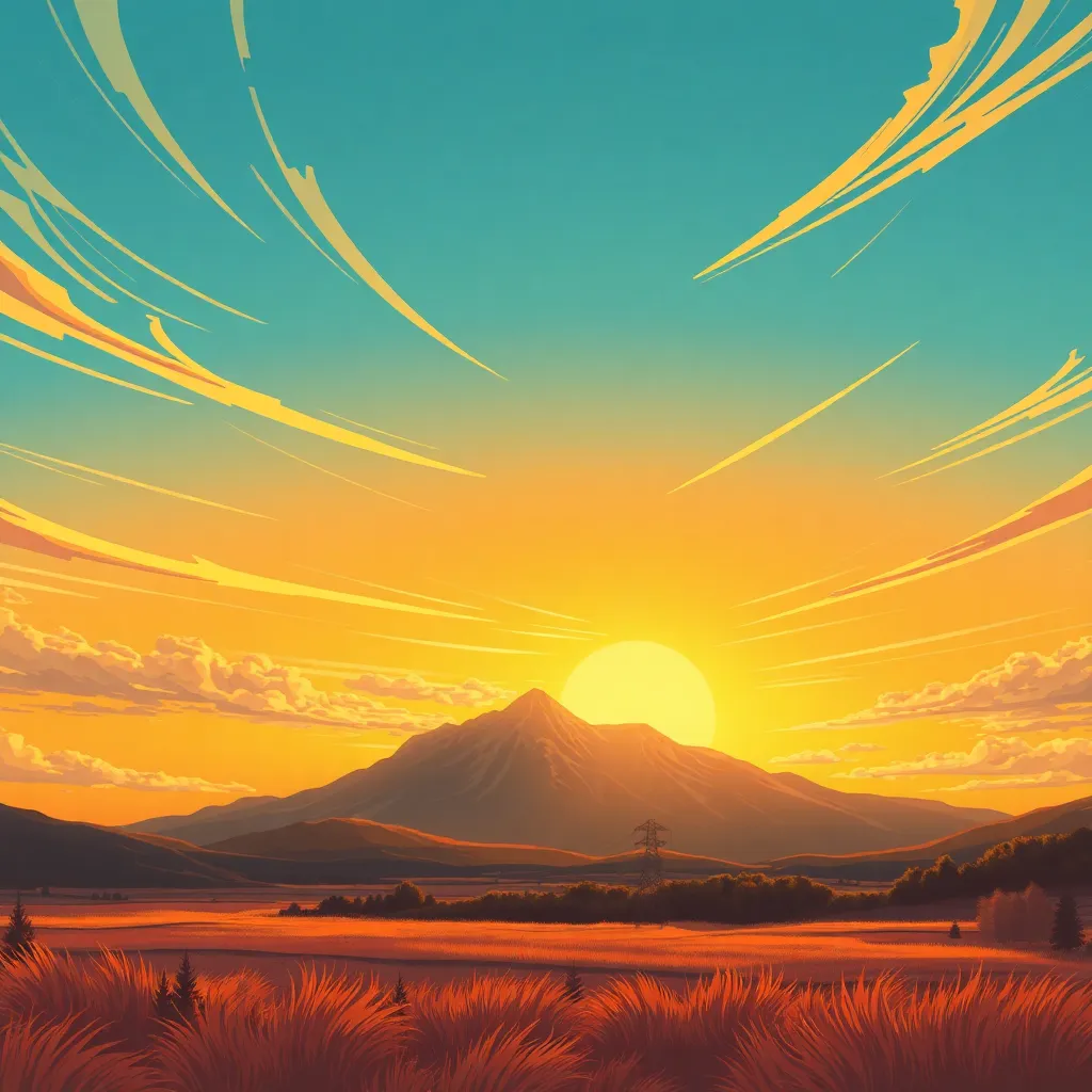 Transform a stunning sunset photo into a vibrant anime-style illustration. Imagine a serene landscape with wispy clouds, warm golden hues, and a majestic mountain range in the distance. Use AI to recreate the scene with bold lines, bright colors, and dynamic textures, bringing the tranquility of nature to life.