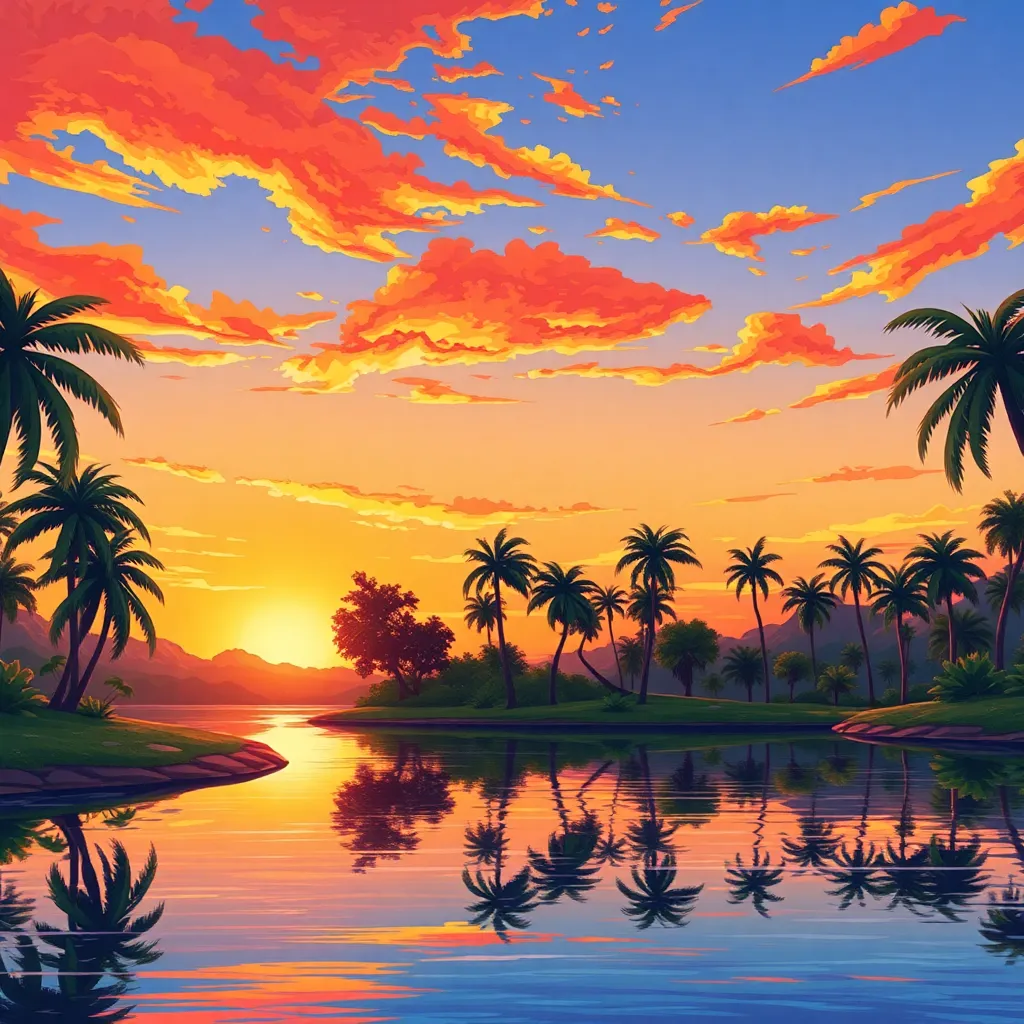 Transform a breathtaking sunset landscape photo into a vibrant anime-style illustration. The image features a serene lake, swaying palm trees, and a warm orange sky. Capture the tranquil atmosphere and striking colors in a unique anime-inspired artwork, blending traditional and digital media to create a captivating visual piece.