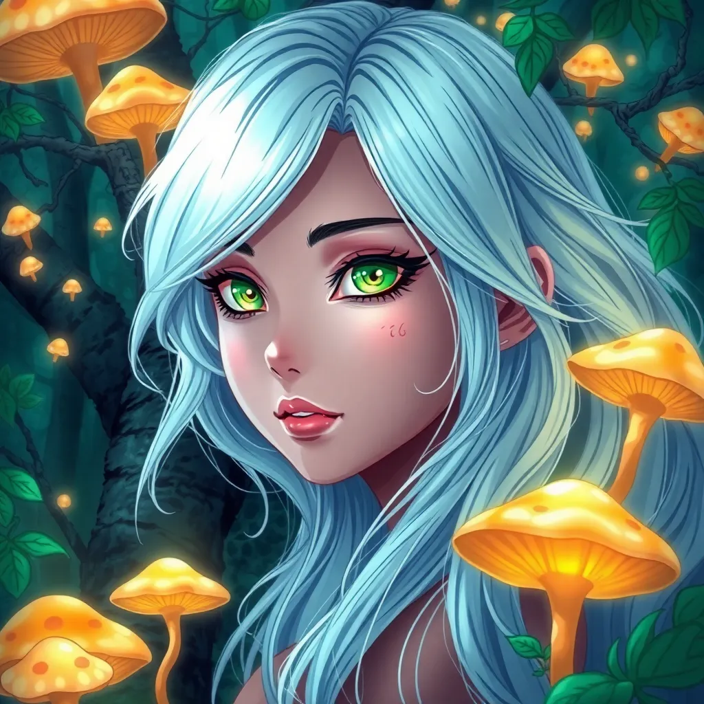Create a mesmerizing anime-inspired portrait of a mystical forest dweller, surrounded by glowing mushrooms and vines, with piercing emerald eyes and flowing silver hair, rendered in a vibrant, high-contrast style with bold lines and textures. Use a mix of warm and cool colors to evoke a sense of wonder.