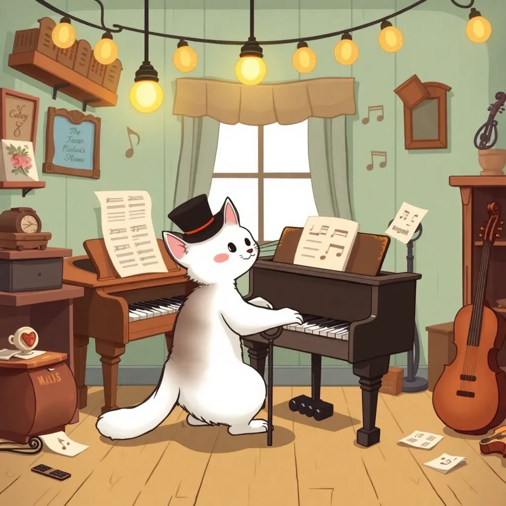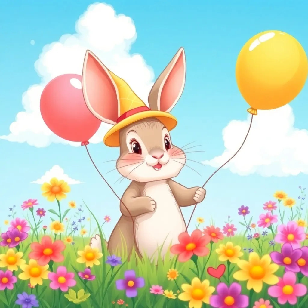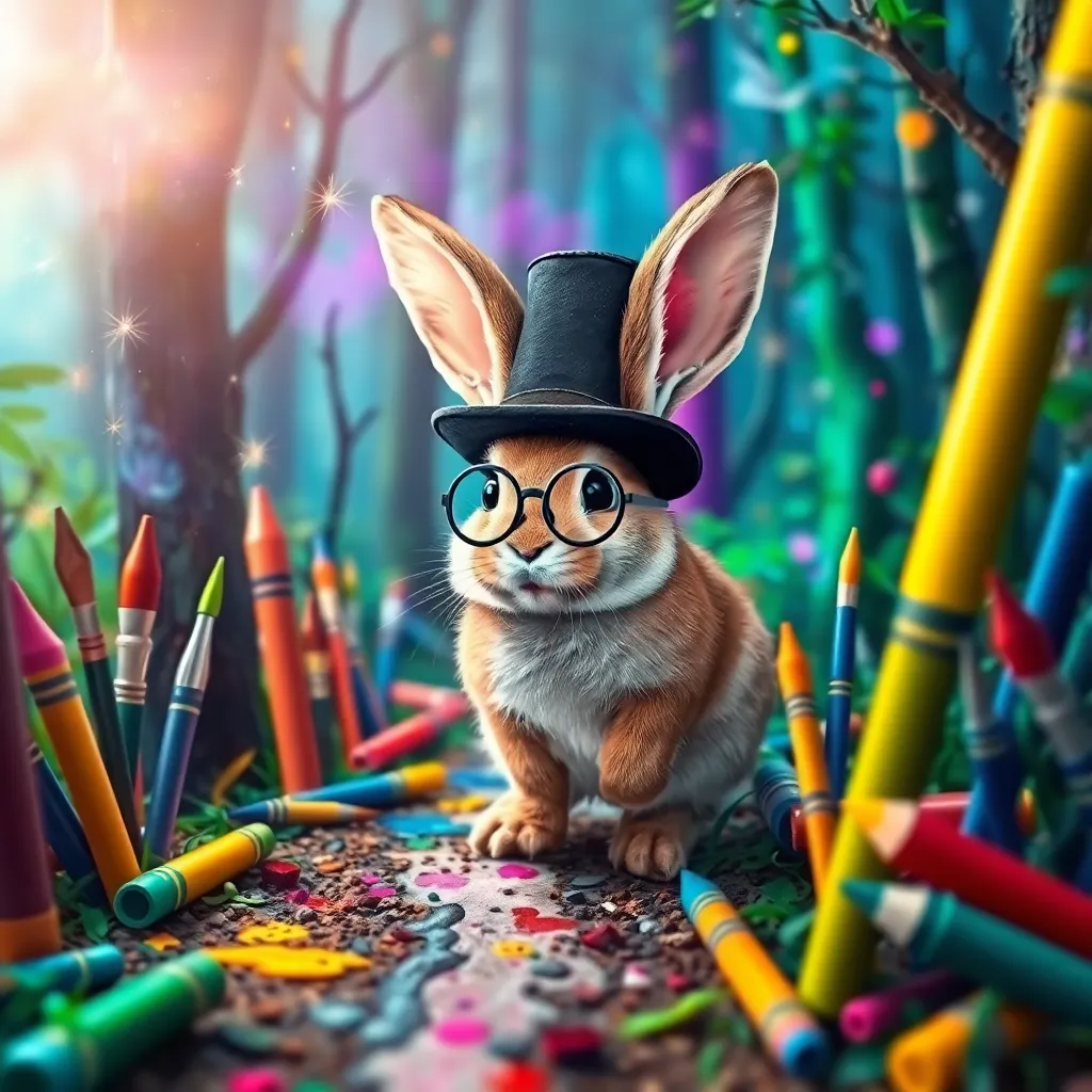 Imagine a whimsical forest, where a curious rabbit in a top hat and monocle discovers a hidden path made of giant crayons and paintbrushes. The air is filled with swirling colors and vibrant sparks. Capture the rabbit's joyful expression as it explores this fantastical world, surrounded by art supplies.