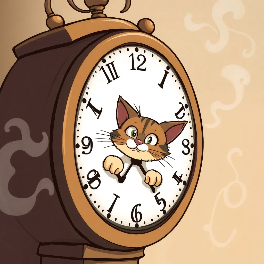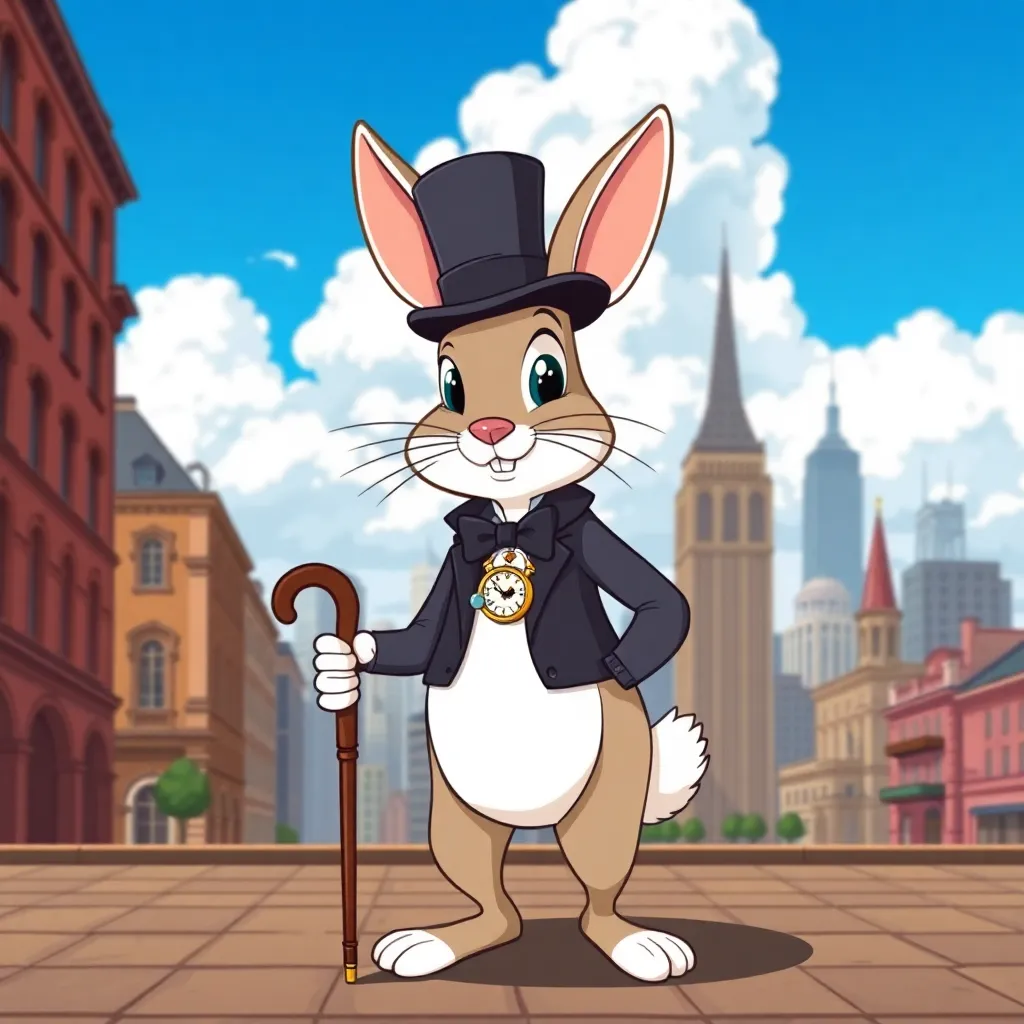 Imagine a whimsical world where animals can walk on two legs and have human-like features. Create a cartoon of a rabbit wearing a top hat and holding a cane, standing in front of a vintage-style cityscape with a bright blue sky and fluffy white clouds. Add fun details like a pocket watch and a monocle!