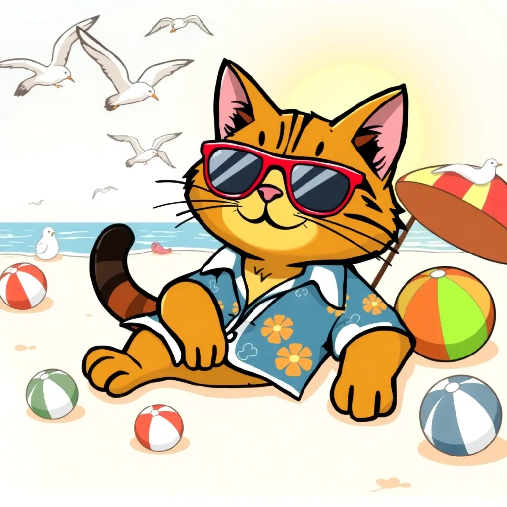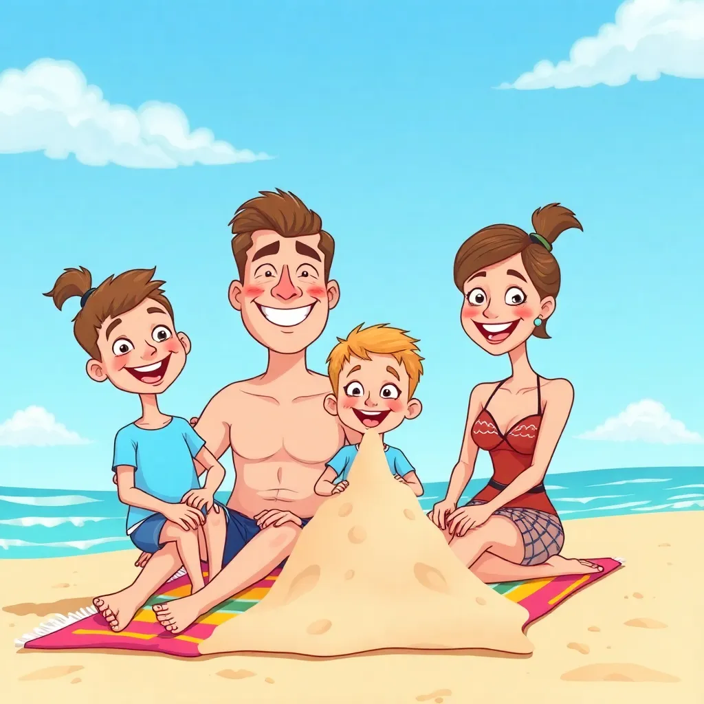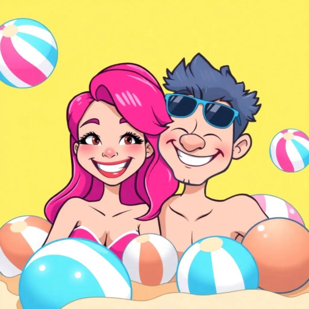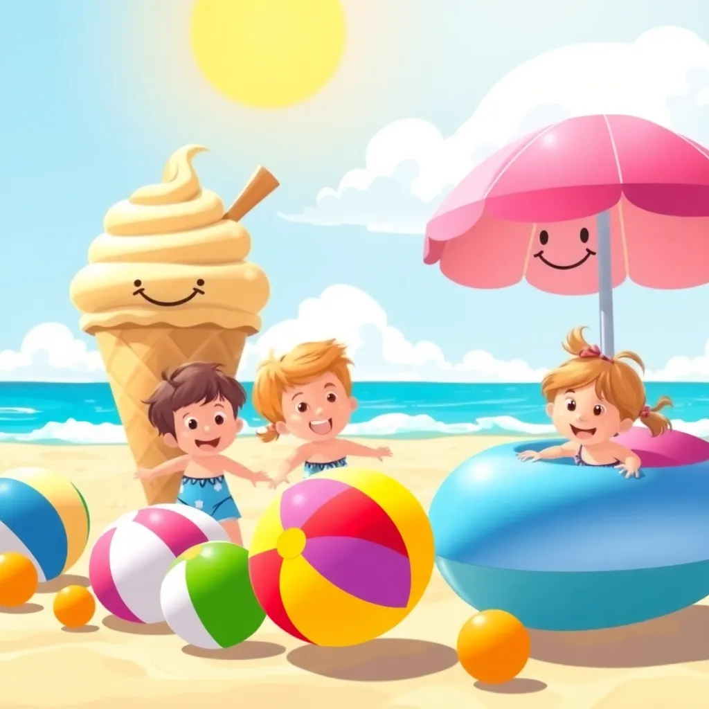 Transform a sunny day at the beach into a whimsical cartoon scene. A group of happy children are playing with colorful beach balls and inflatables in the foreground, while a giant ice cream cone and a beach umbrella with a smiling face stand out in the background. Add vibrant colors and textures to bring this scene to life!