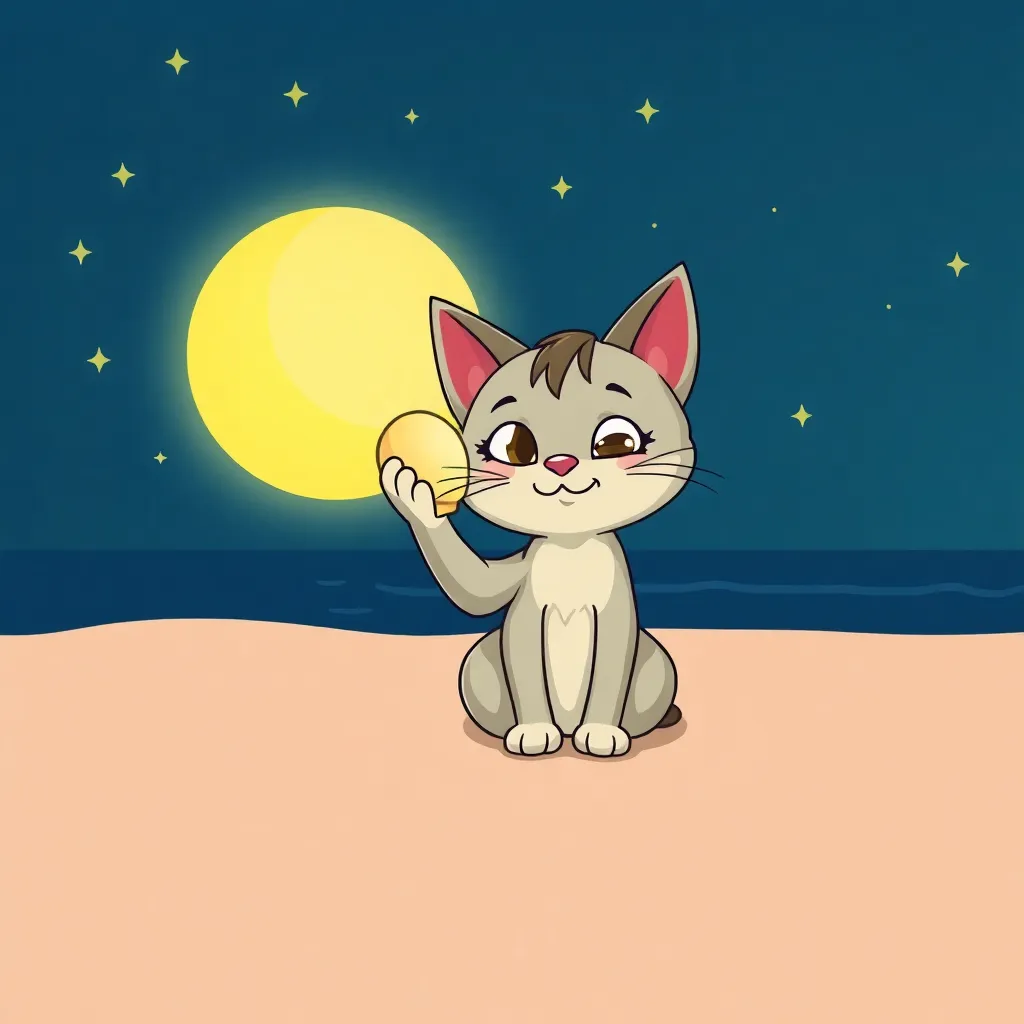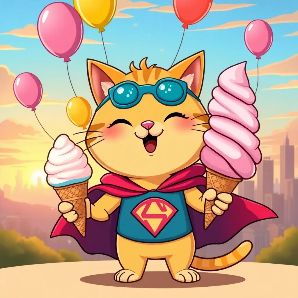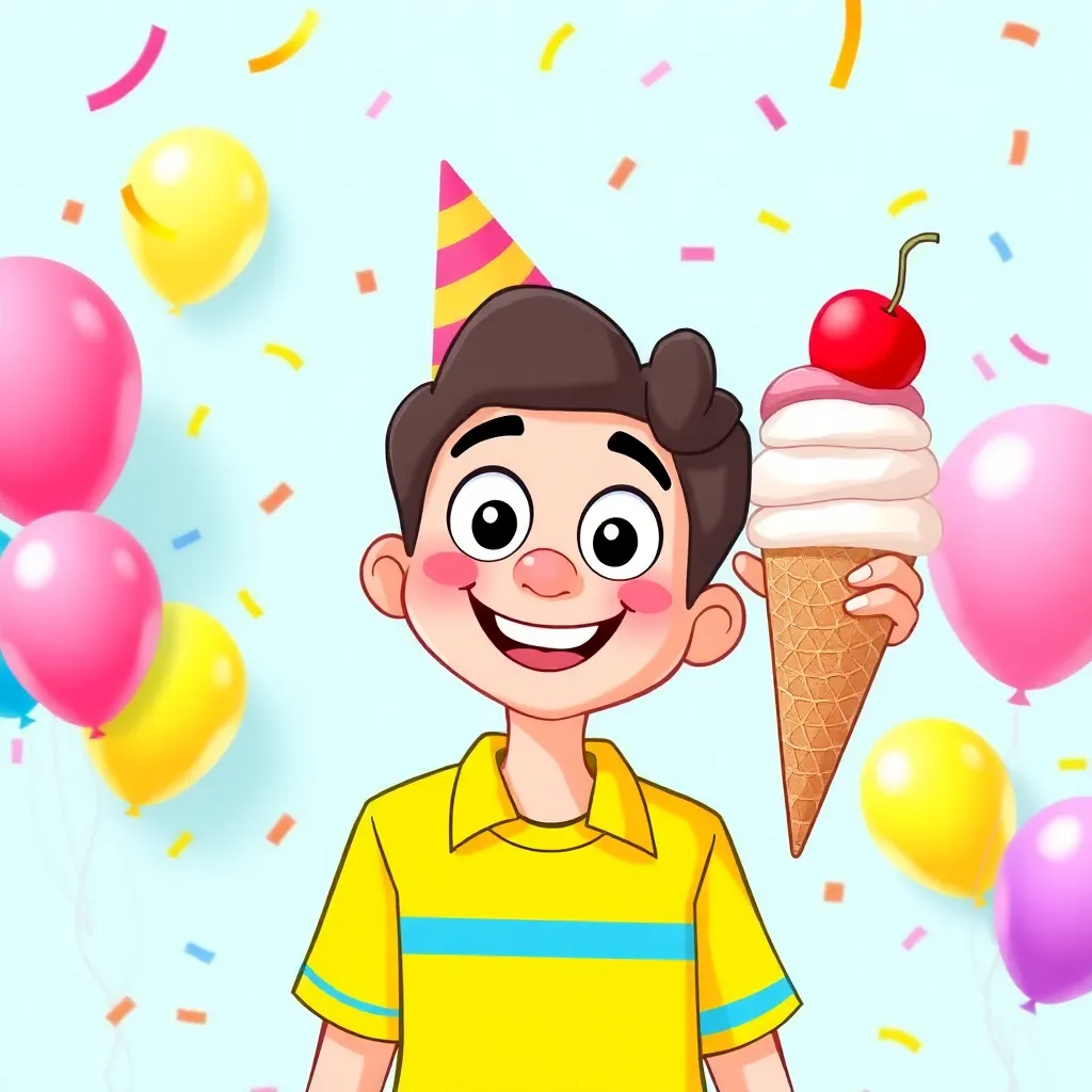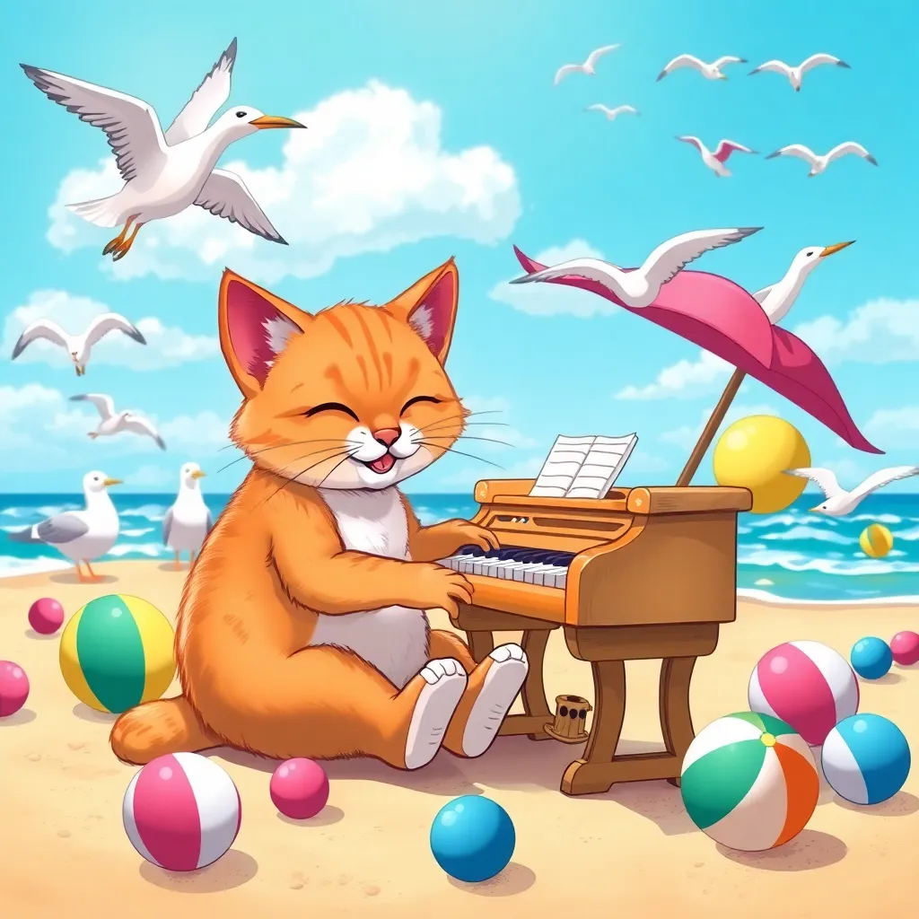 Transform a sunny day at the beach into a whimsical cartoon scene. A group of happy children are playing with colorful beach balls and inflatables in the foreground, while a giant ice cream cone and a beach umbrella with a smiling face stand out in the background. Add vibrant colors and textures to bring this scene to life!