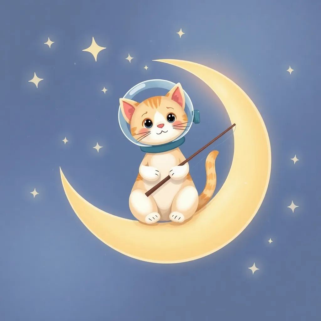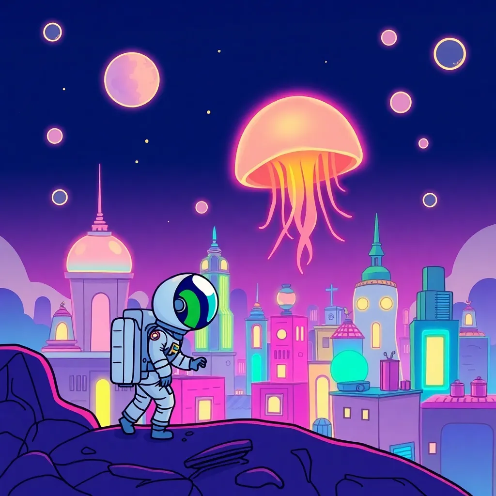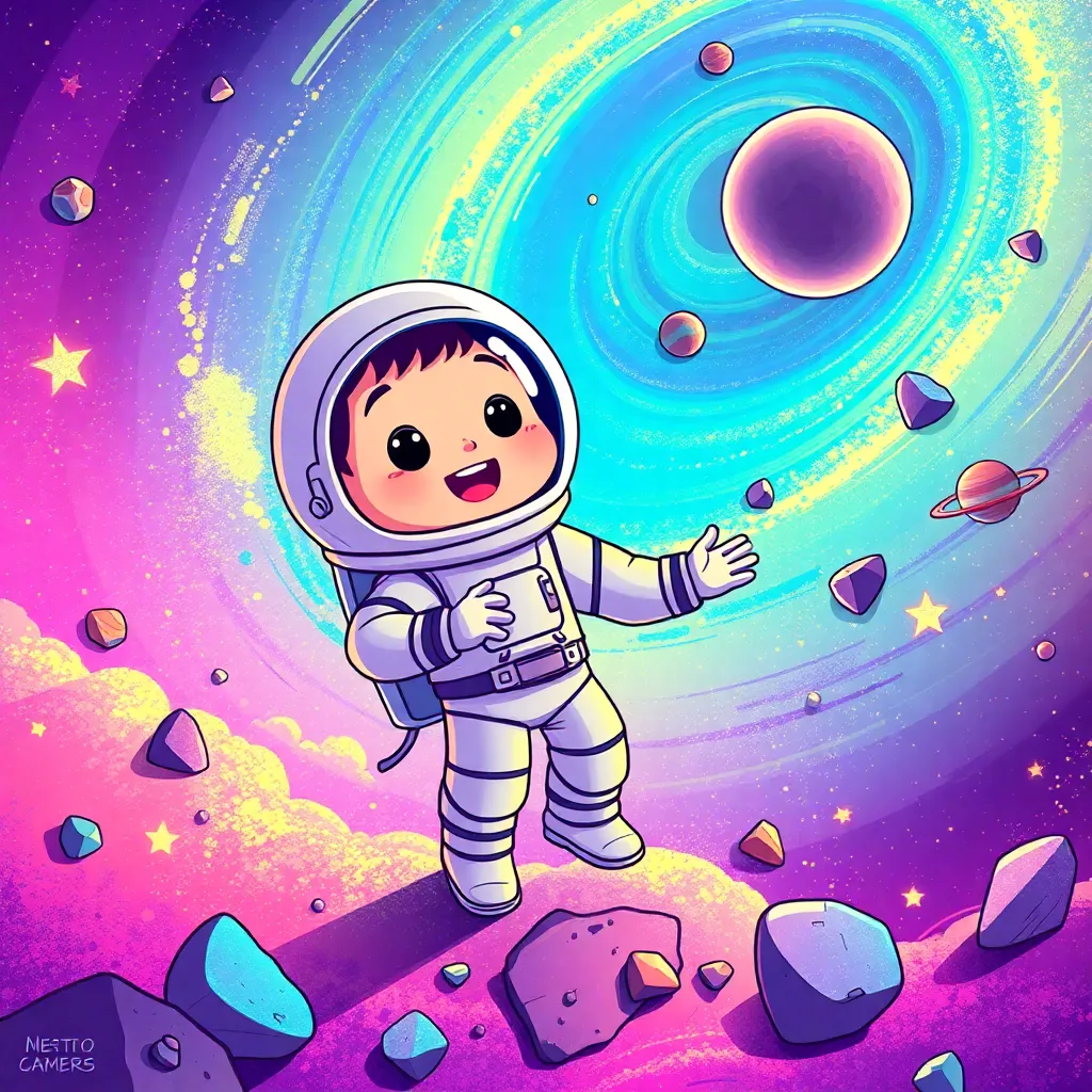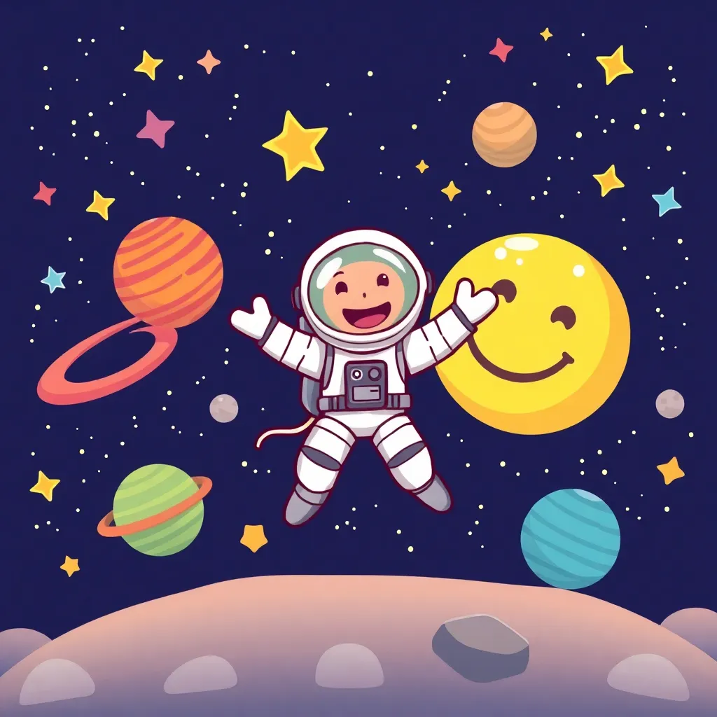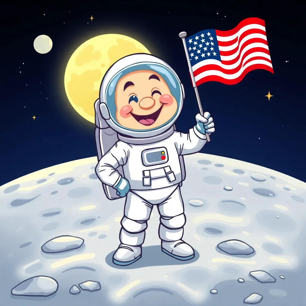 Create a cartoon-style image of a smiling astronaut standing on the moon, wearing a shiny silver spacesuit and holding a giant American flag. The astronaut should have a goofy expression and the moon's surface should be covered in colorful, swirly patterns. The cartoon should be bright, colorful, and whimsical.