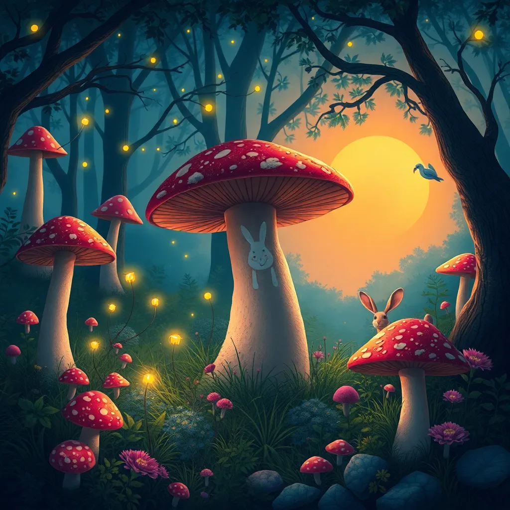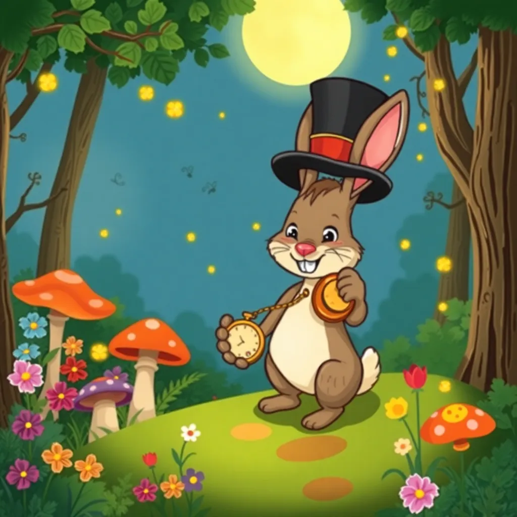 Create a cartoon version of a vintage-style illustration of a whimsical forest, featuring a smiling rabbit wearing a top hat and holding a pocket watch, surrounded by colorful flowers, mushrooms, and twinkling fireflies under a bright full moon, with a subtle texture and playful, exaggerated features.