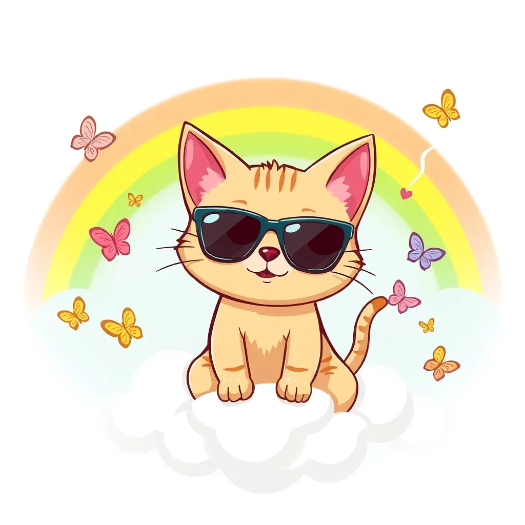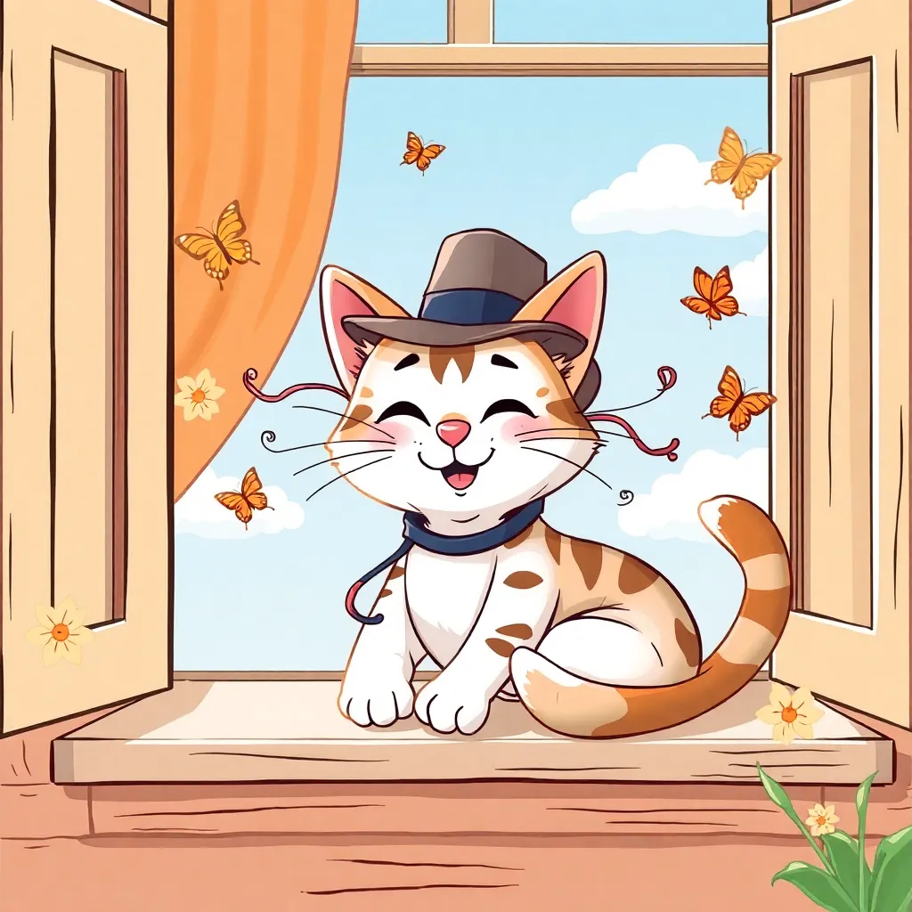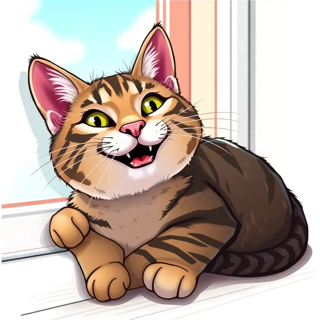 Transform this realistic photo of a smiling cat lounging on a windowsill into a vibrant, exaggerated cartoon character. Add bright colors, bold lines, and playful textures to create a whimsical illustration that captures the cat's carefree spirit. Make the cat's eyes sparkle and its whiskers twitch with joy.
