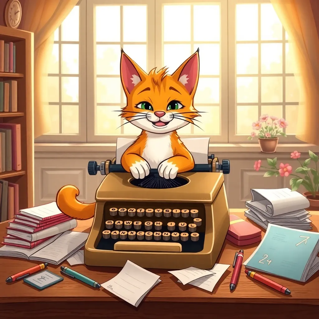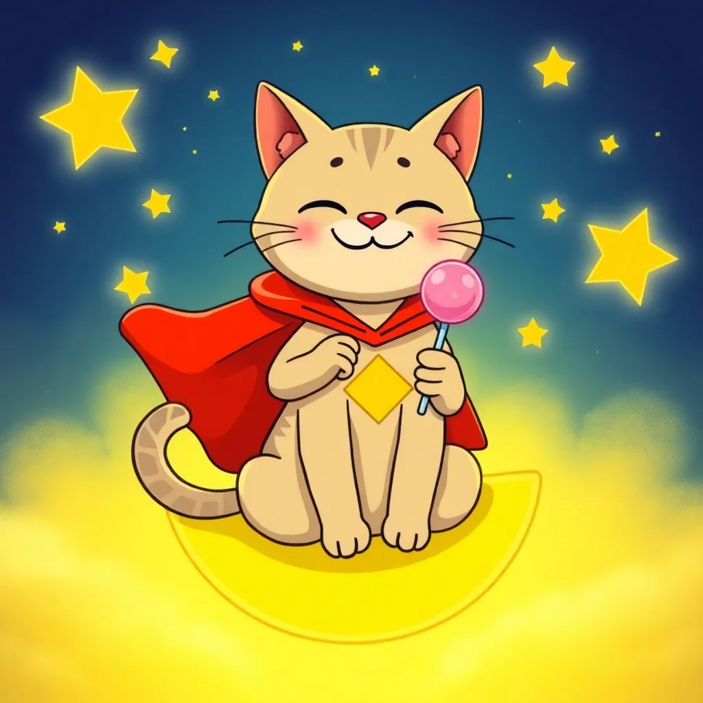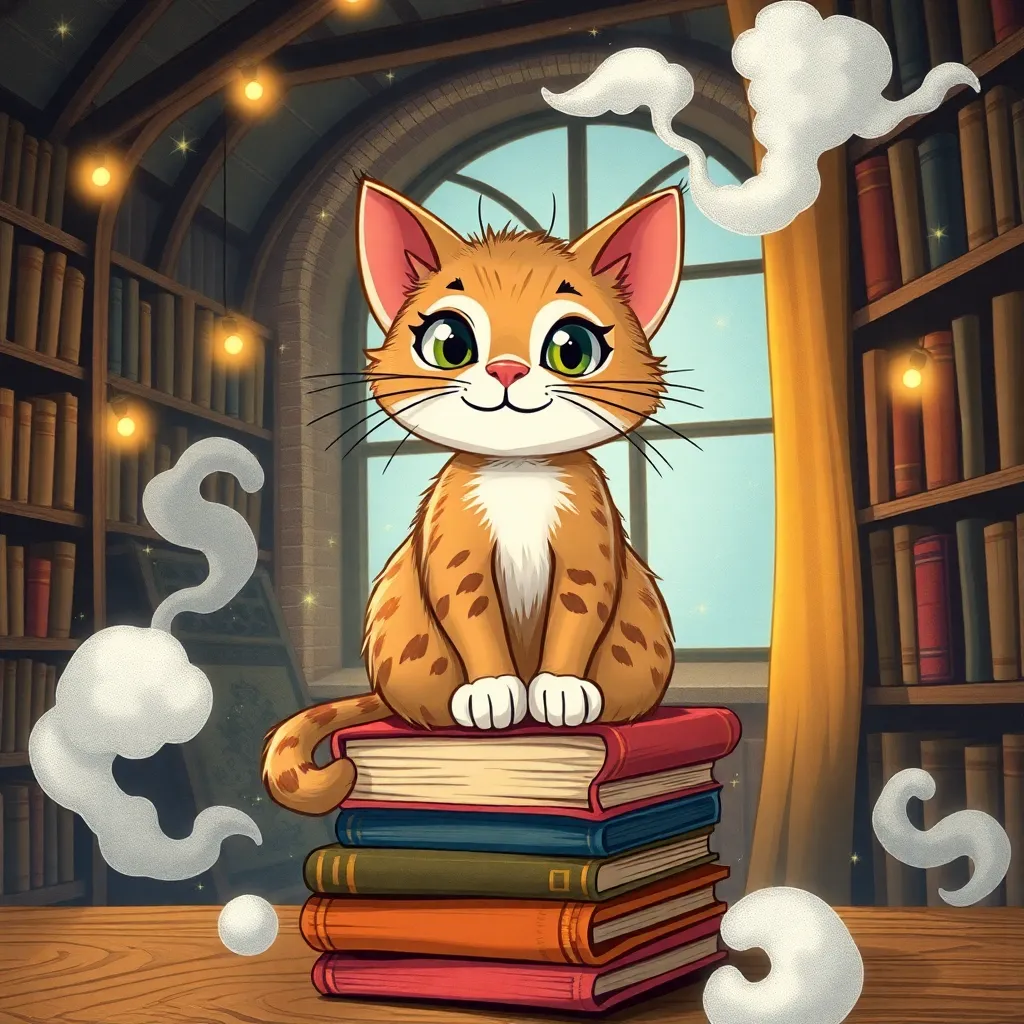 Transform this realistic photo of a smiling cat lounging on a windowsill into a vibrant, exaggerated cartoon character. Add bright colors, bold lines, and playful textures to create a whimsical illustration that captures the cat's carefree spirit. Make the cat's eyes sparkle and its whiskers twitch with joy.