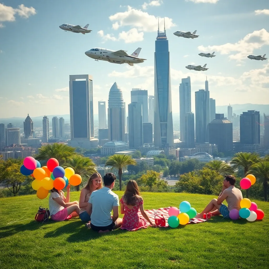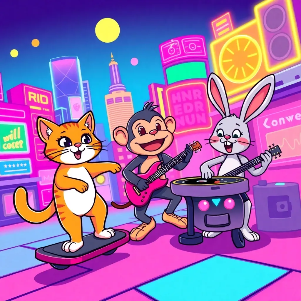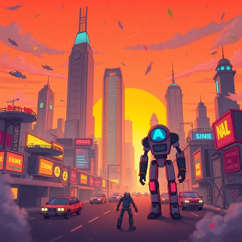 Create a whimsical cartoon of a futuristic cityscape at sunset, featuring towering skyscrapers, flying cars, and a giant robot walking through the streets, surrounded by vibrant neon lights and a warm orange glow. Incorporate fun and playful elements, such as puffs of smoke and confetti, to add to the excitement.