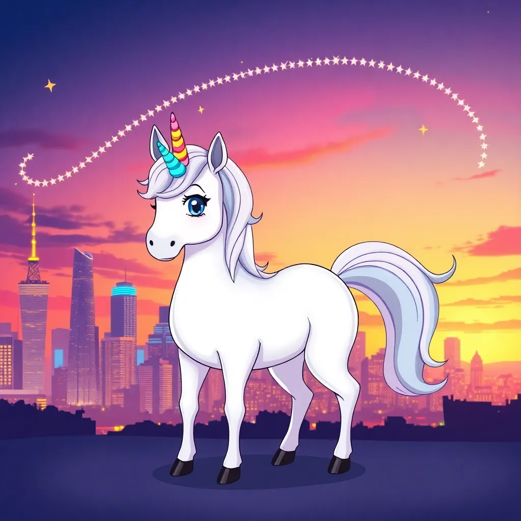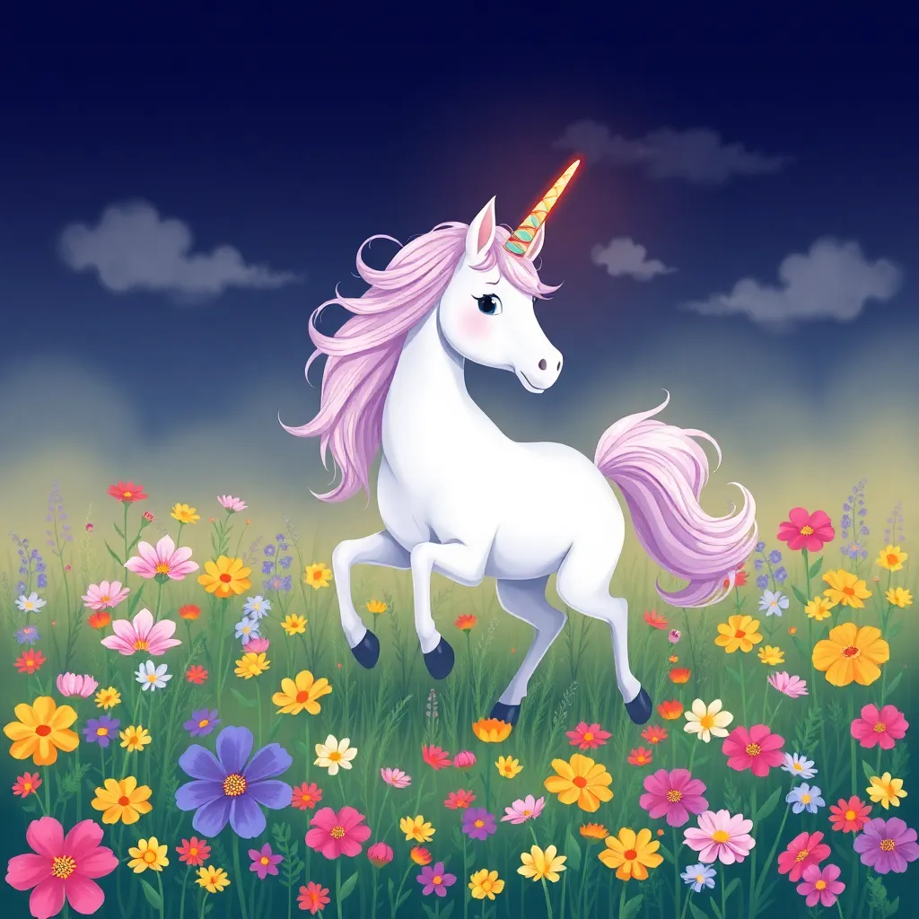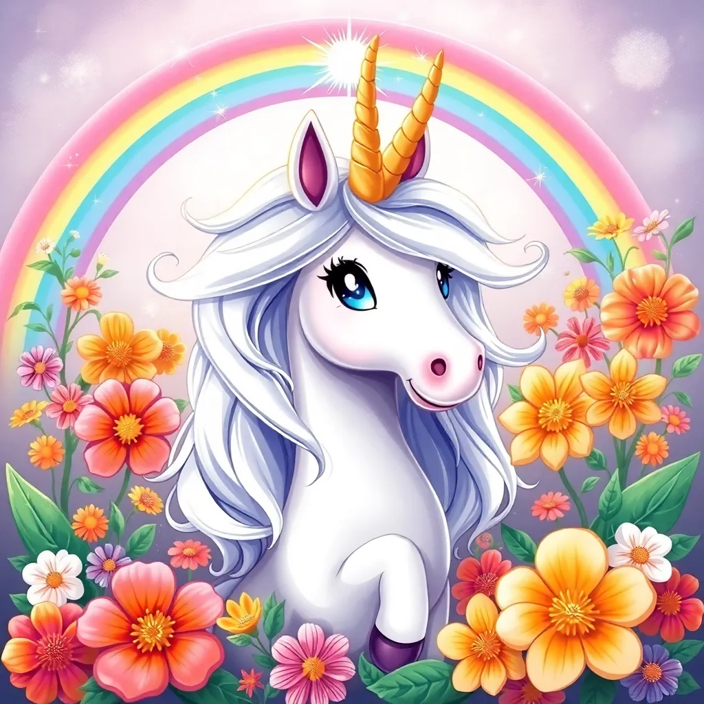 Create a whimsical cartoon of a majestic unicorn surrounded by a swirl of colorful flowers, with a sparkling rainbow arching above its head. The unicorn's mane should be flowing in the wind, and its eyes should shine with a warm, gentle light. Incorporate subtle textures and shading for added depth.