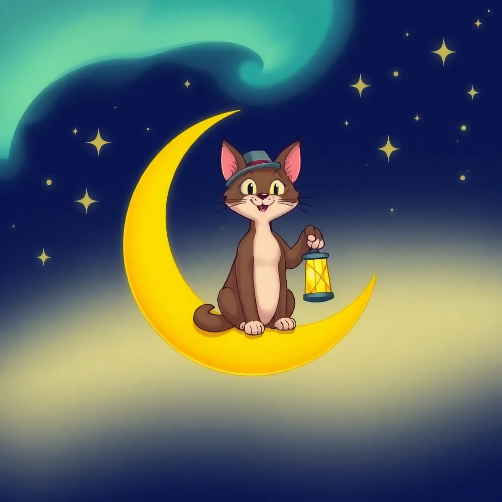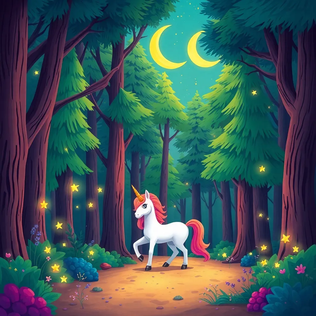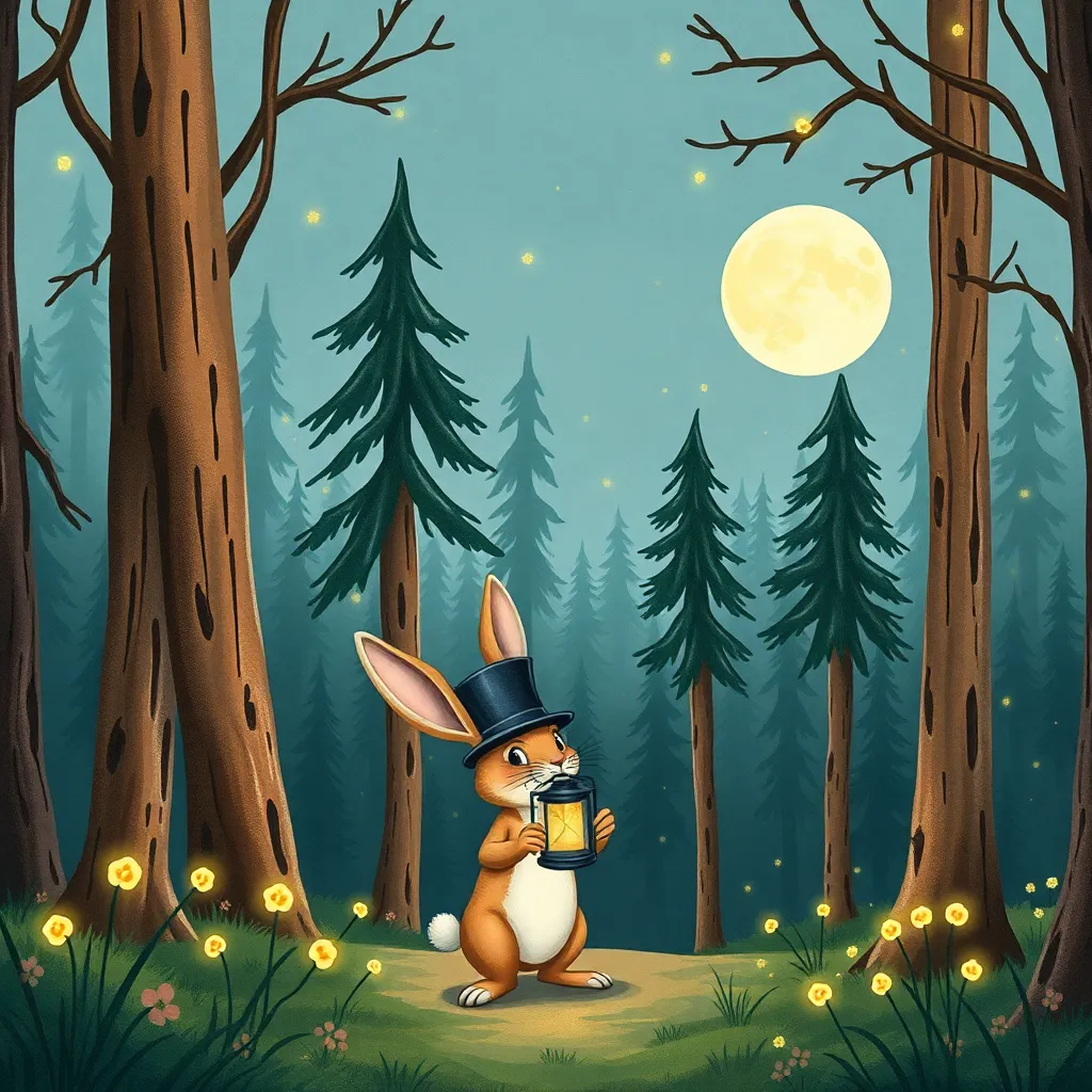 Transform a vintage-style illustration of a whimsical forest, featuring a curious rabbit wearing a top hat and holding a lantern, surrounded by towering trees, twinkling fireflies, and a full moon shining down. The cartoon should have a playful, watercolor-inspired aesthetic with bold lines and soft colors.