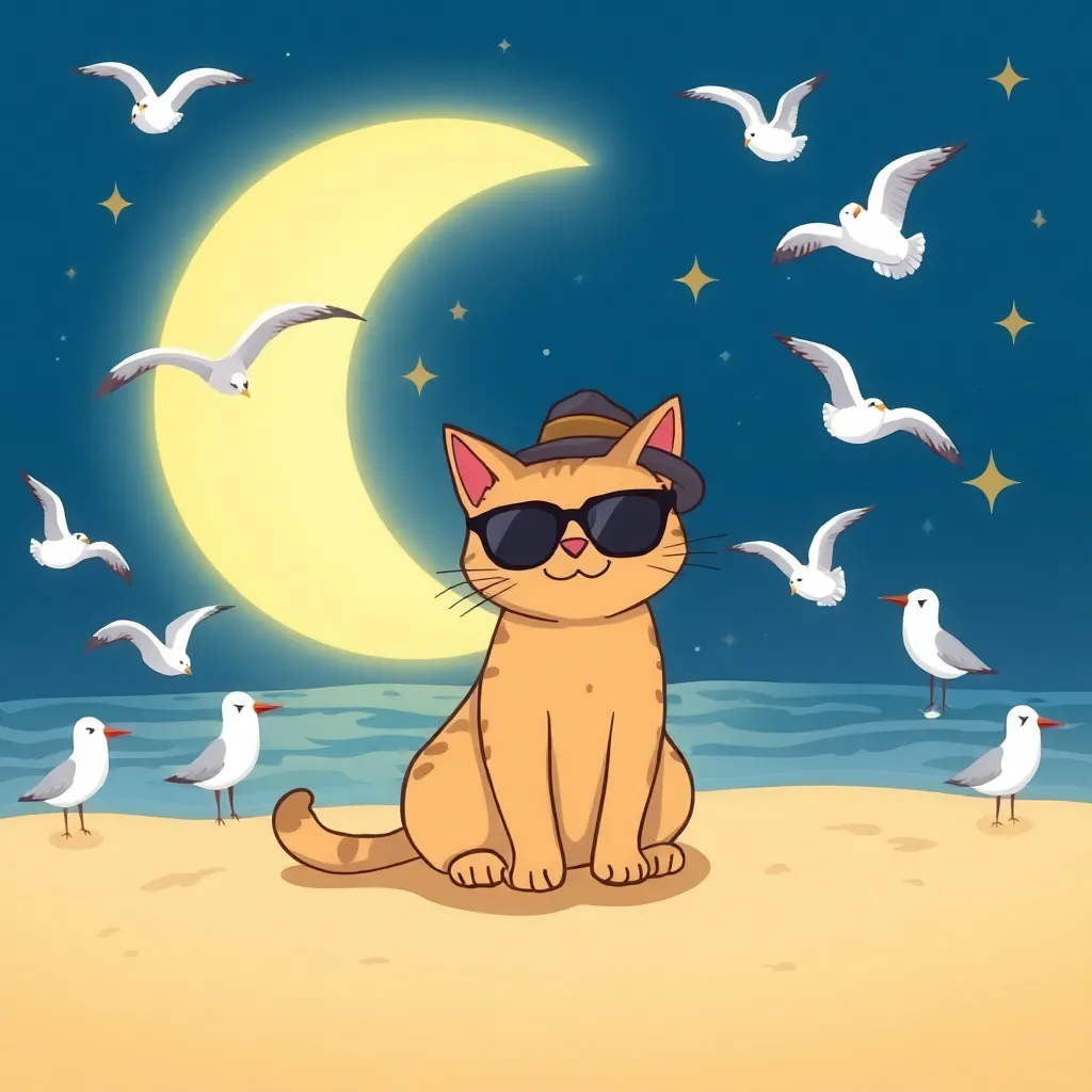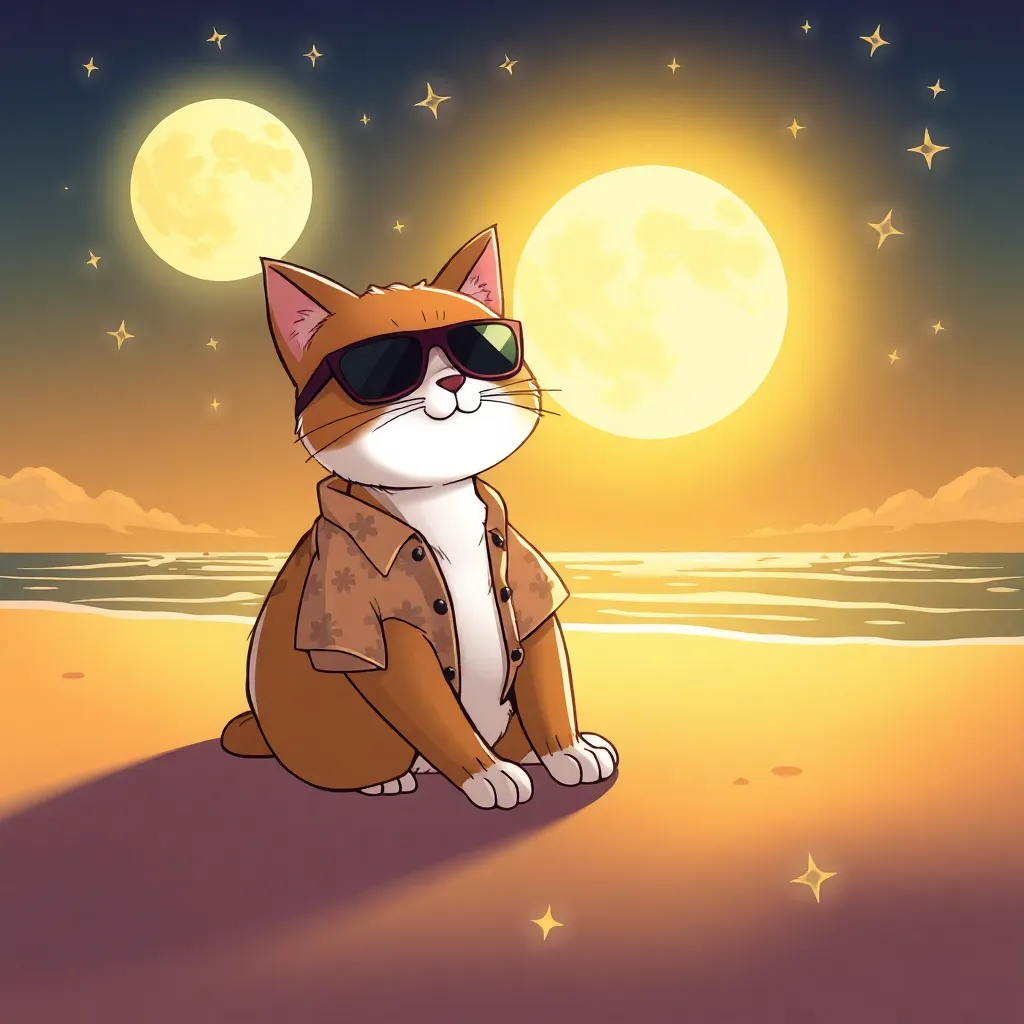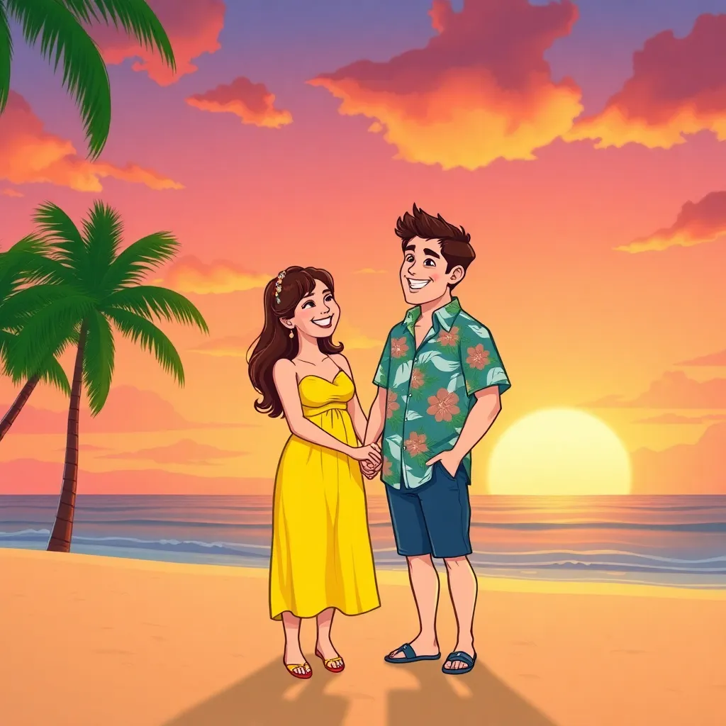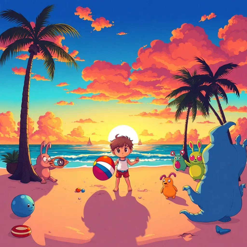 Transform a nostalgic summer sunset scene into a whimsical cartoon. Imagine a carefree child playing with a beach ball on the shore, surrounded by vibrant cartoon characters and fantastical creatures. Incorporate bright colors, exaggerated features, and playful textures to bring this idyllic scene to life.