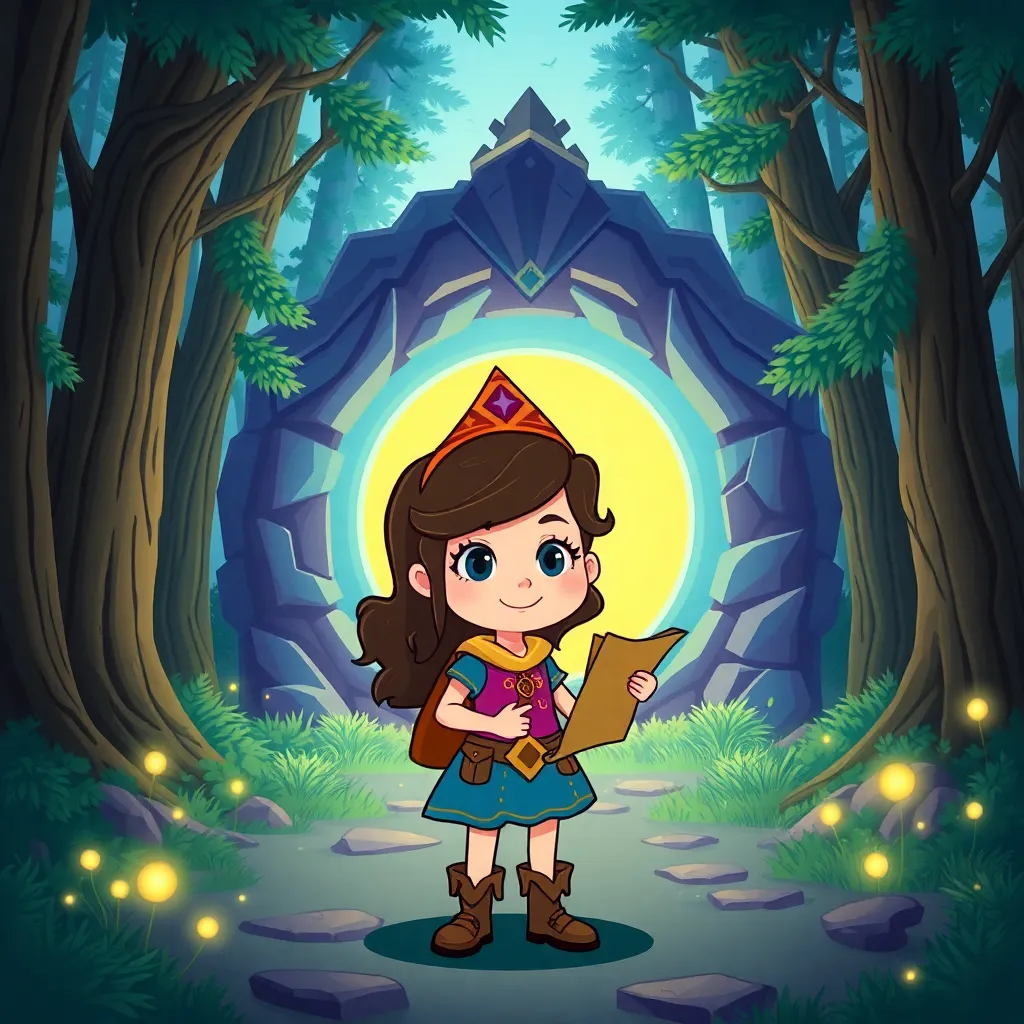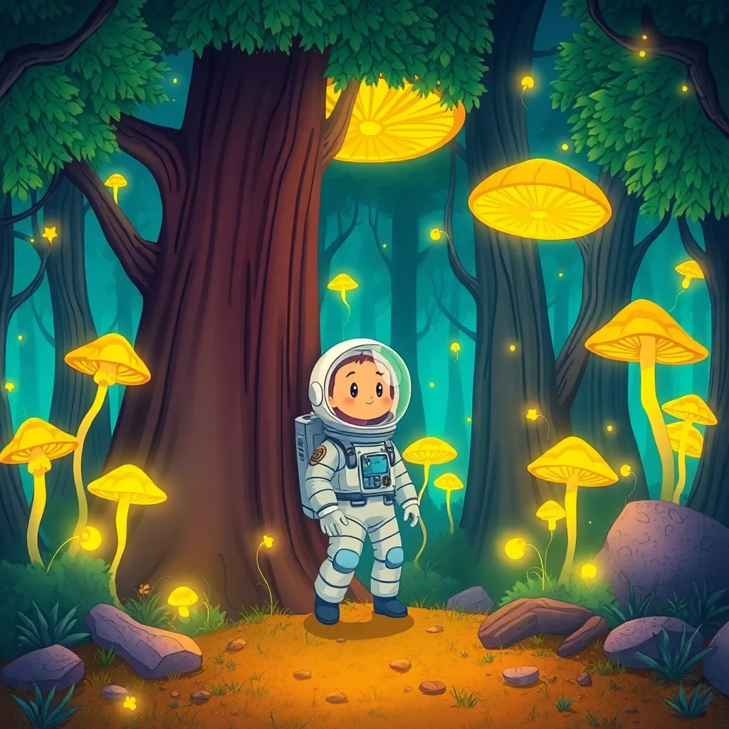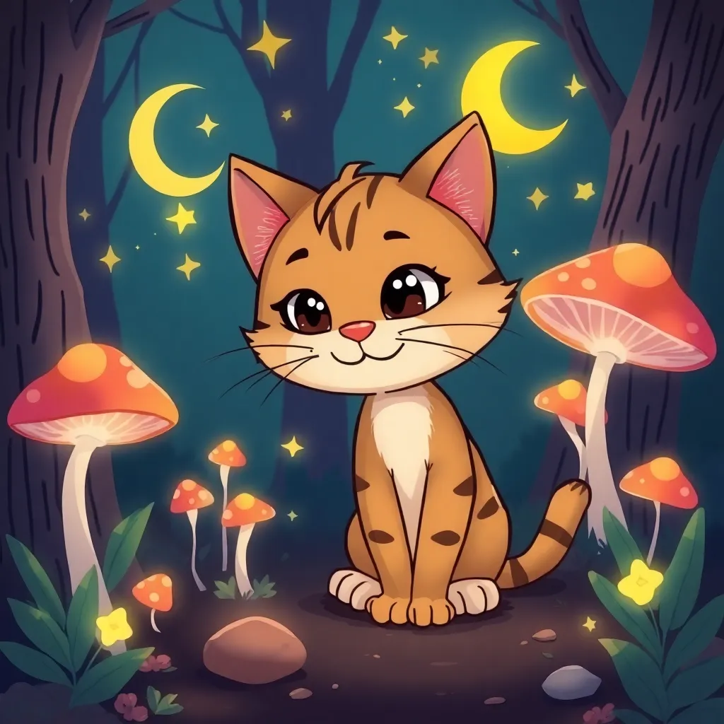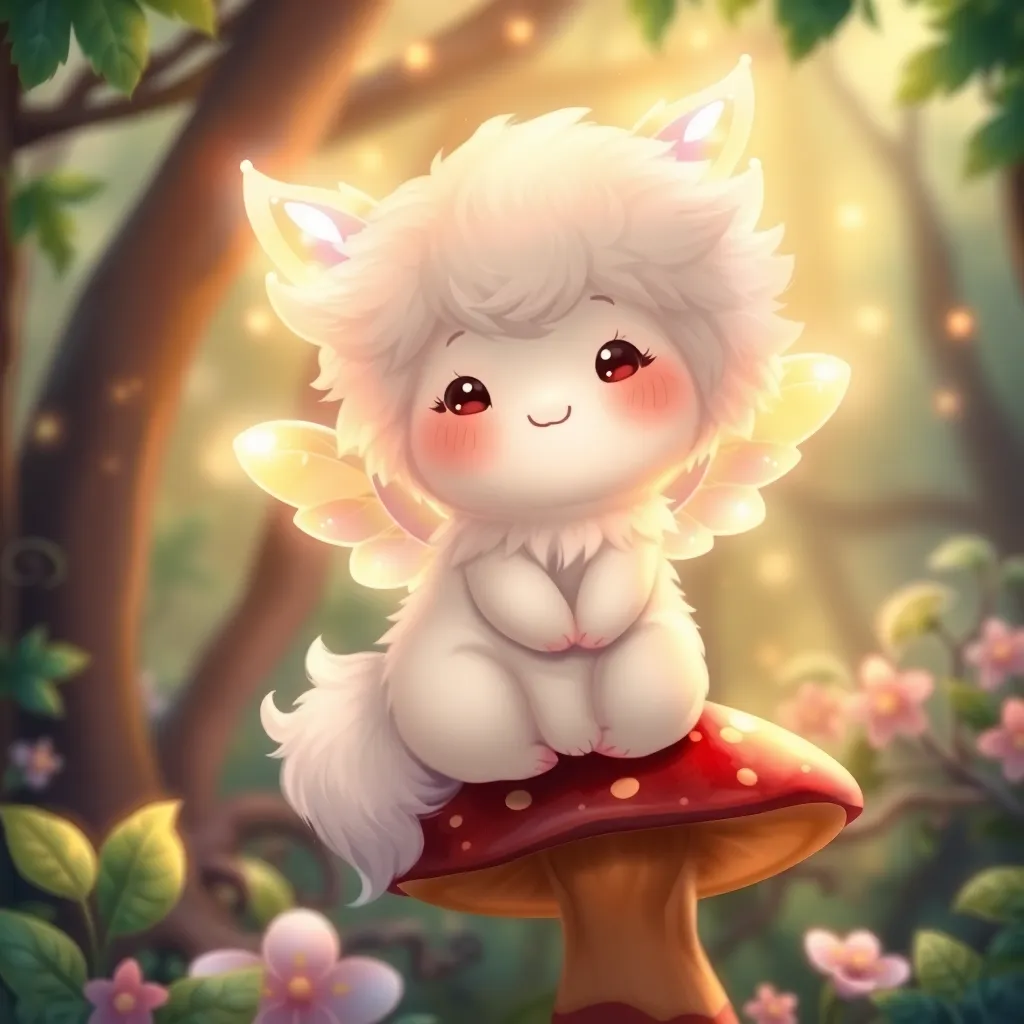 Create a whimsical cartoon character inspired by a magical forest. Imagine a gentle, fluffy creature with iridescent wings, surrounded by a halo of soft, shimmering lights. The creature should be sitting on a toadstool, with a subtle smile and twinkling eyes, amidst a backdrop of vibrant, swirling forest foliage.