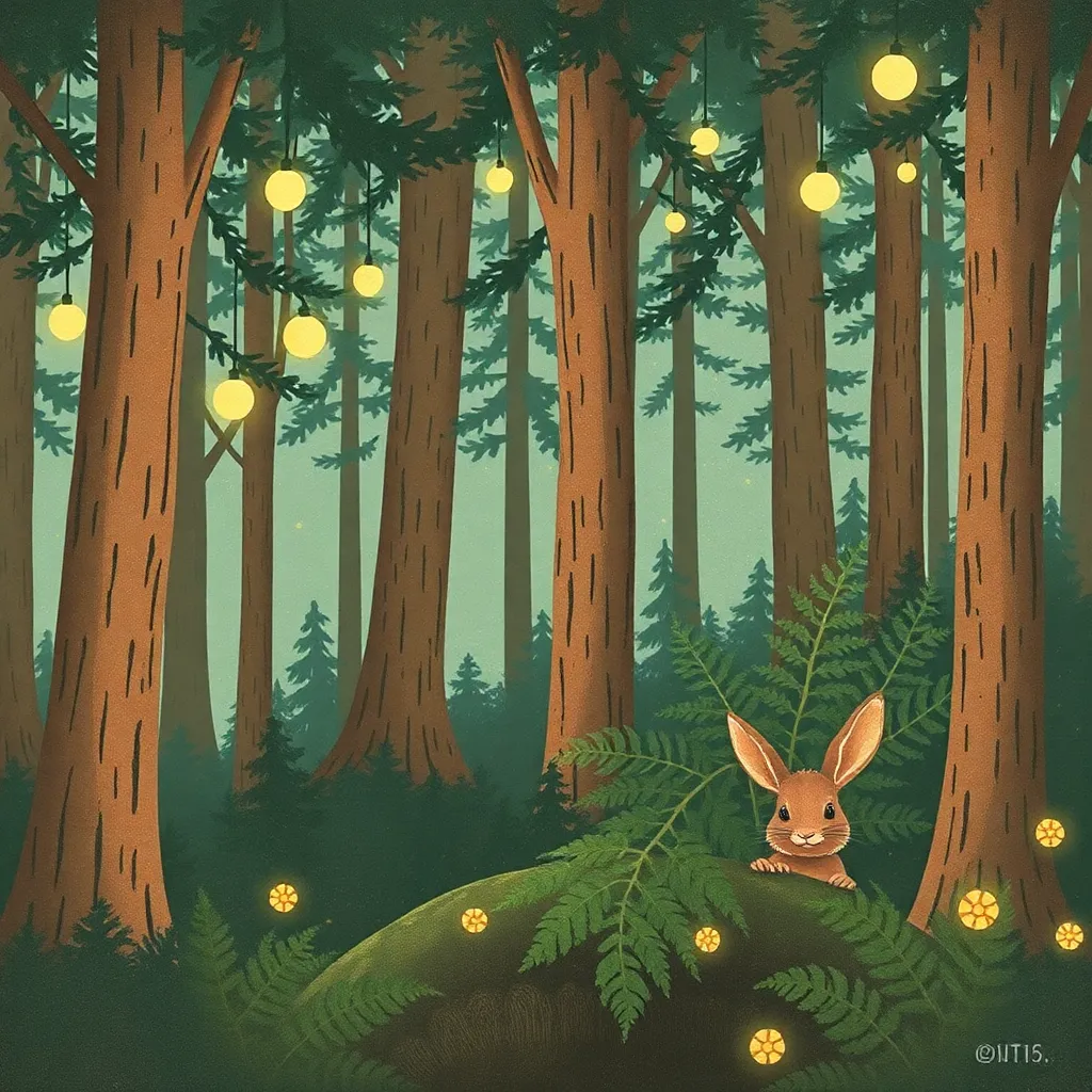 Transform a vintage-style illustration of a whimsical forest, complete with towering trees, twinkling fireflies, and a curious rabbit peeking out from behind a fern. Incorporate warm, muted colors and subtle textures to evoke a sense of nostalgia and wonder. Blend realistic and fantastical elements for a unique, dreamlike atmosphere.