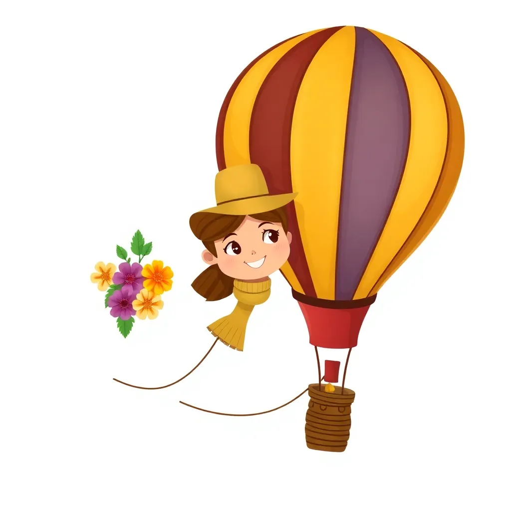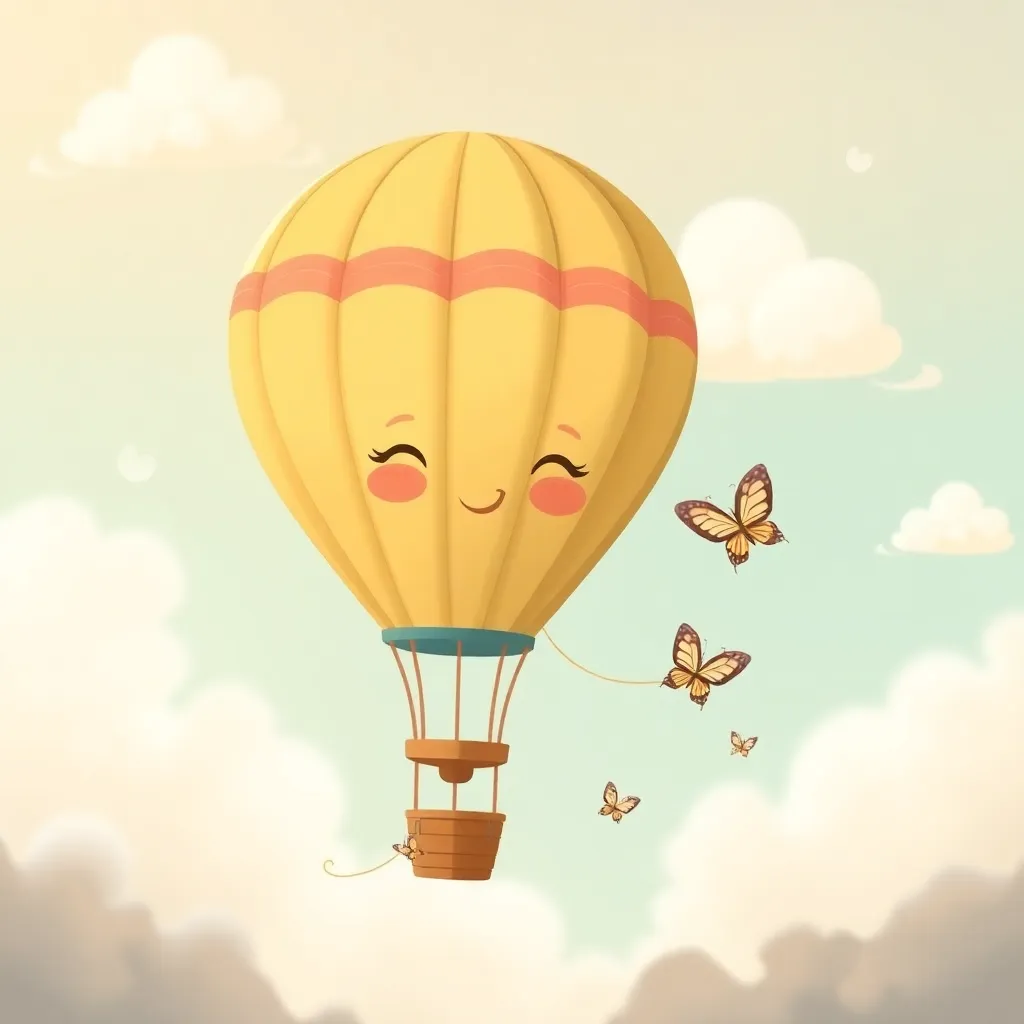 Create a whimsical cartoon character inspired by a vintage-style hot air balloon ride. Imagine a charming, anthropomorphic balloon with a smiling face, colorful stripes, and a trail of fluttering butterflies following behind. Incorporate a dreamy, pastel-colored sky with puffy white clouds and a few wispy strands of mist.