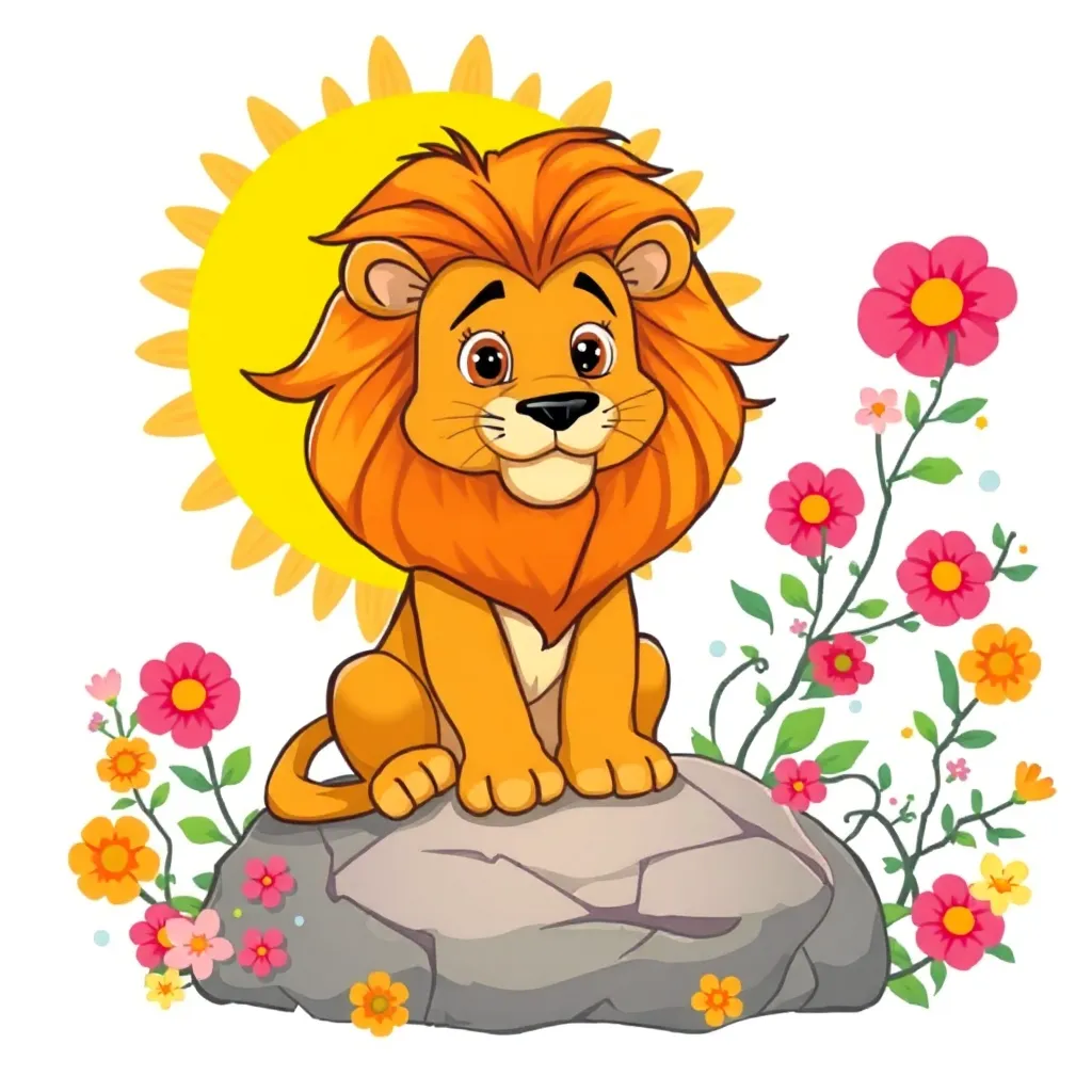 Create a whimsical cartoon illustration of a majestic lion sitting on a sunny rock, surrounded by a burst of colorful flowers and vines. The lion's mane should be flowing in the wind, and its eyes should sparkle with a warm, friendly glow. Incorporate textures and patterns to add depth and visual interest.