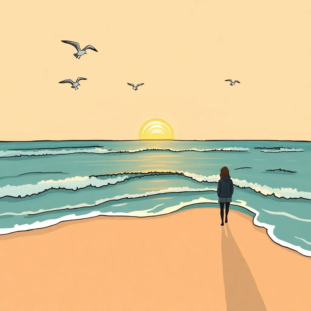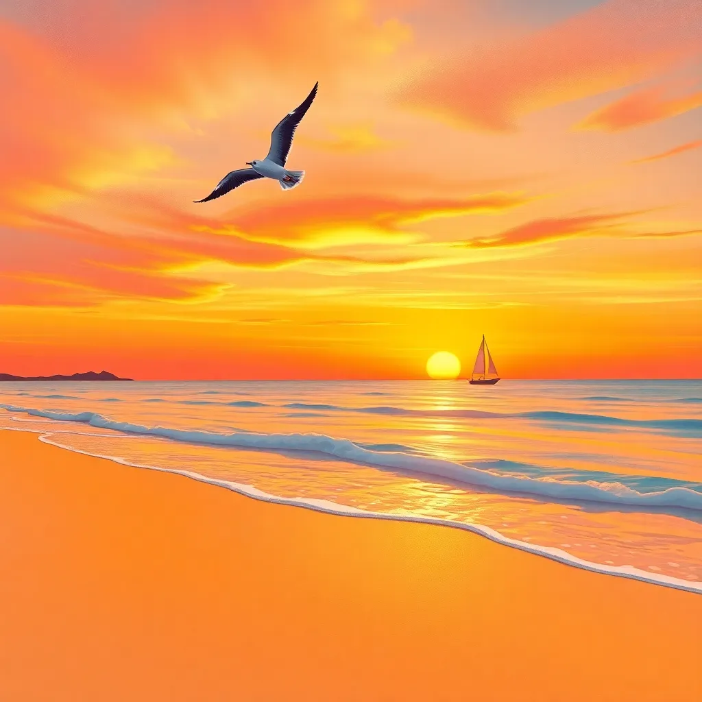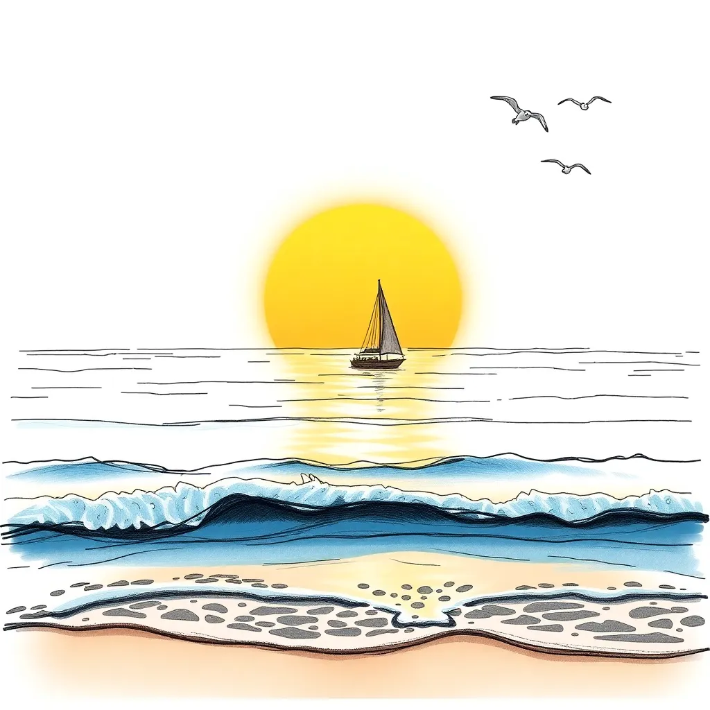 Create a stunning sketch of a serene ocean sunset, with gentle waves lapping against the shore. Include a majestic sailboat gliding across the horizon, surrounded by a warm orange glow. Incorporate subtle wisps of sea foam and a few seagulls flying overhead, capturing the peaceful atmosphere of a summer evening.