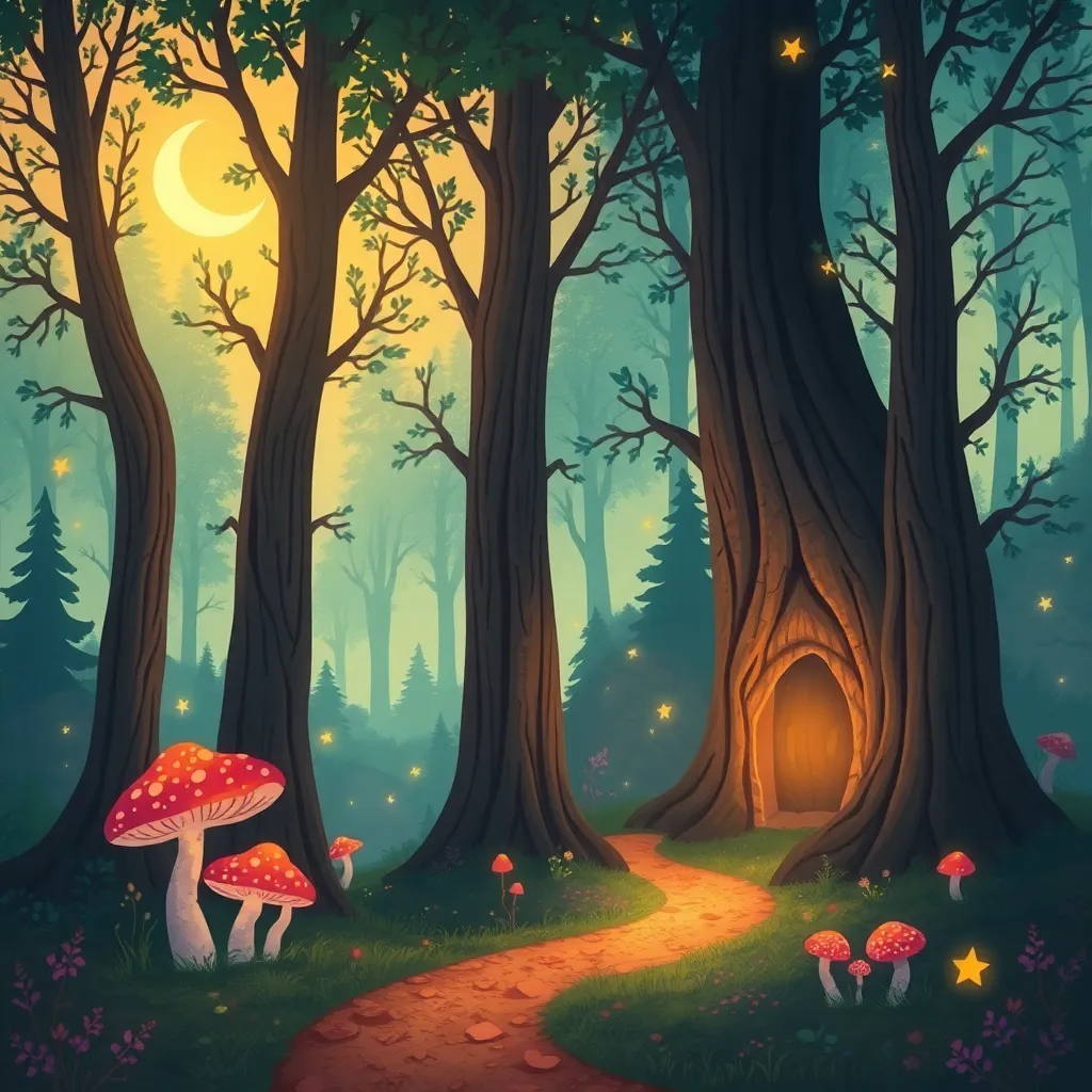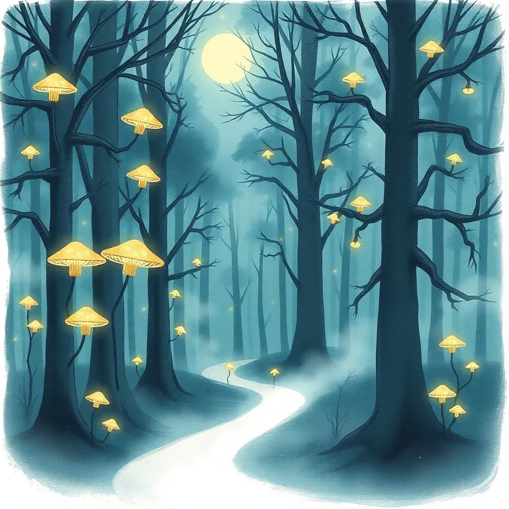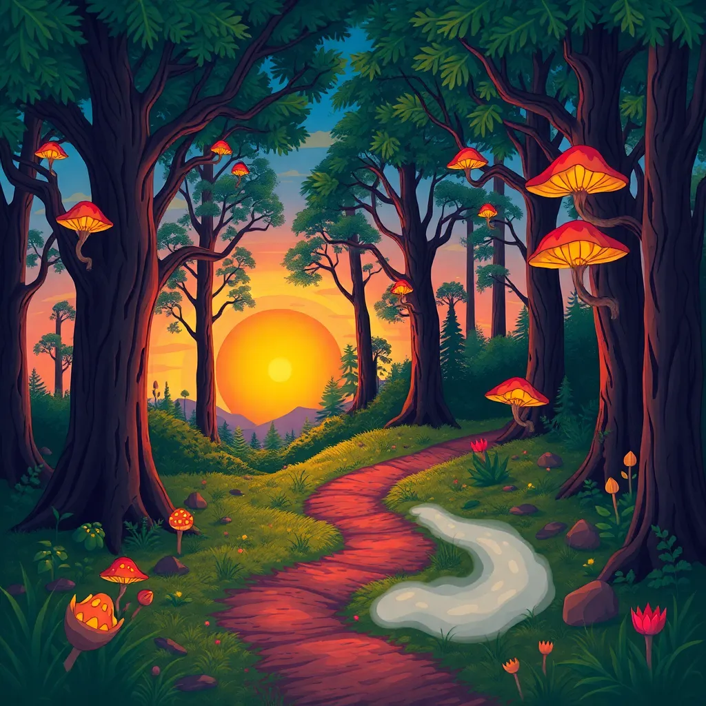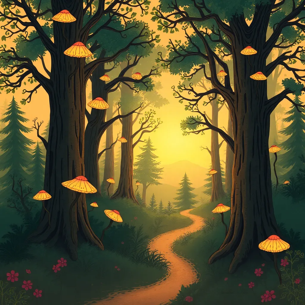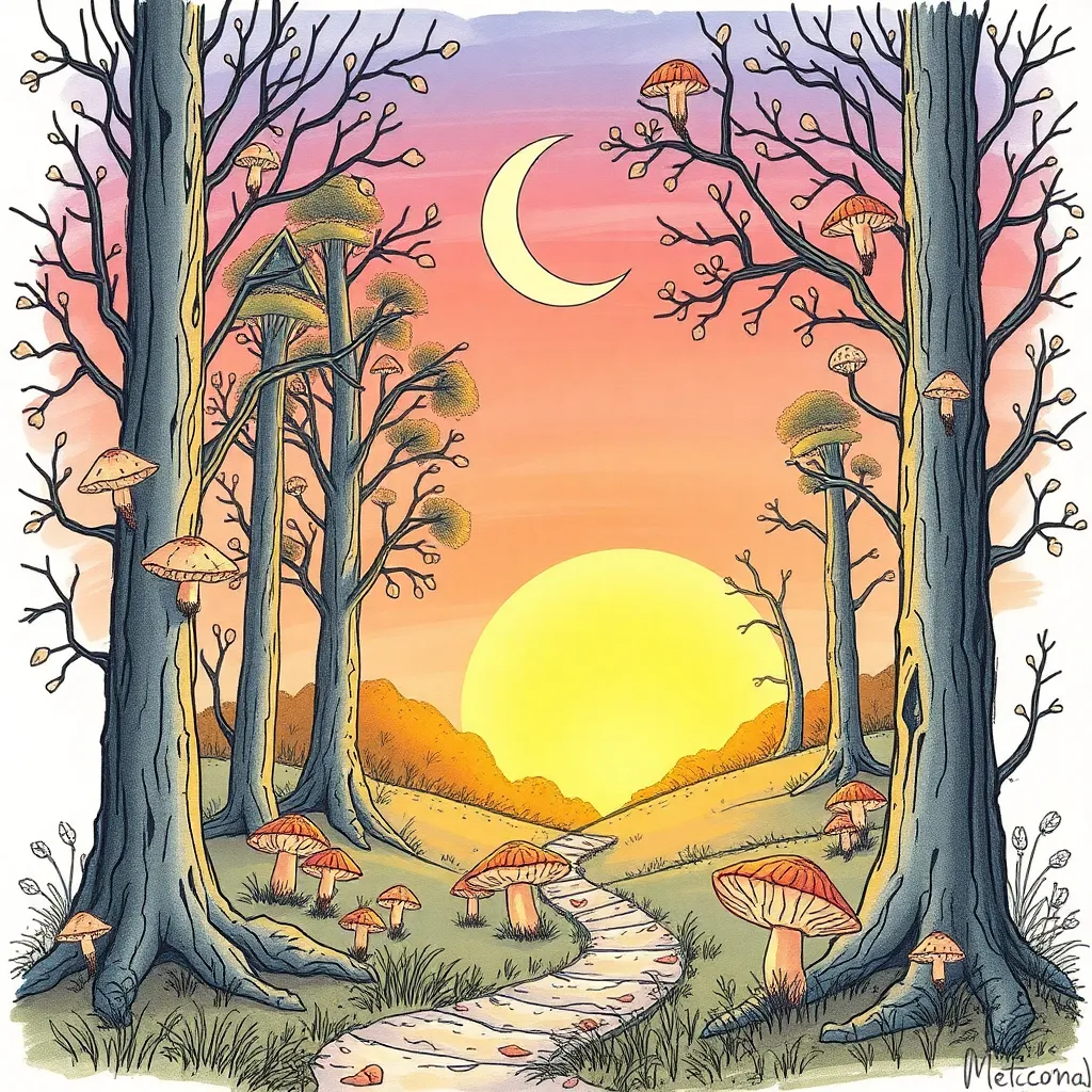 Create a whimsical illustration of a mystical forest at sunset, with towering trees, glowing mushrooms, and a winding path that disappears into the mist. Incorporate subtle magical sparks and a crescent moon peeking through the canopy. The atmosphere should be dreamy and enchanting, inviting the viewer to step into the scene.