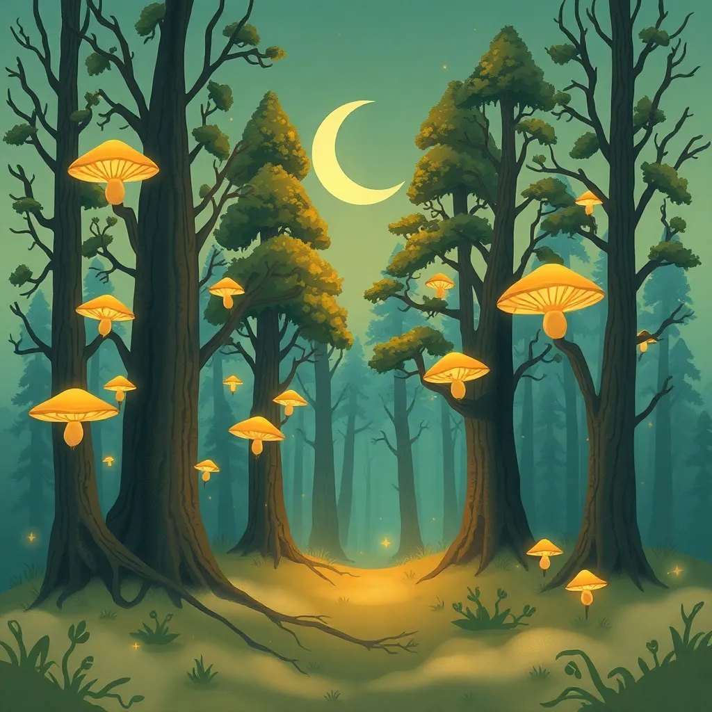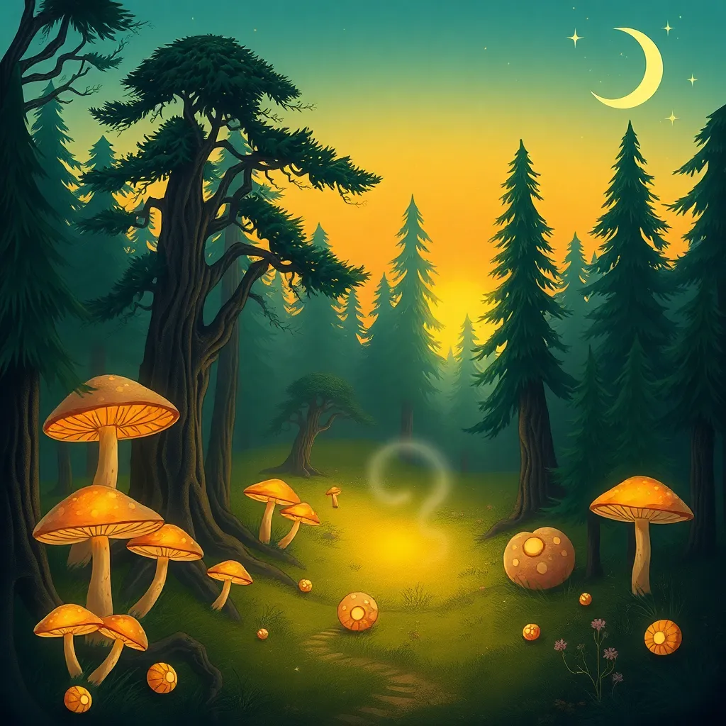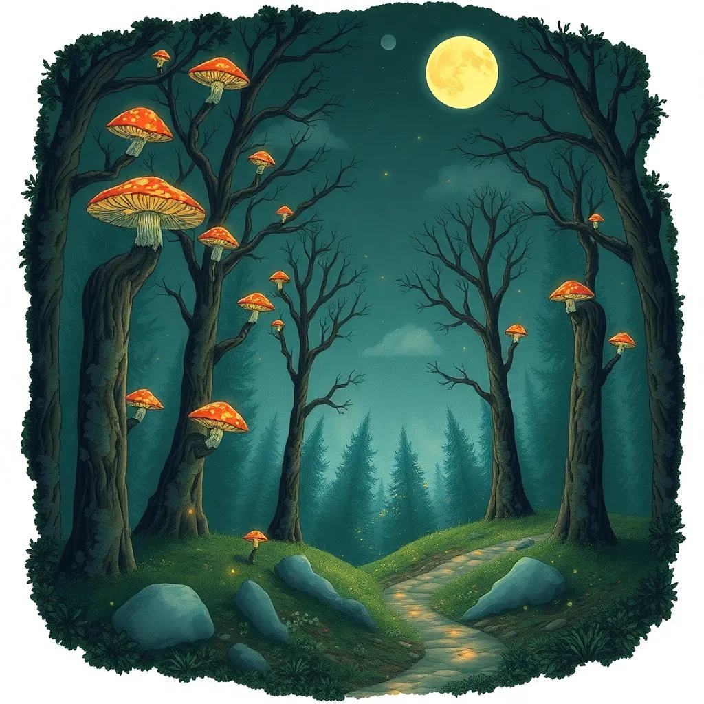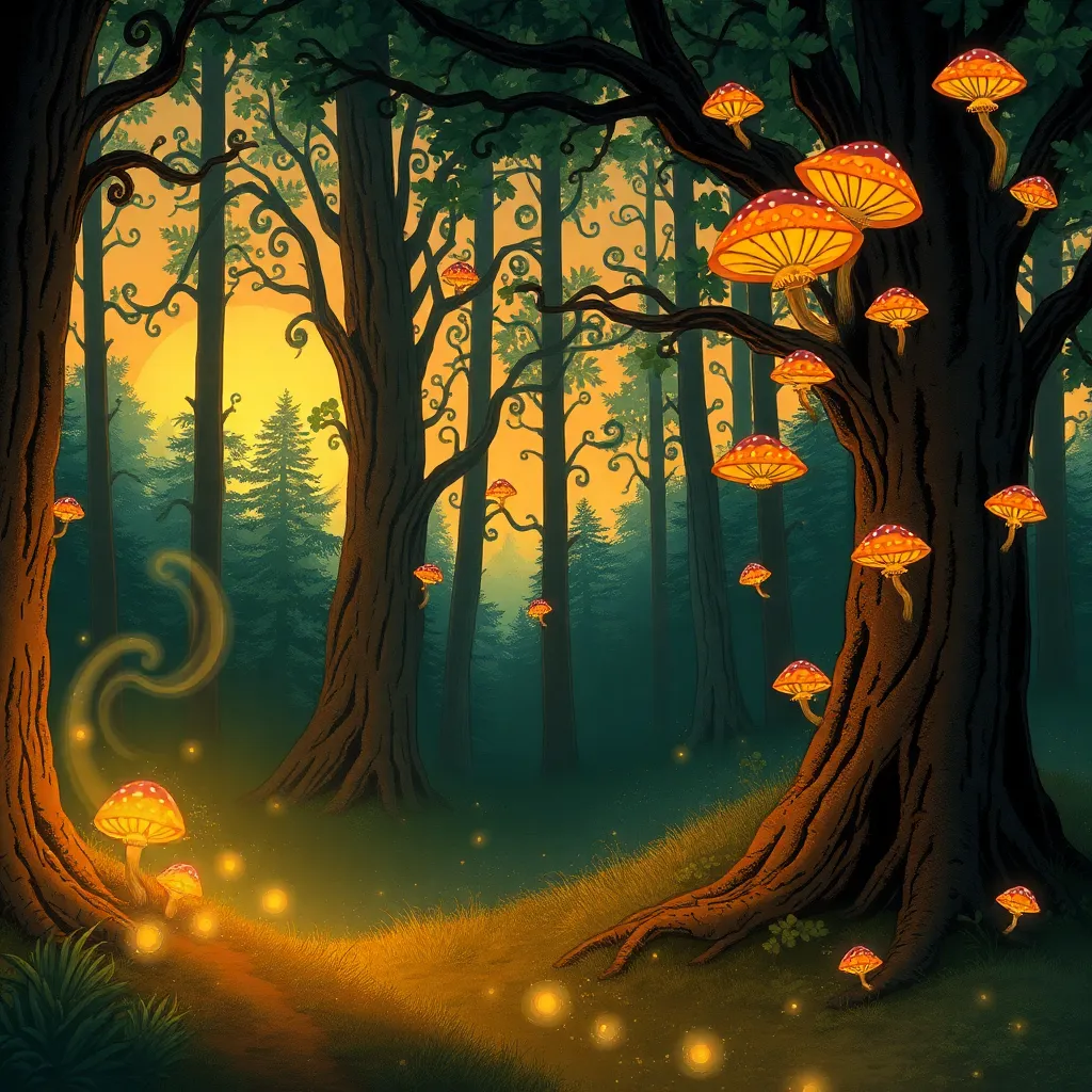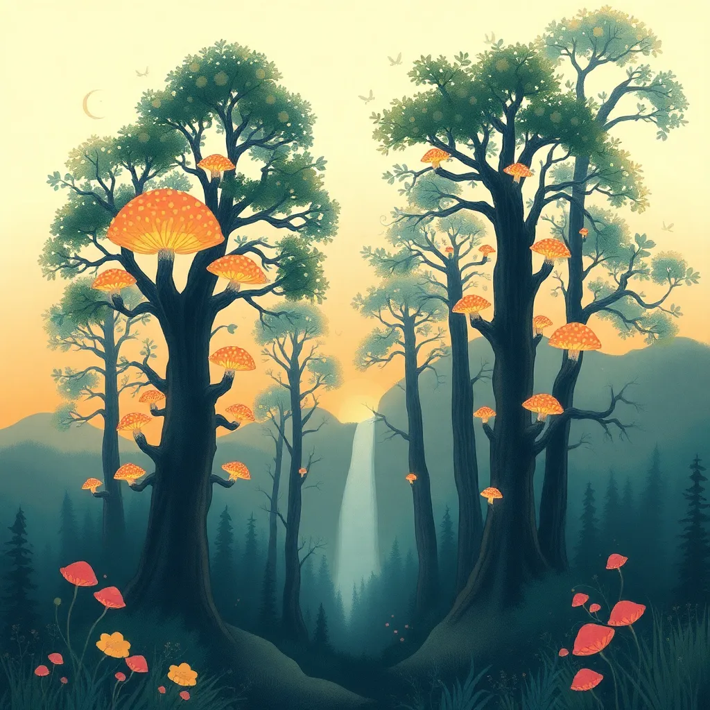 Create a whimsical illustration of a mystical forest at sunset, with towering trees, glowing mushrooms, and a winding path that disappears into the mist. Incorporate subtle magical sparks and a crescent moon peeking through the canopy. The atmosphere should be dreamy and enchanting, inviting the viewer to step into the scene.